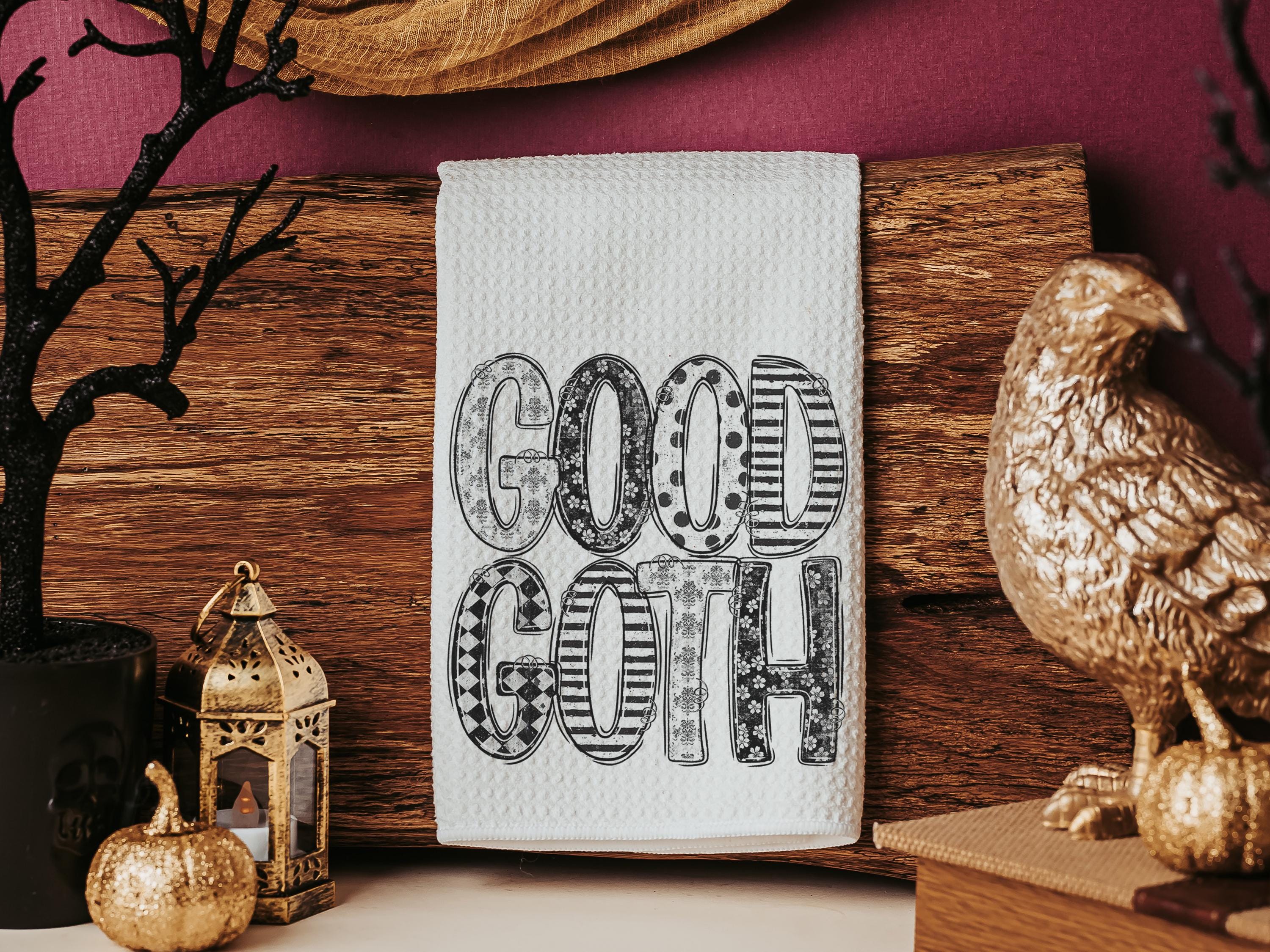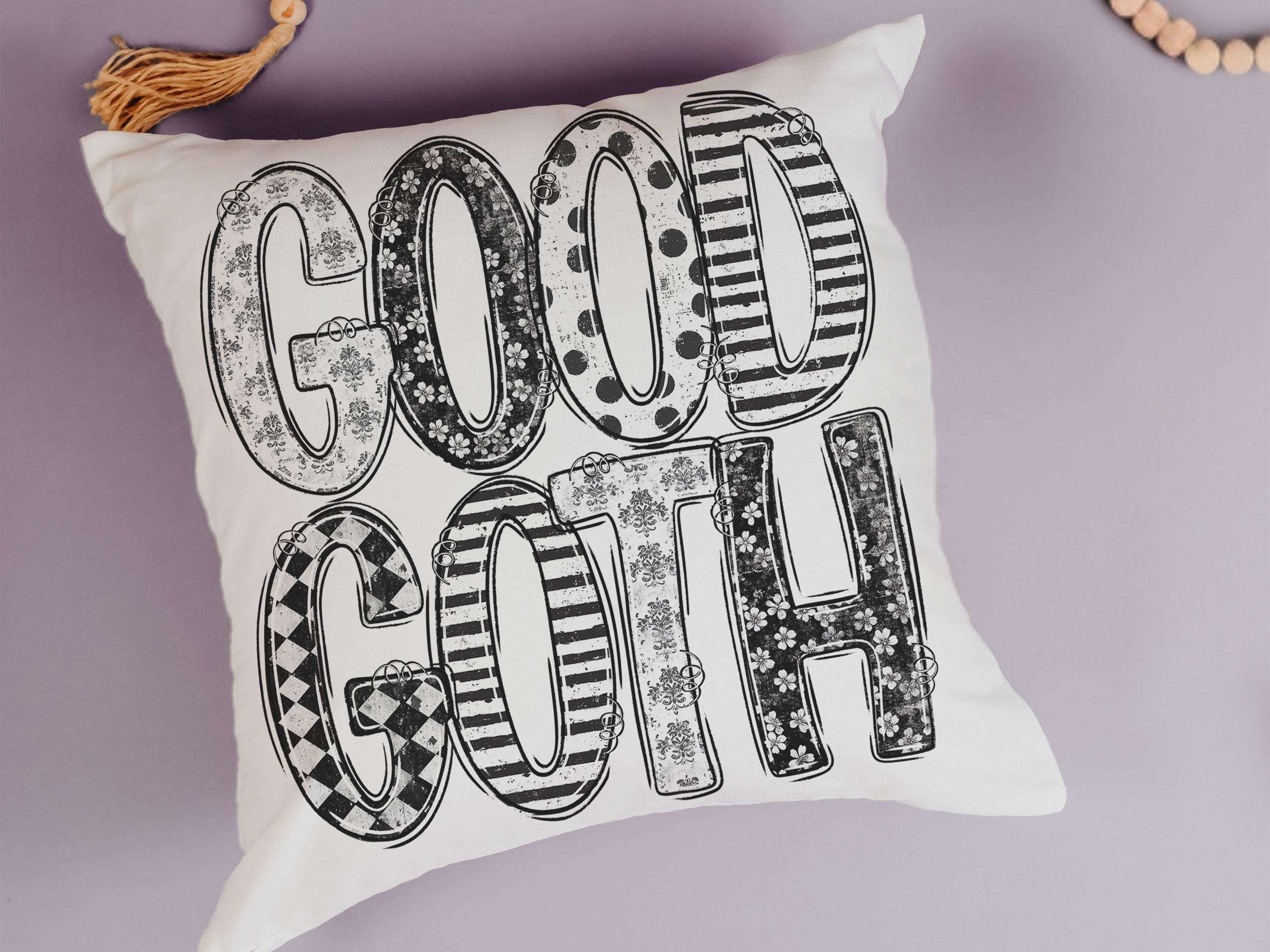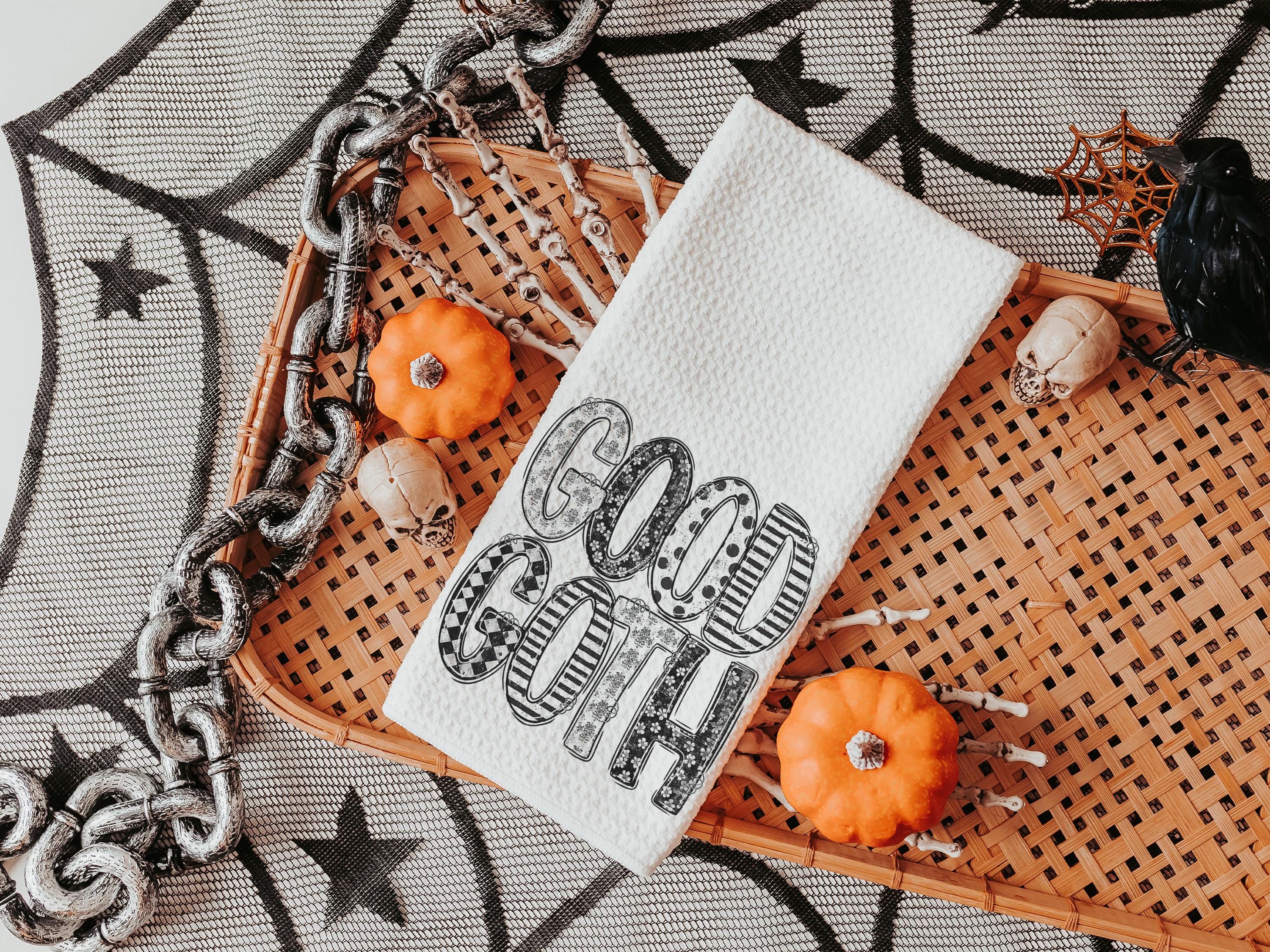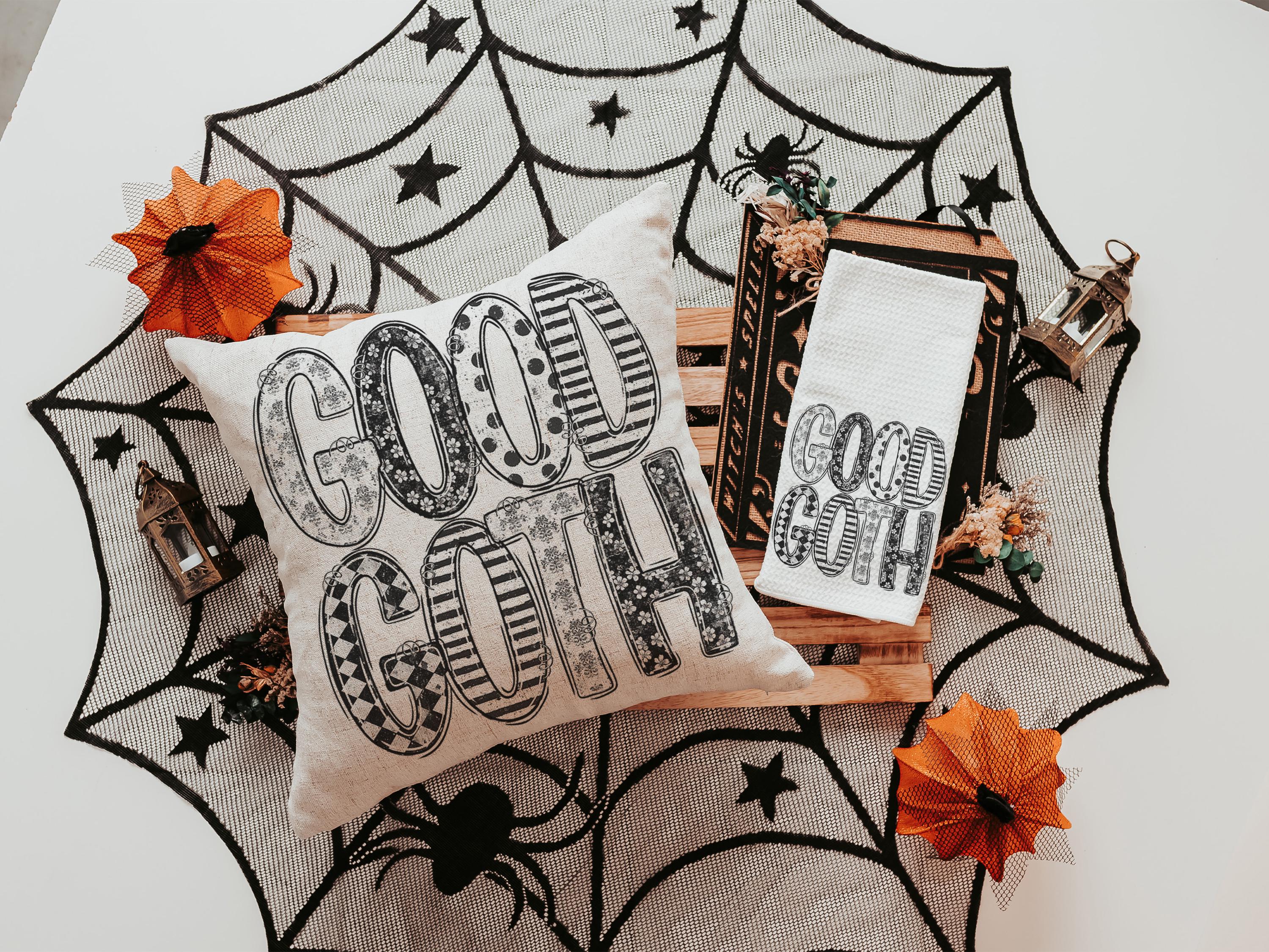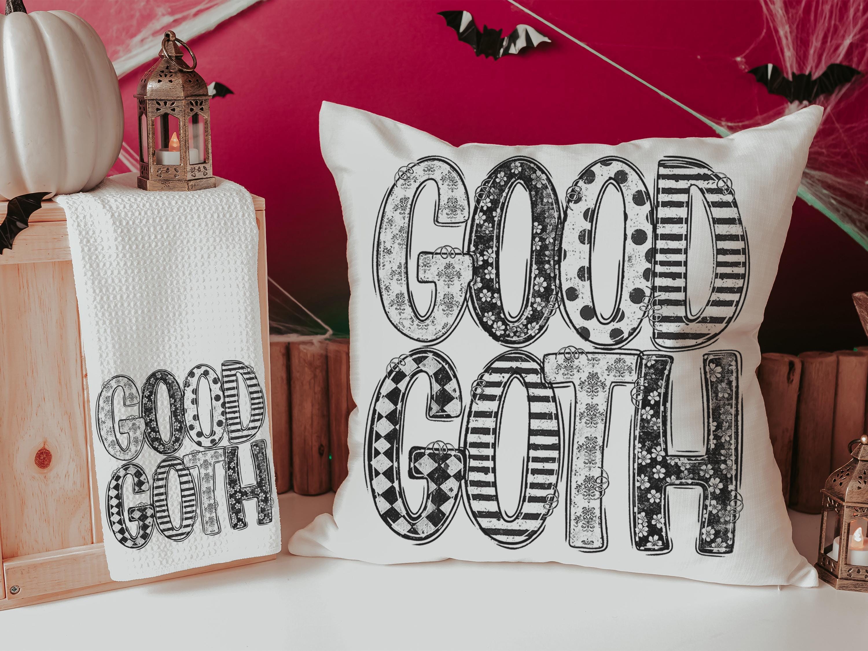 Add a spooky cute touch to Halloween with the a Good Goth design on throw pillows and matching towels. Perfect for funny Halloween gifts for adults, coquette-inspired kitchen style, or boo basket surprises for best friends. Available to purchase as decorative pillows or towels, sold separately or as sets.