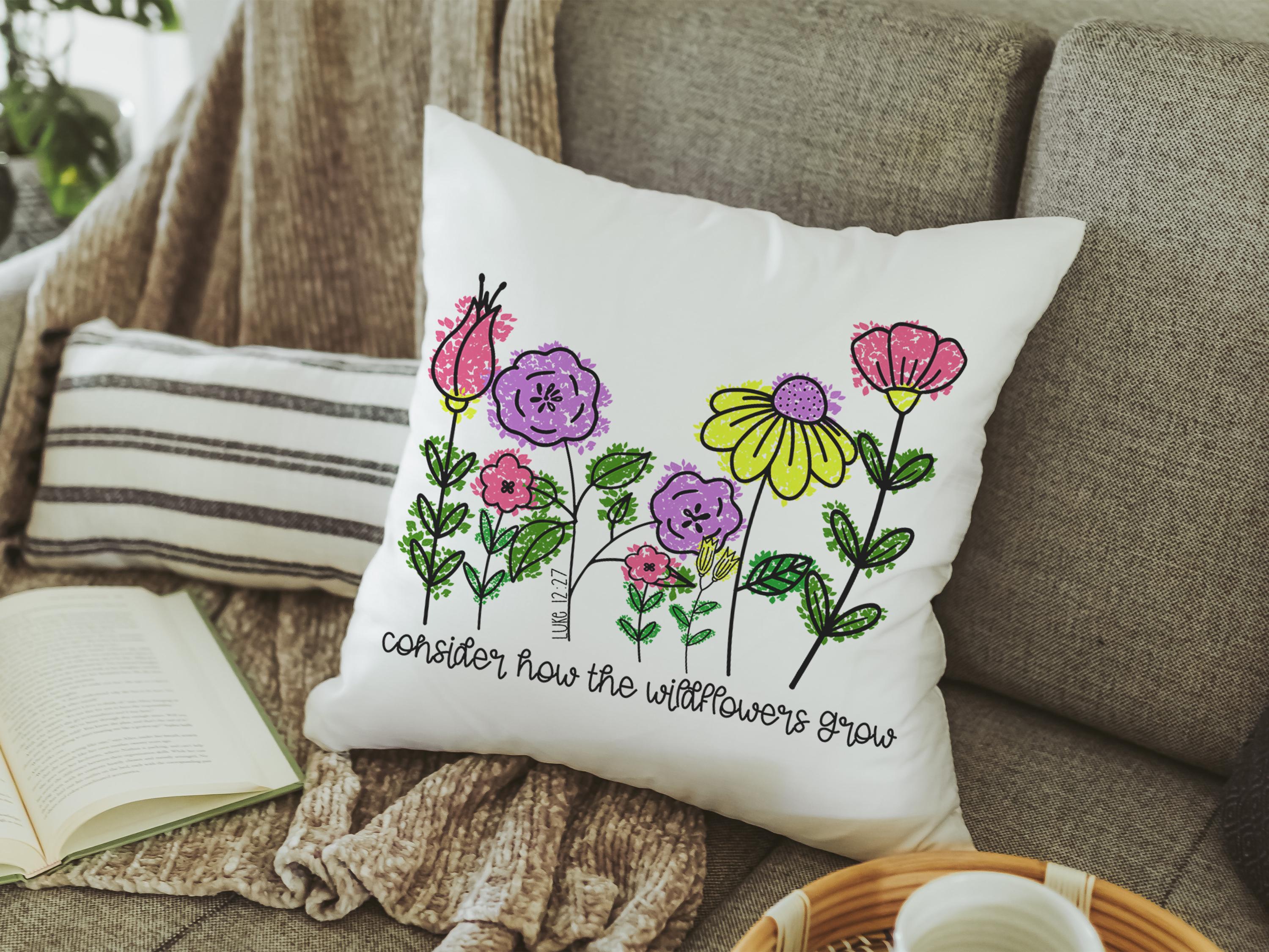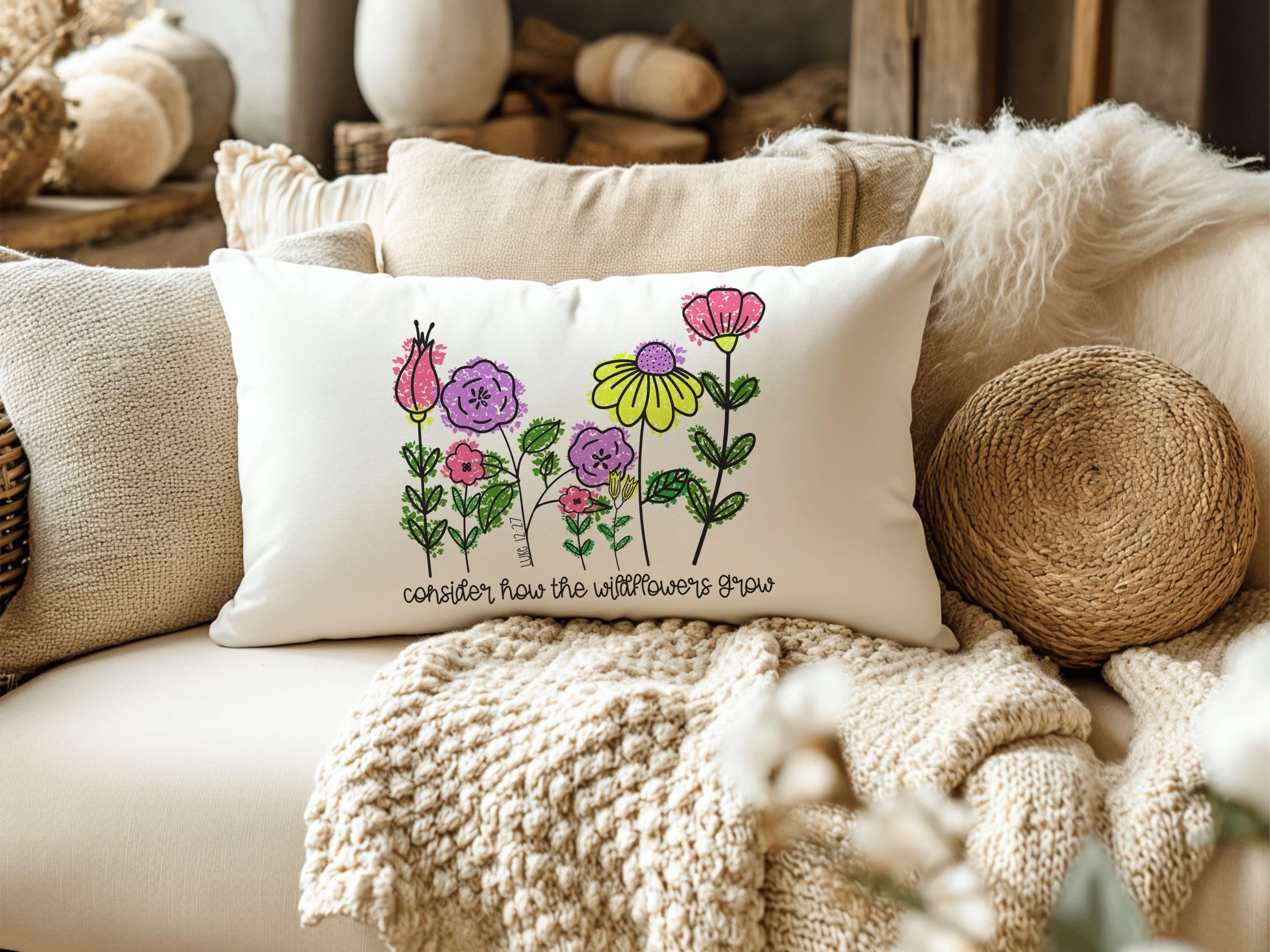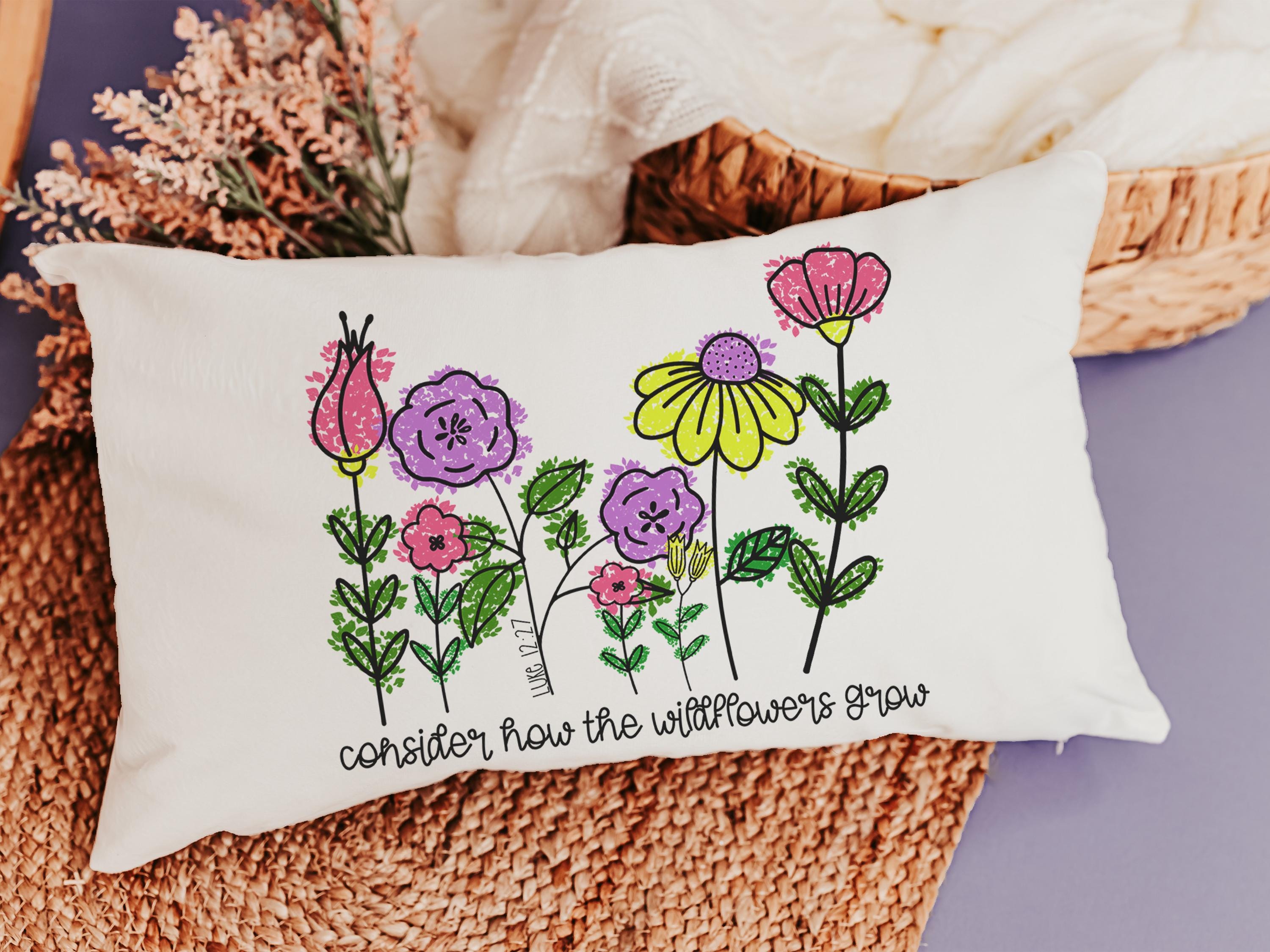 Add faith-filled beauty to your space with Consider How the Wildflowers Grow pillows inspired by Luke 12:27. Perfect for the couch, bedroom, or Christian nursery, these floral decorative pillows make meaningful Bible verse gifts for women and girls. Available in two sizes: 12x20 or 18x18.