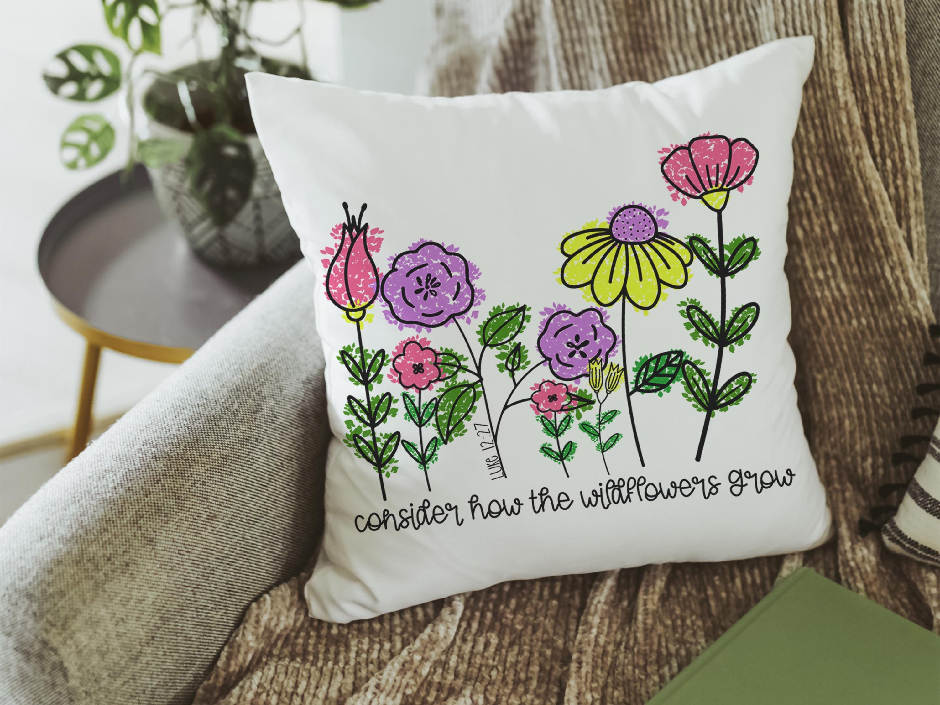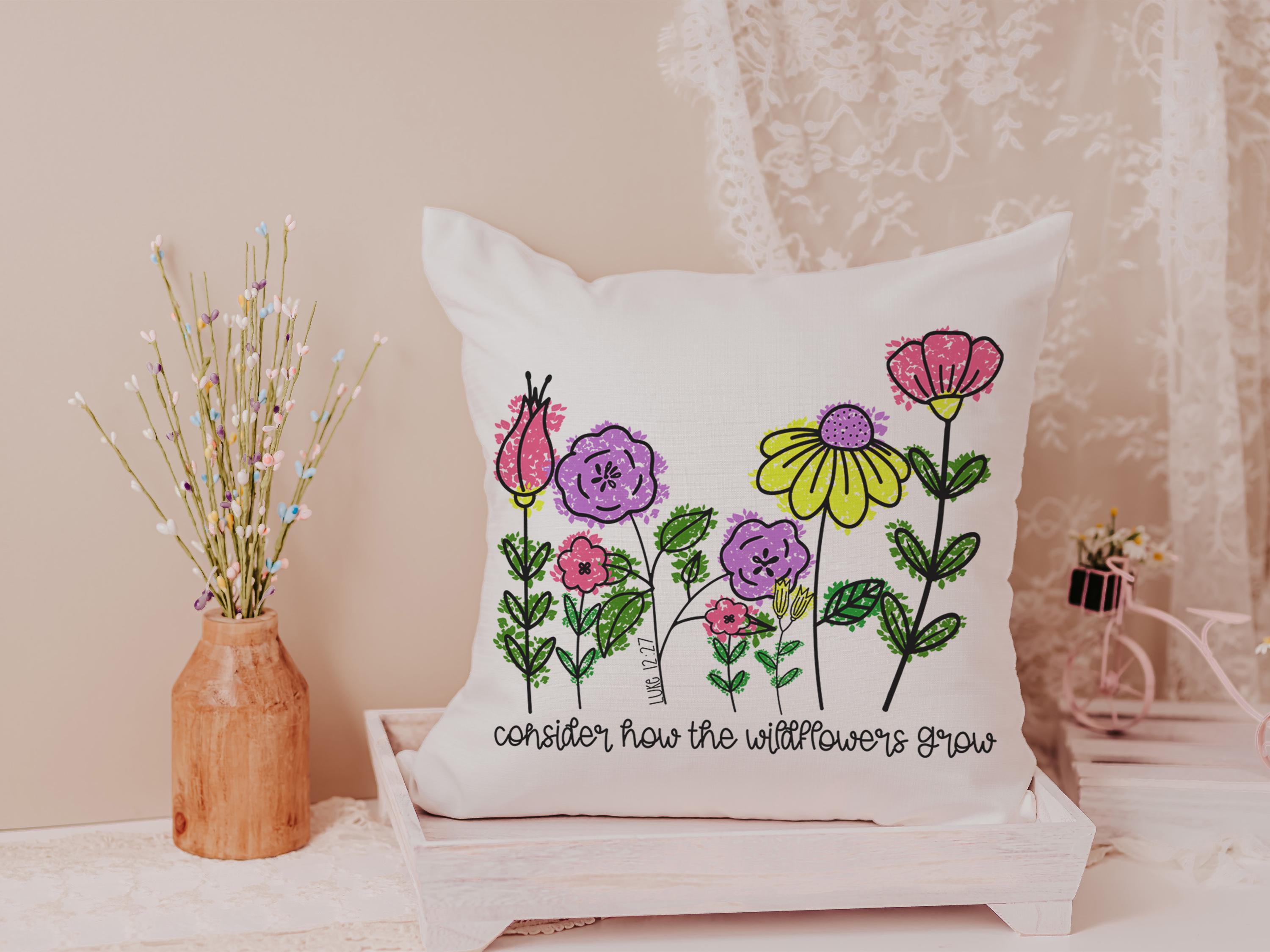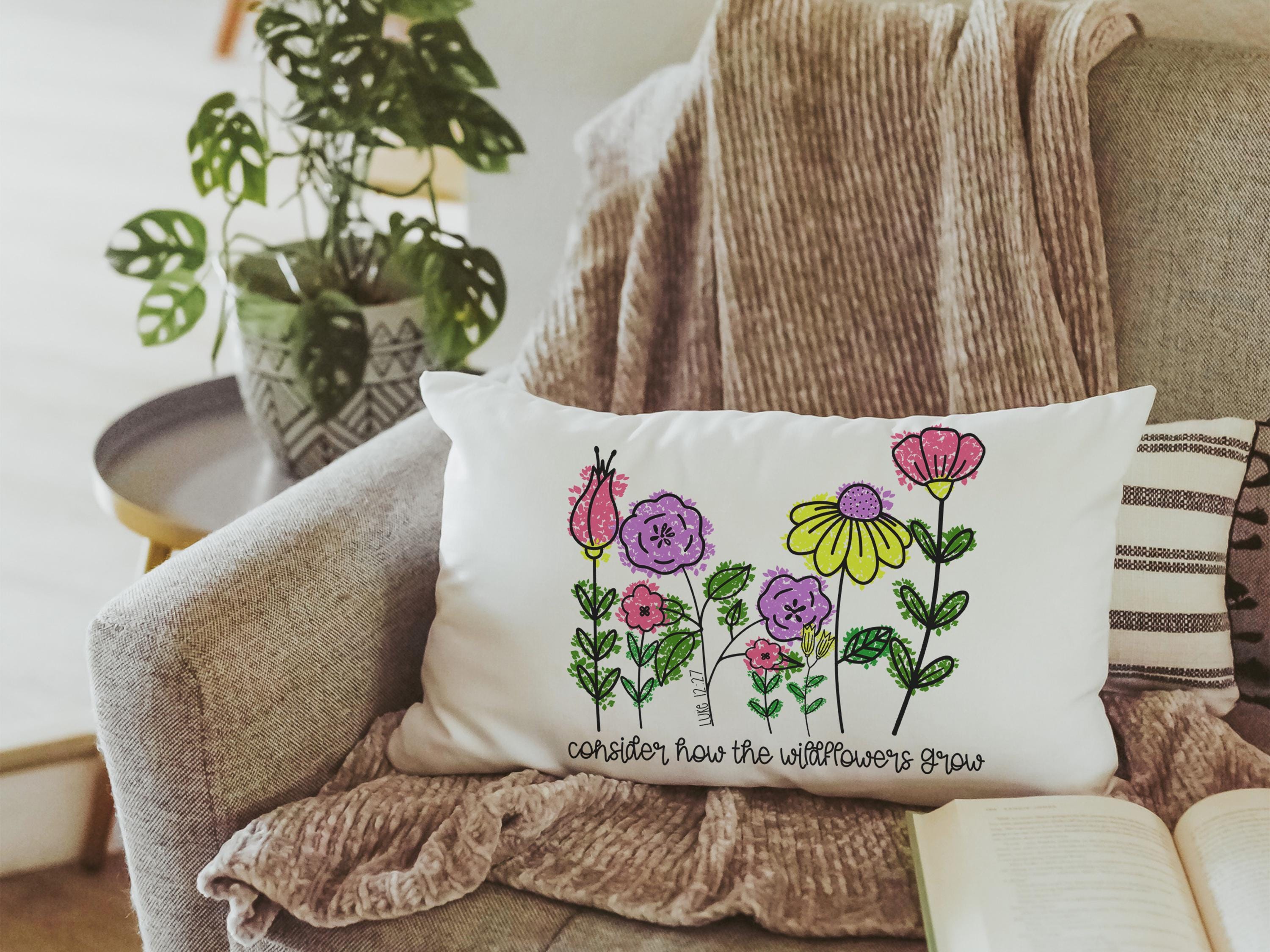 Add faith-filled beauty to your space with Consider How the Wildflowers Grow pillows inspired by Luke 12:27. Perfect for the couch, bedroom, or Christian nursery, these floral decorative pillows make meaningful Bible verse gifts for women and girls. Available in two sizes: 12x20 or 18x18.