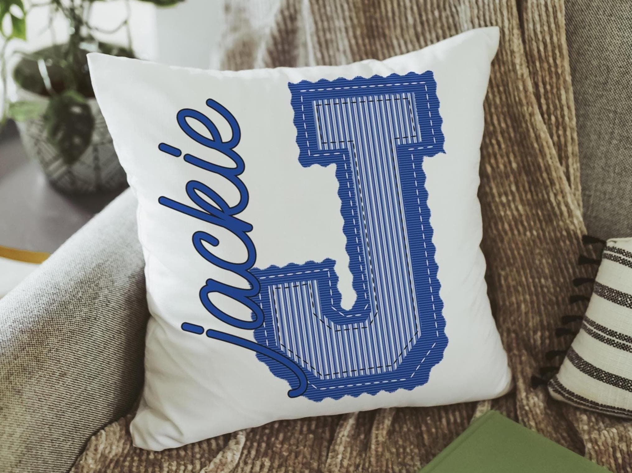 personalized royal blue seersucker pillow with name, trendy Christmas gifts for girls, teenage girl gifts, initial throw pillow for dorm