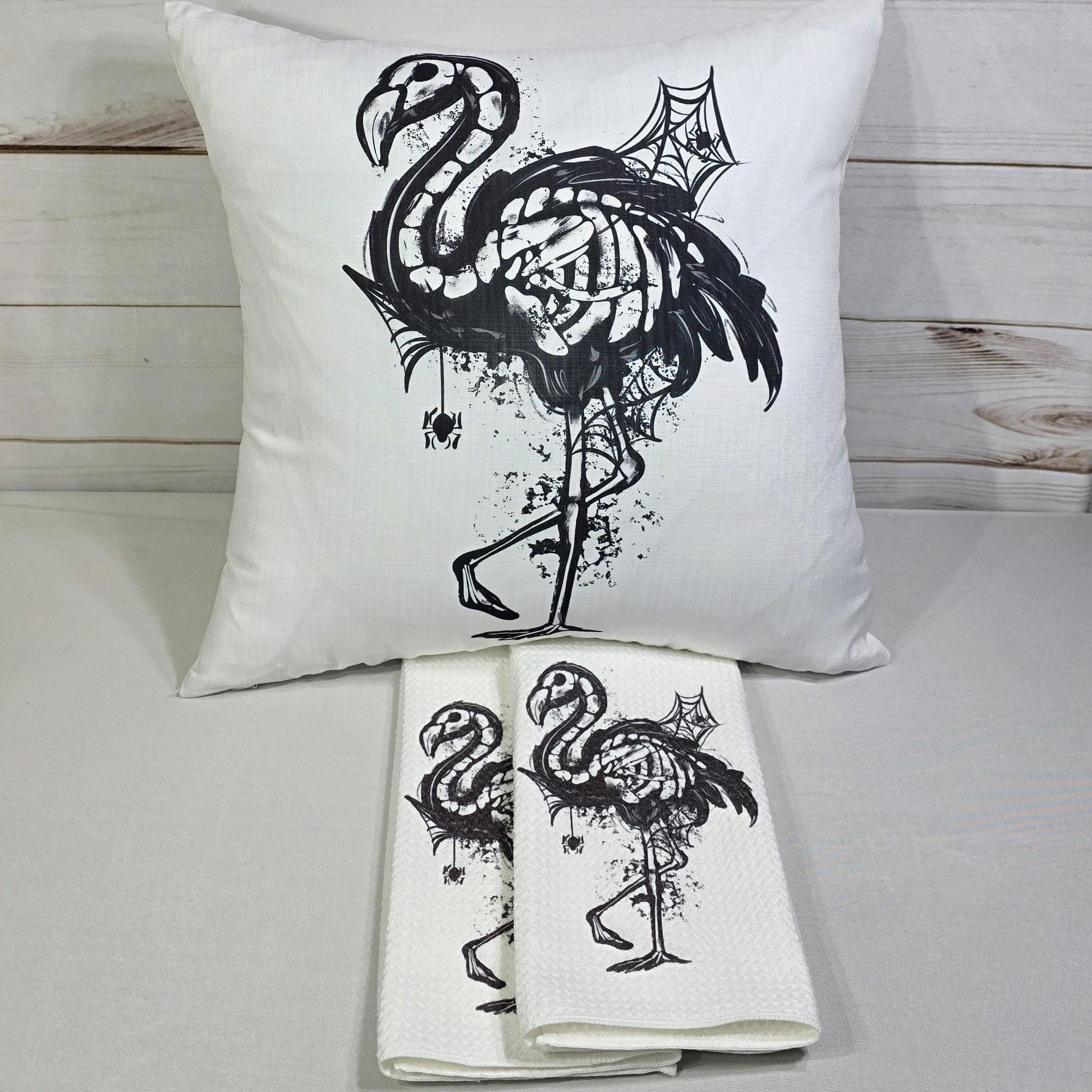 Add a touch of spooky coastal style with these flamingo skeleton hand towels and matching throw pillows. Perfect for Halloween bathroom or kitchen decor, they also make fun boo basket stuffers for your girlfriend or beach-loving friends.