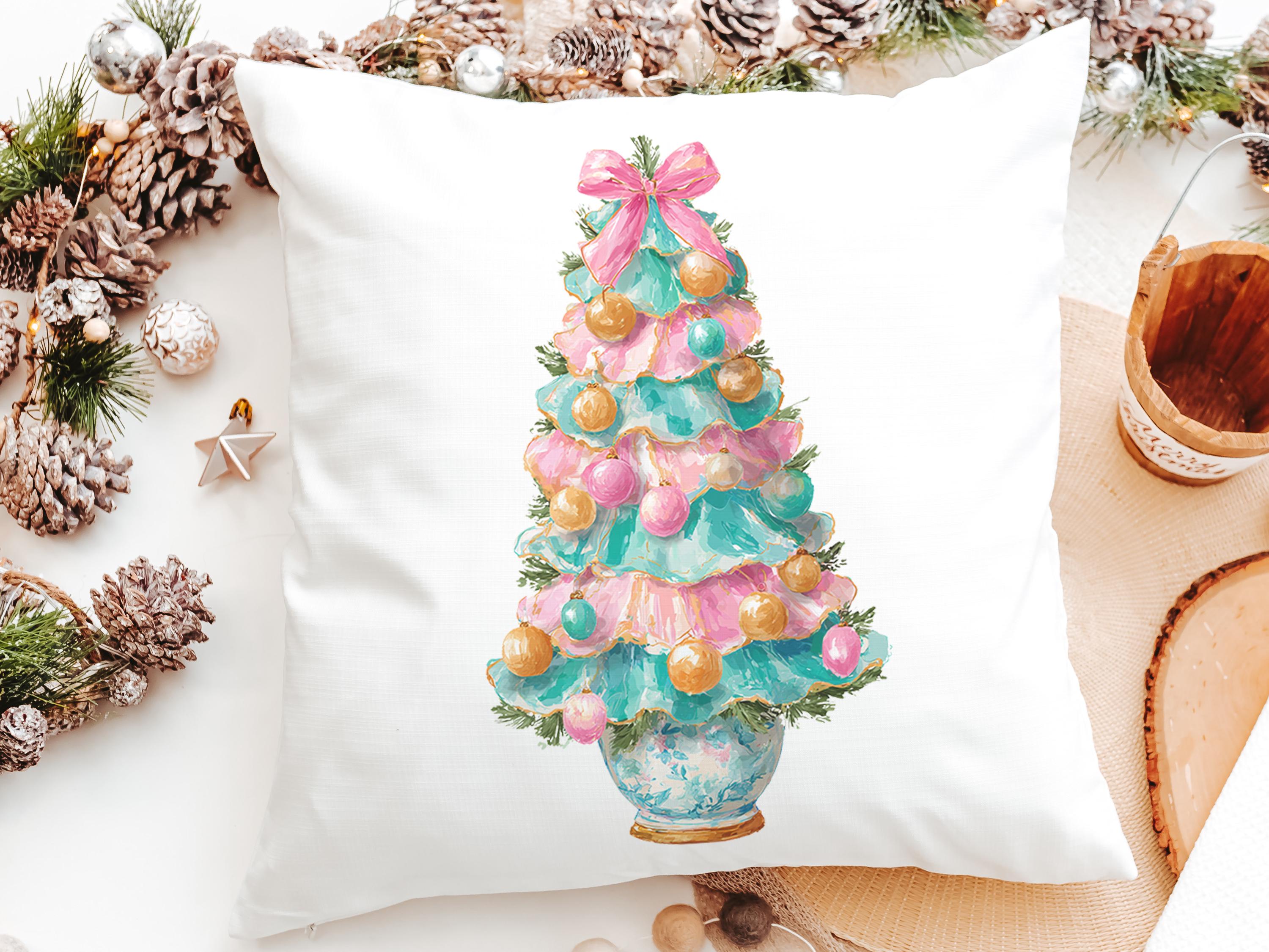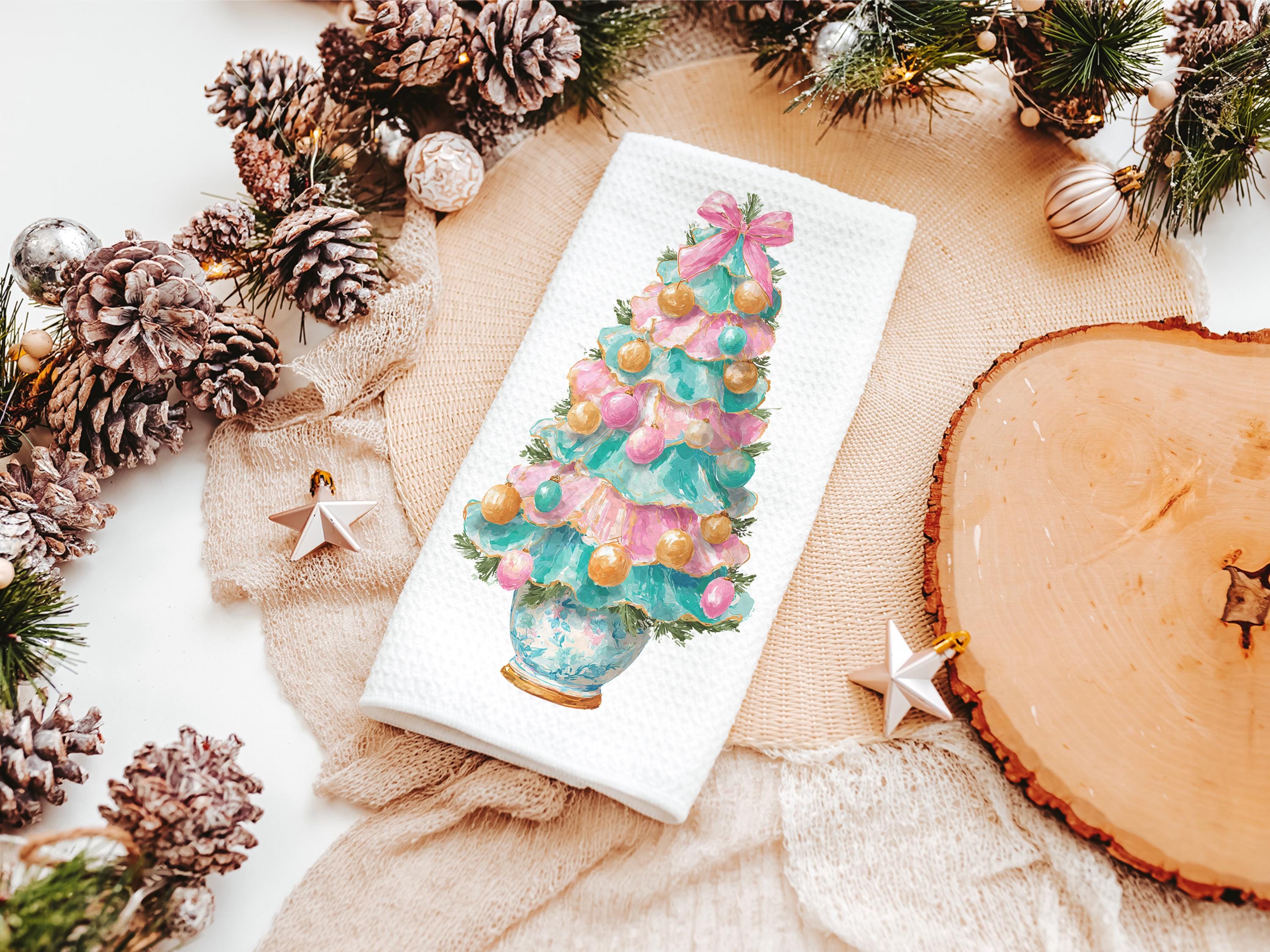 pastel Christmas tree throw pillows for couch pink grandmillenial Christmas kitchen towels for winter, holiday hosting decor home decor gift