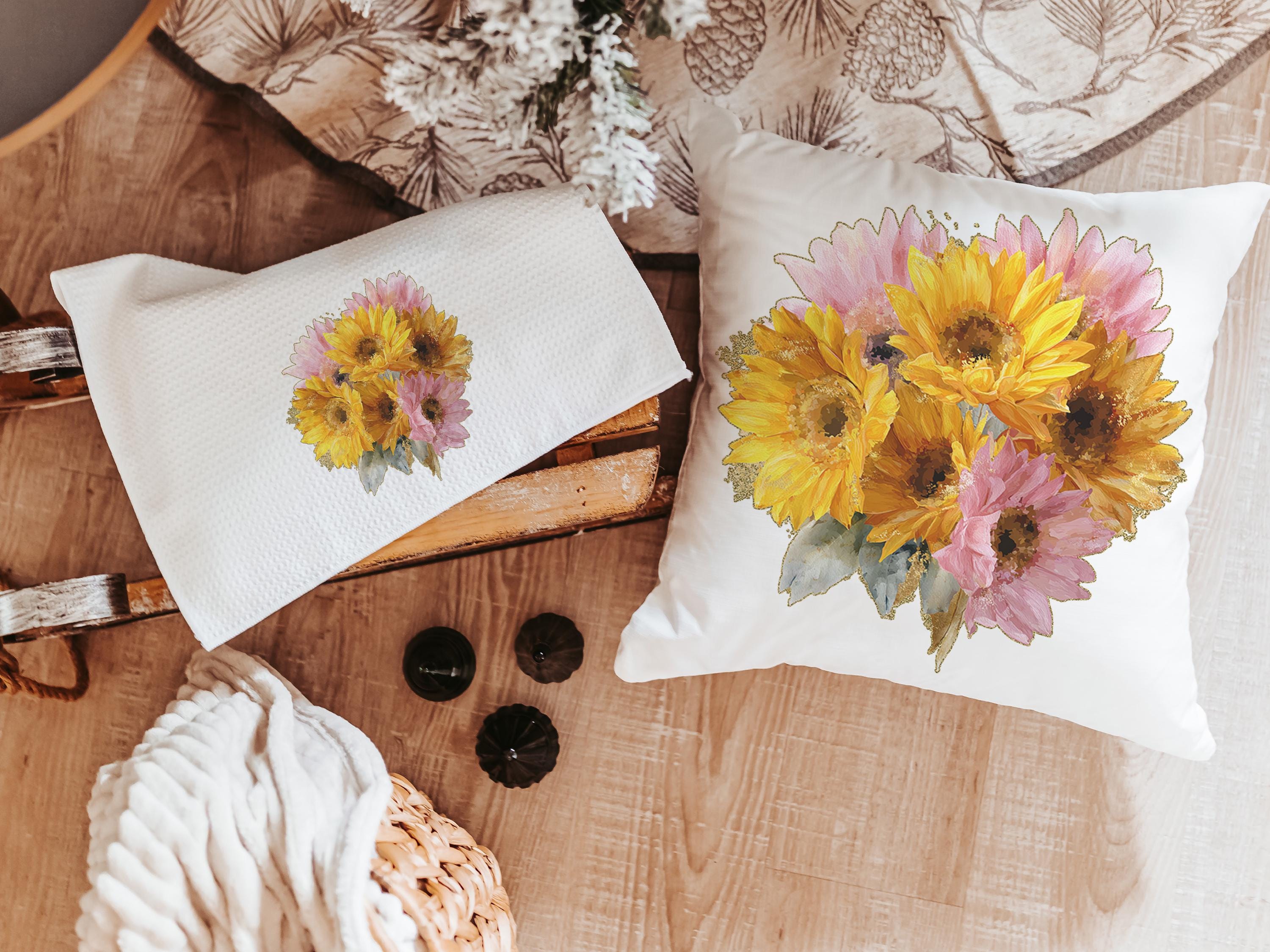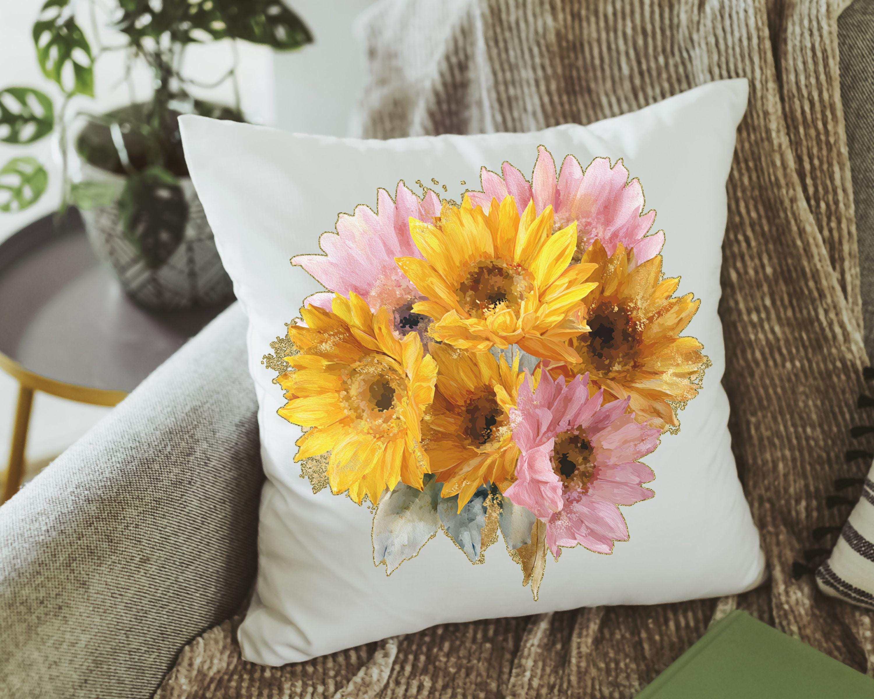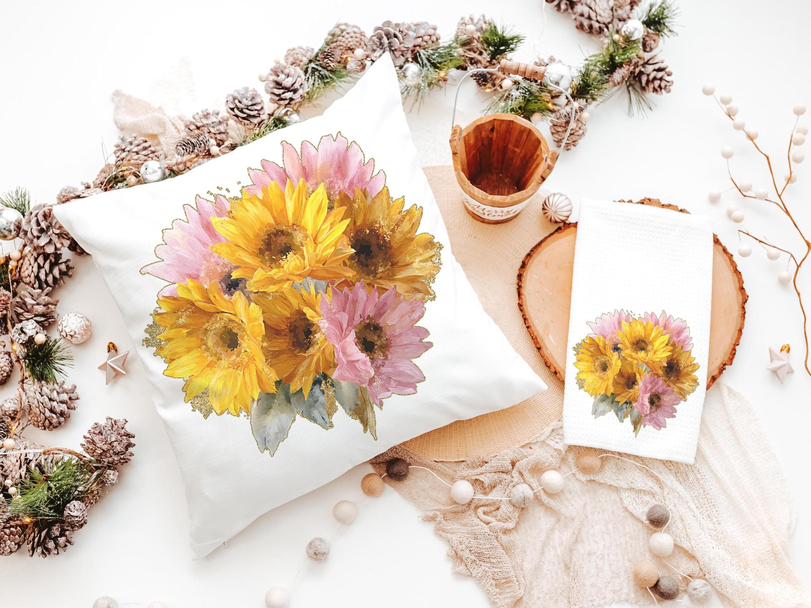 Brighten any space with sunny yellow daisies and a hint of light pink. This throw pillow and matching towel would be a beautiful gift for Mom, a sweet birth flower gift idea, or a daisy gift. The matching towels are available for purchase individually or as a set.