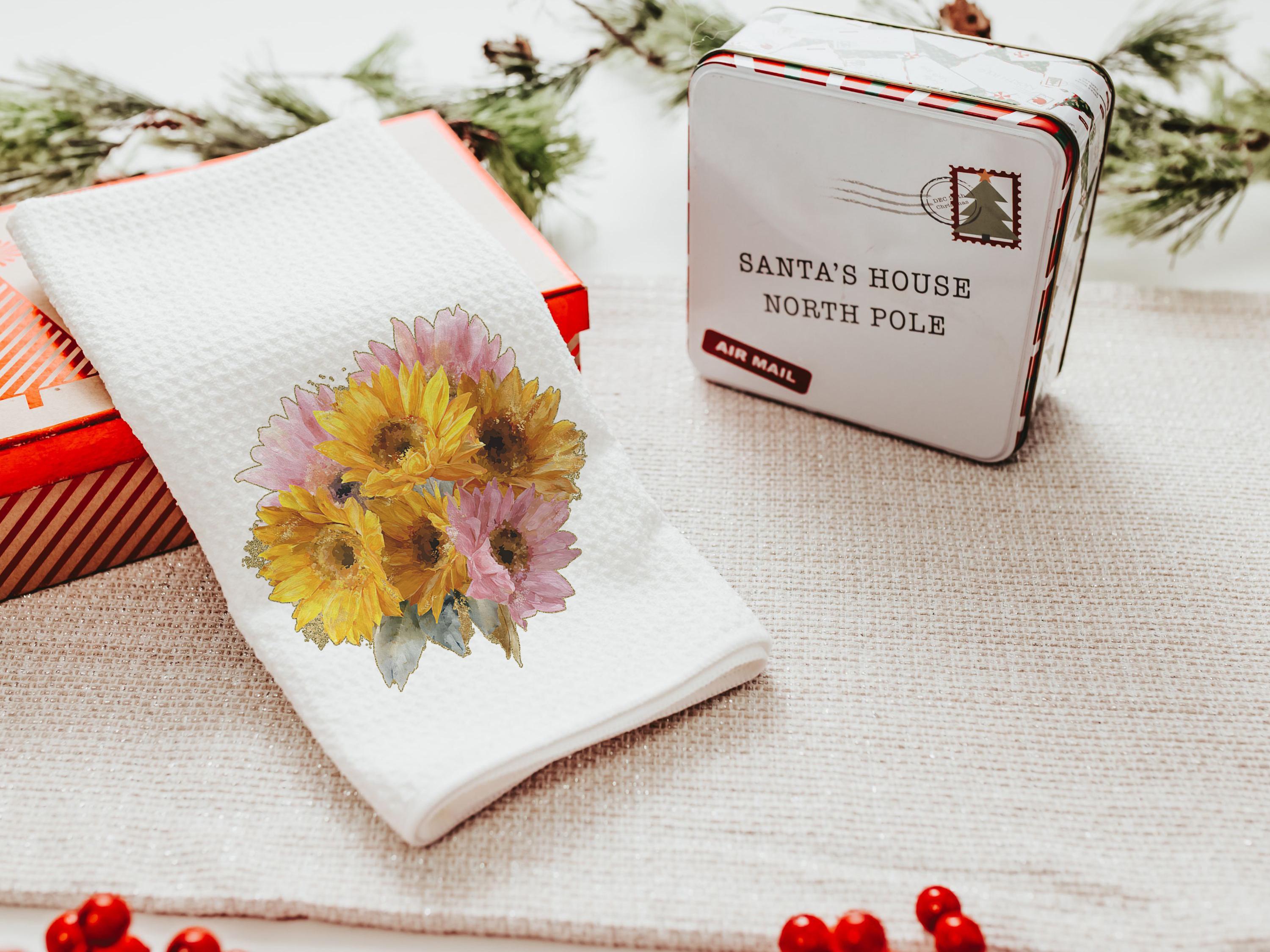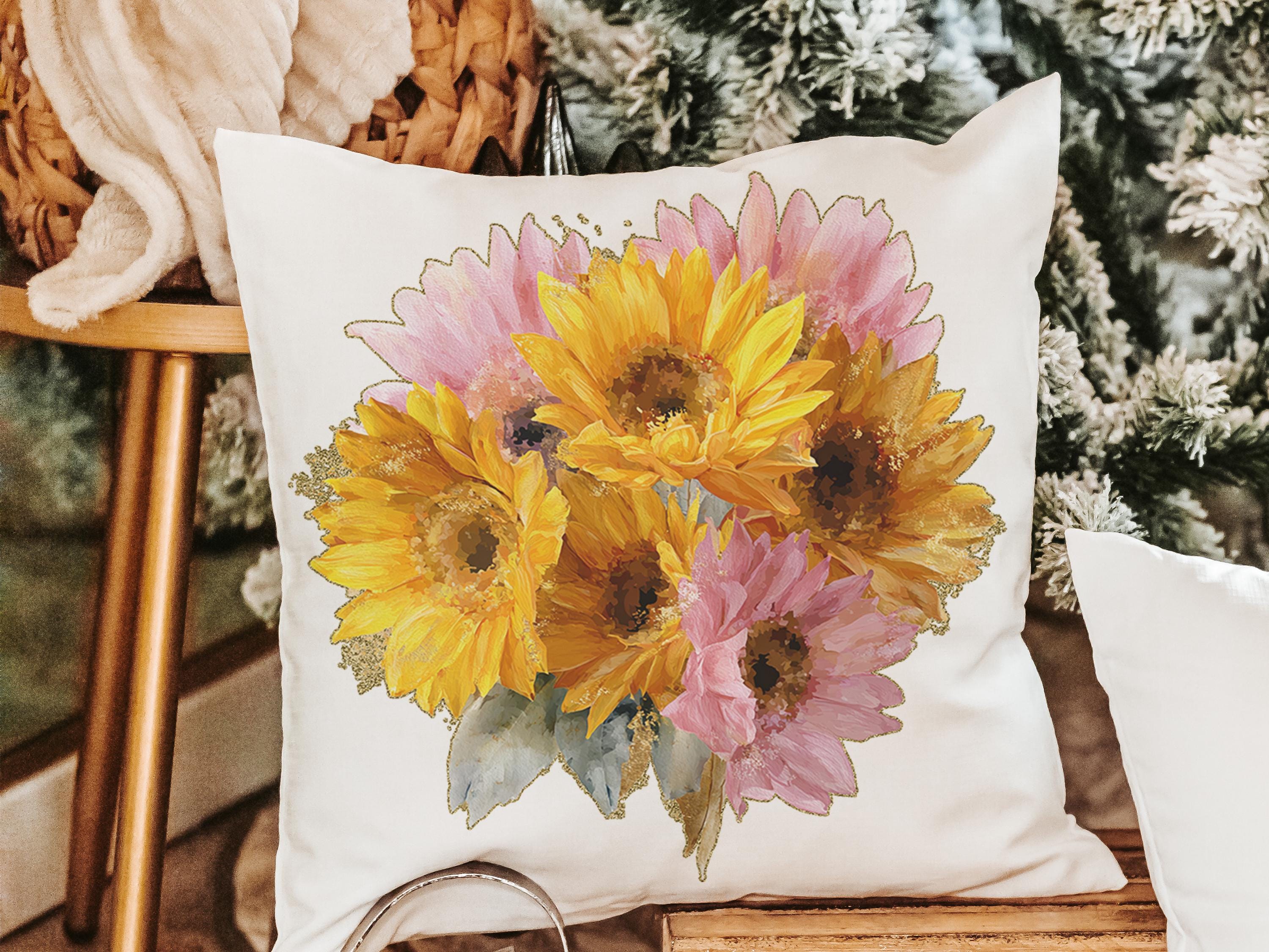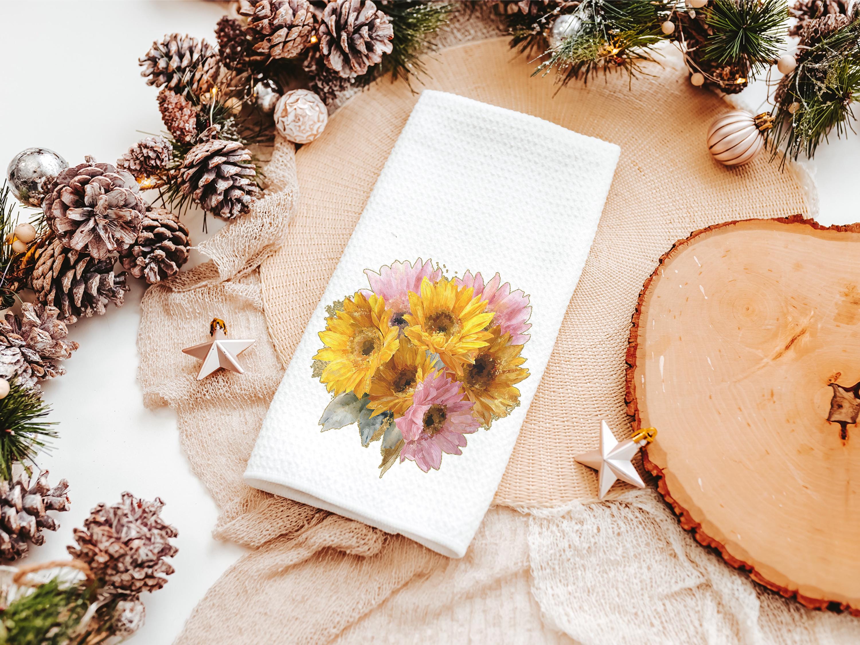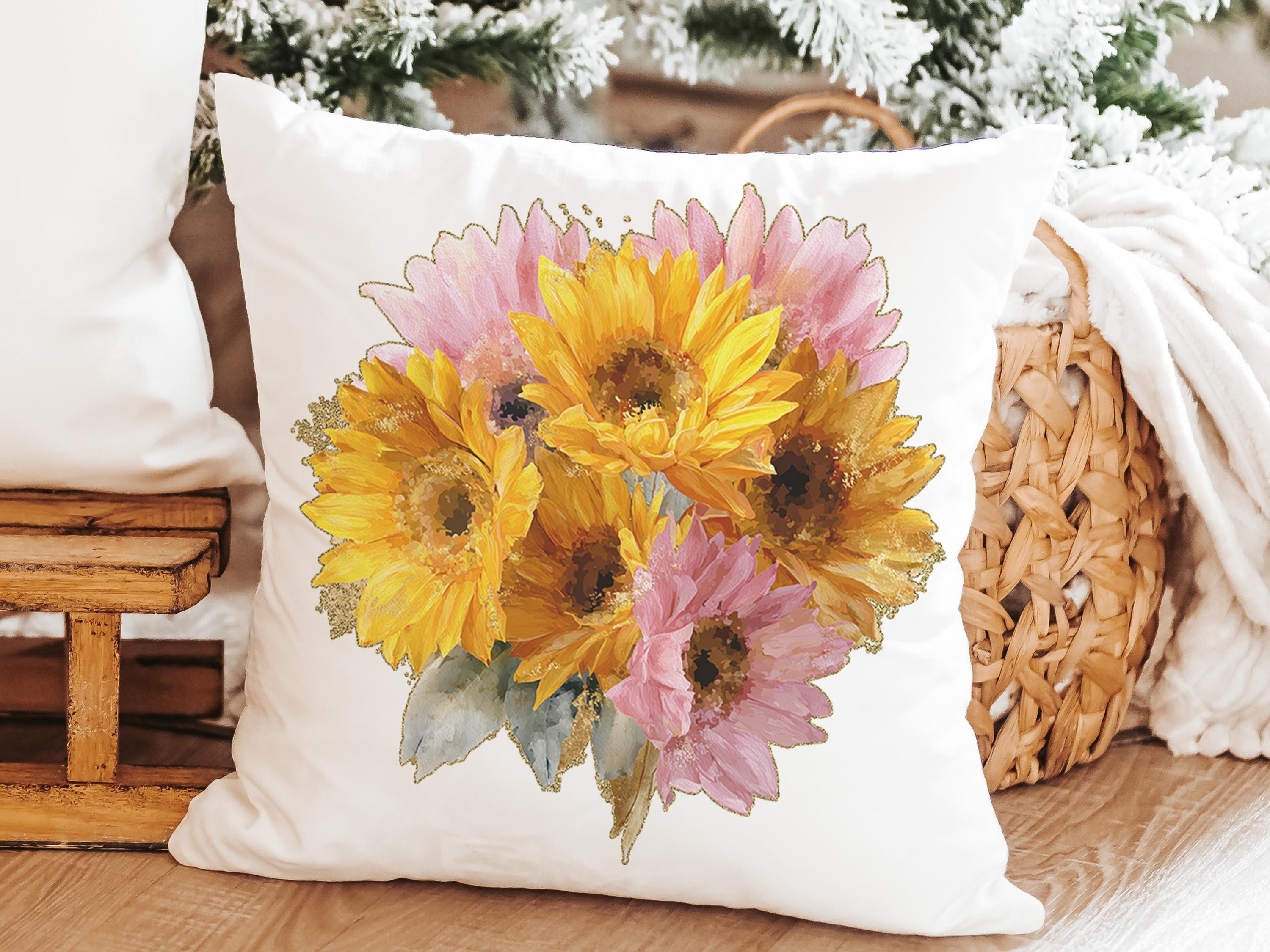 Brighten any space with sunny yellow daisies and a hint of light pink. This throw pillow and matching towel would be a beautiful gift for Mom, a sweet birth flower gift idea, or a daisy gift. The matching towels are available for purchase individually or as a set.