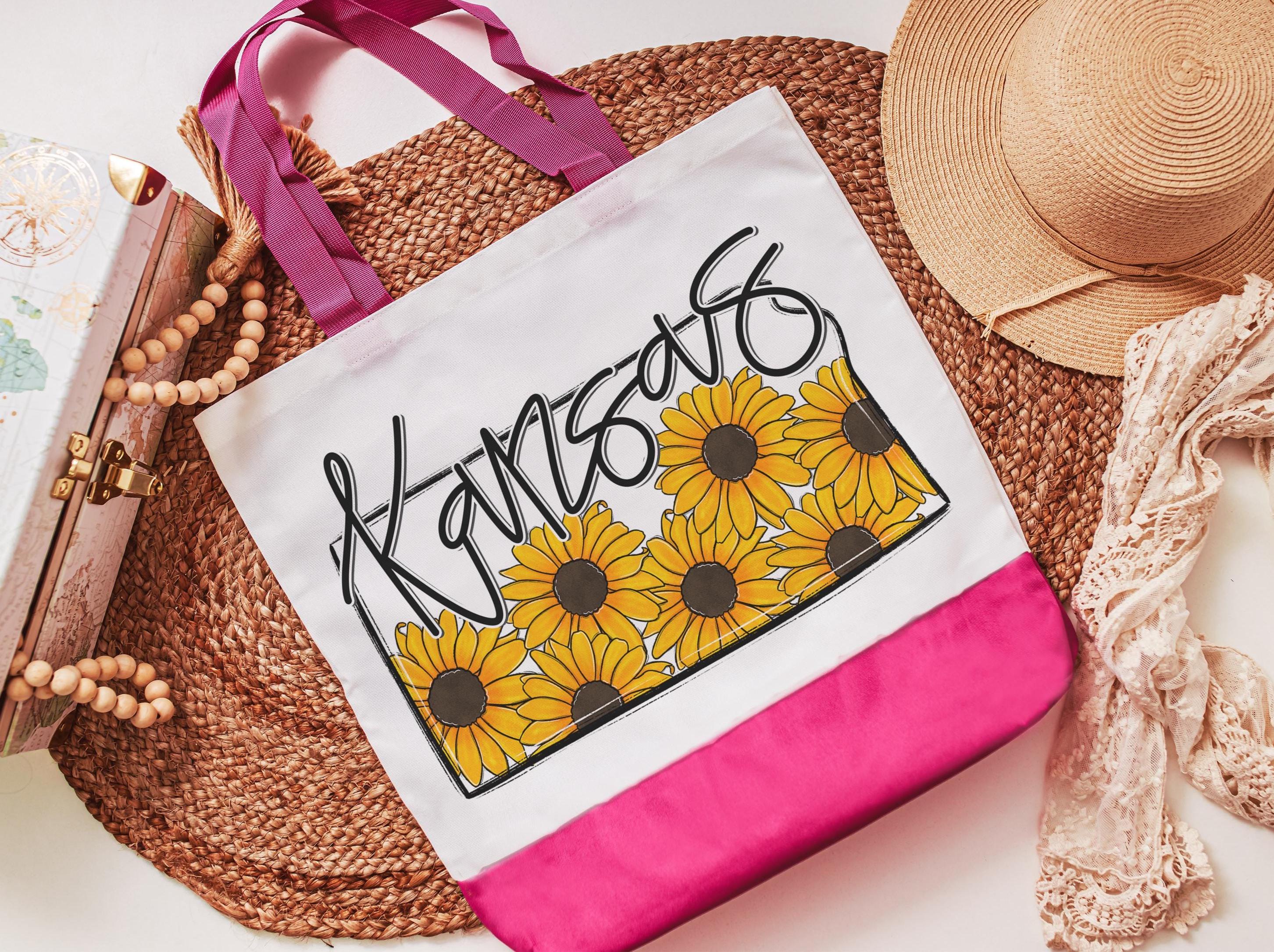 Show Kansas pride with this tote bag featuring yellow sunflowers the Kansas state flower. Perfect as a reusable farmers market or shopping bag, it’s one of the best sellers for Kansas gifts and makes a fun Christmas surprise for neighbors or college students.