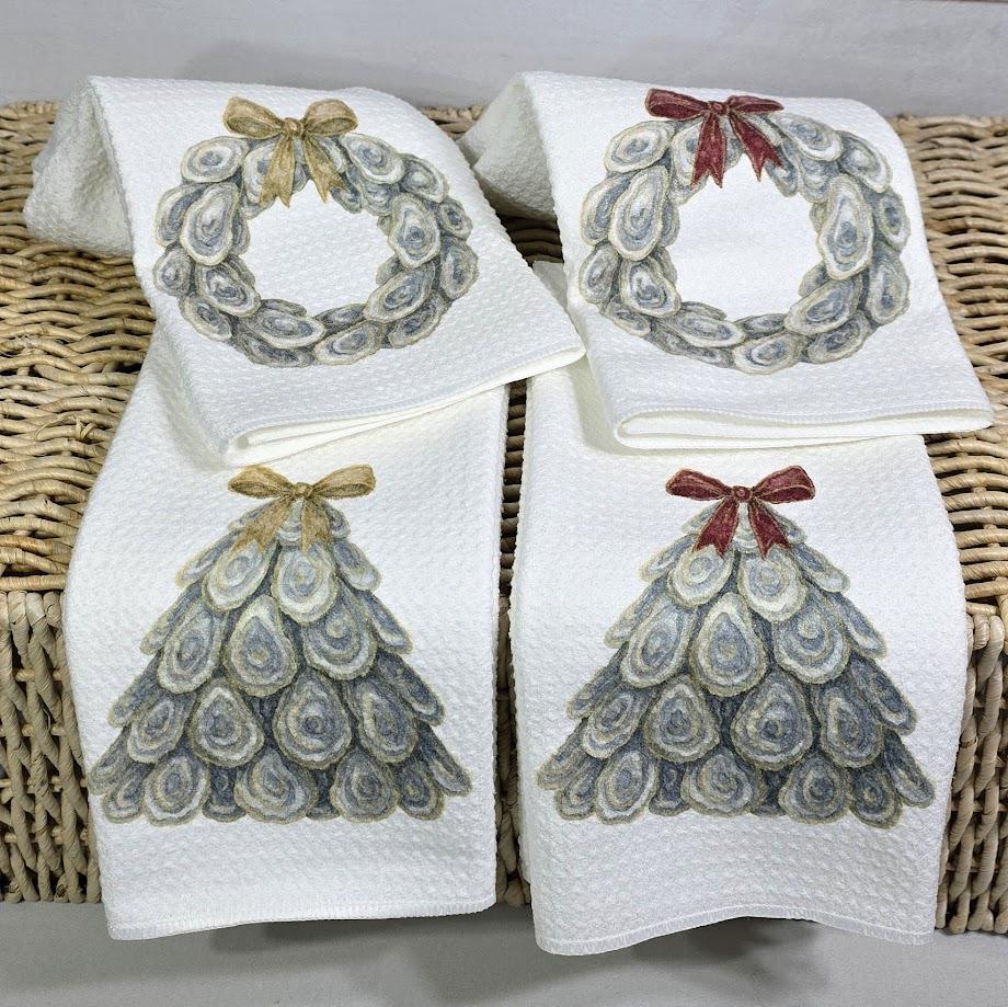 Bring coastal holiday style to your home with Oyster Shell Christmas Wreath throw pillows and matching towels — a beautiful blend of seaside and seasonal style. Perfect for the bedroom, guest bath, or kitchen, these oyster Christmas accents make thoughtful gifts for neighbors and besties.