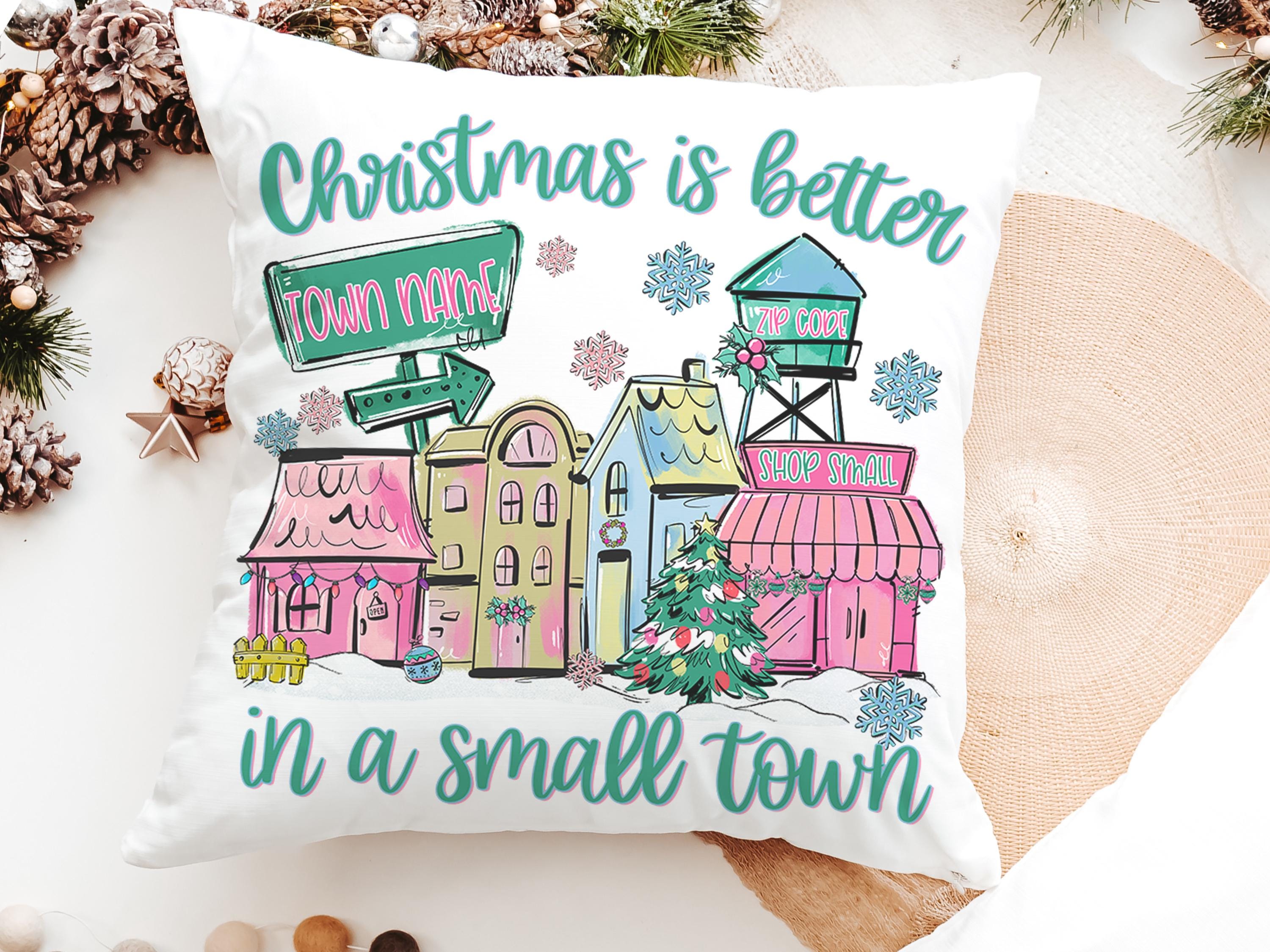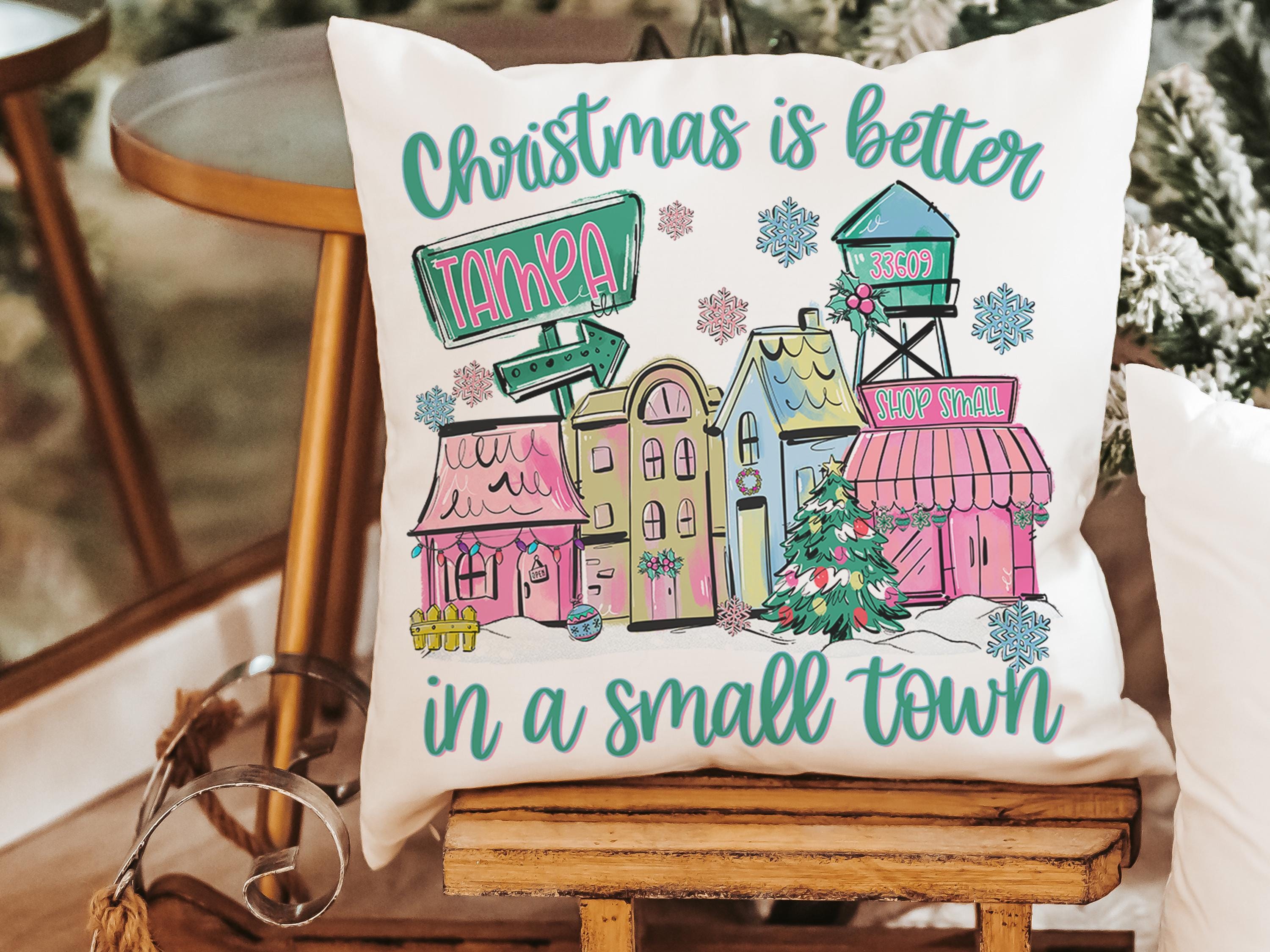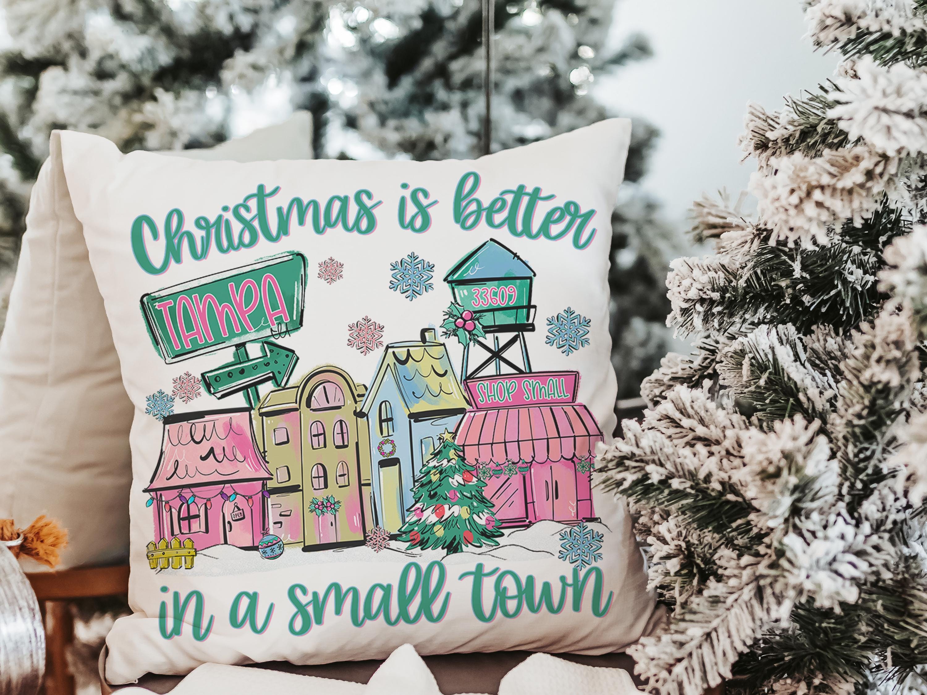 Celebrate hometown Christmas spirit with a Christmas Is Better in a Small Town pillow personalized with your zip code and city. Perfect for cozy couch decor, this pink Christmas accent makes cute holiday gifts for neighbors or a thoughtful touch for a new home.