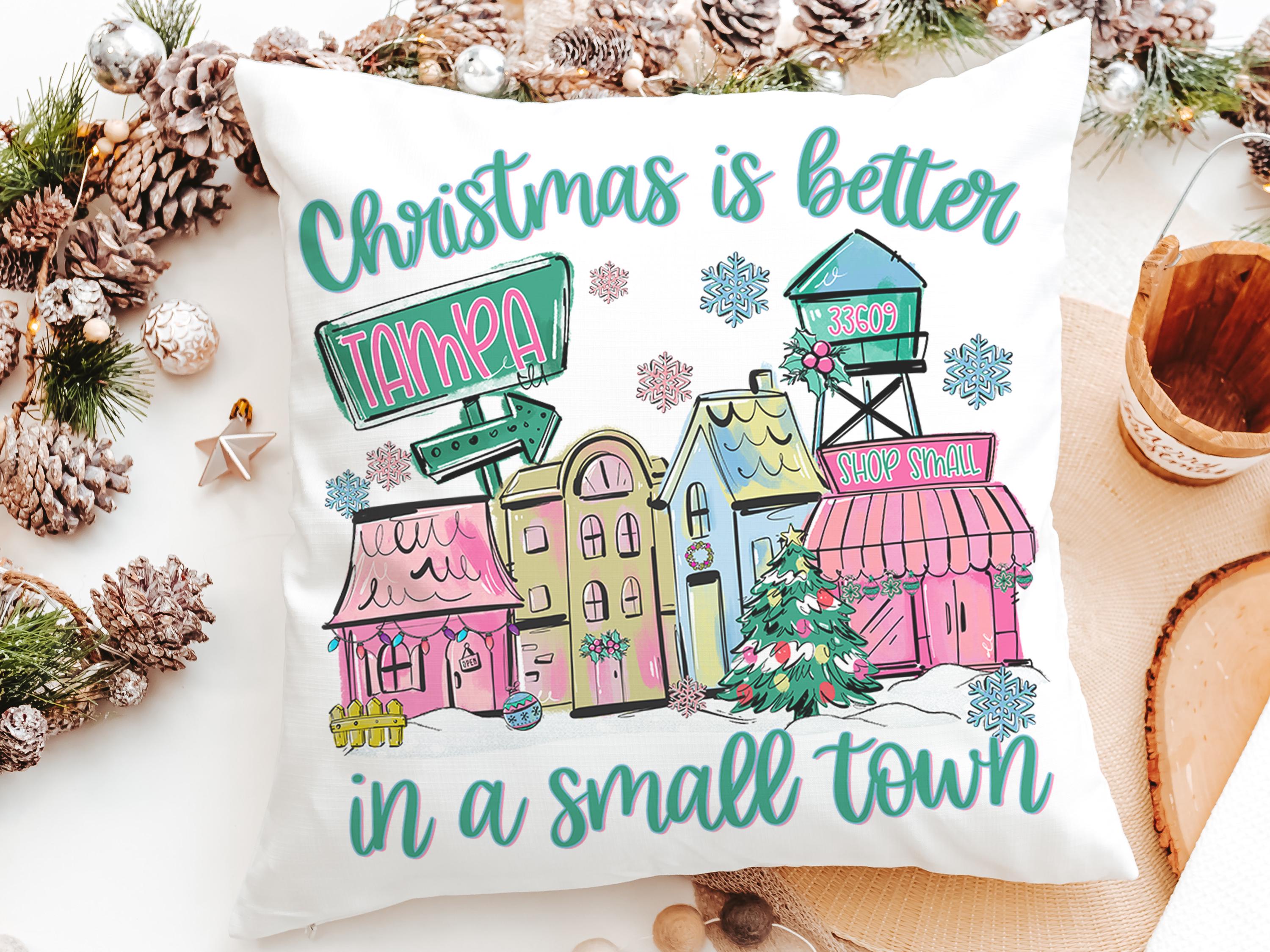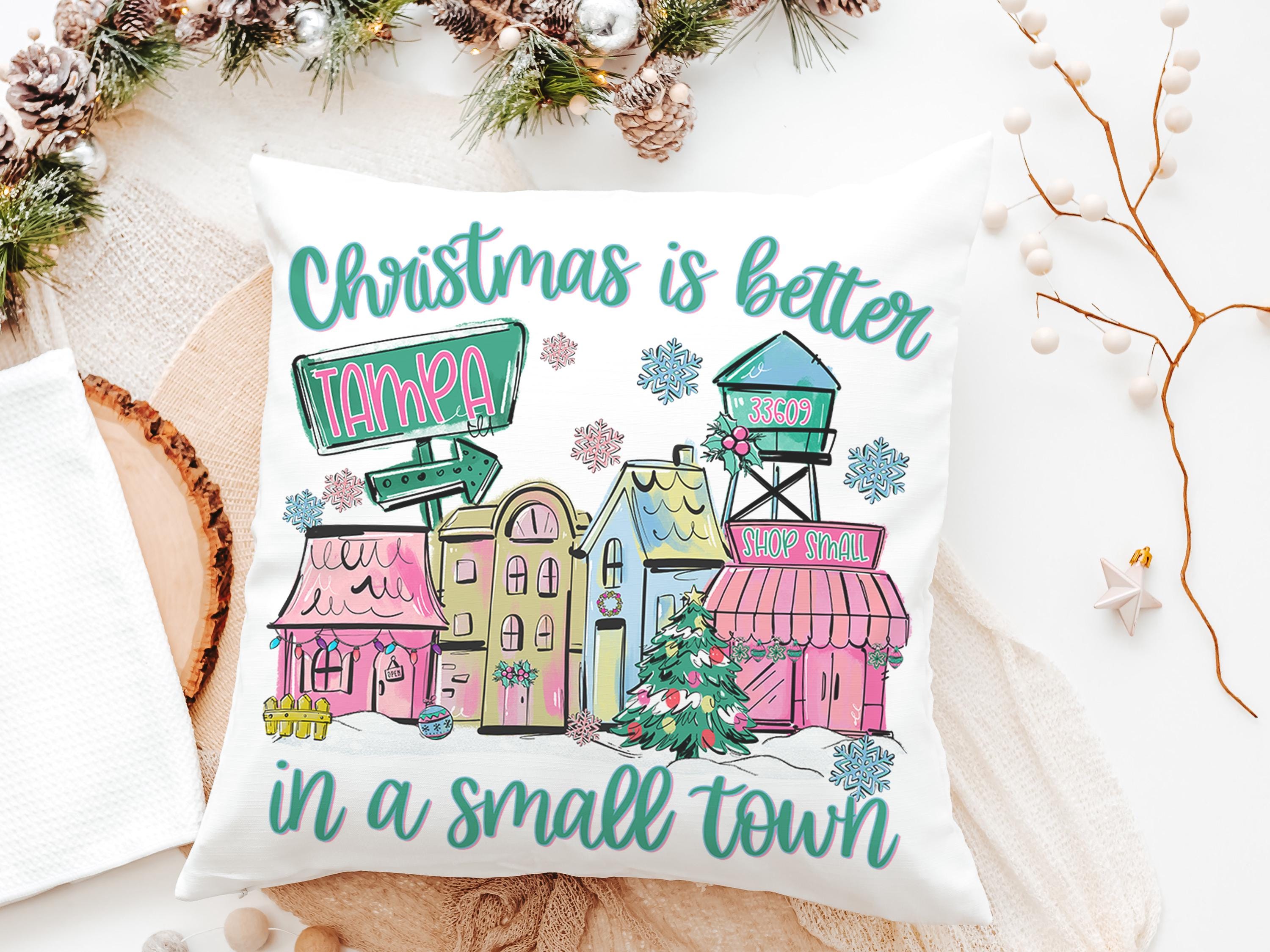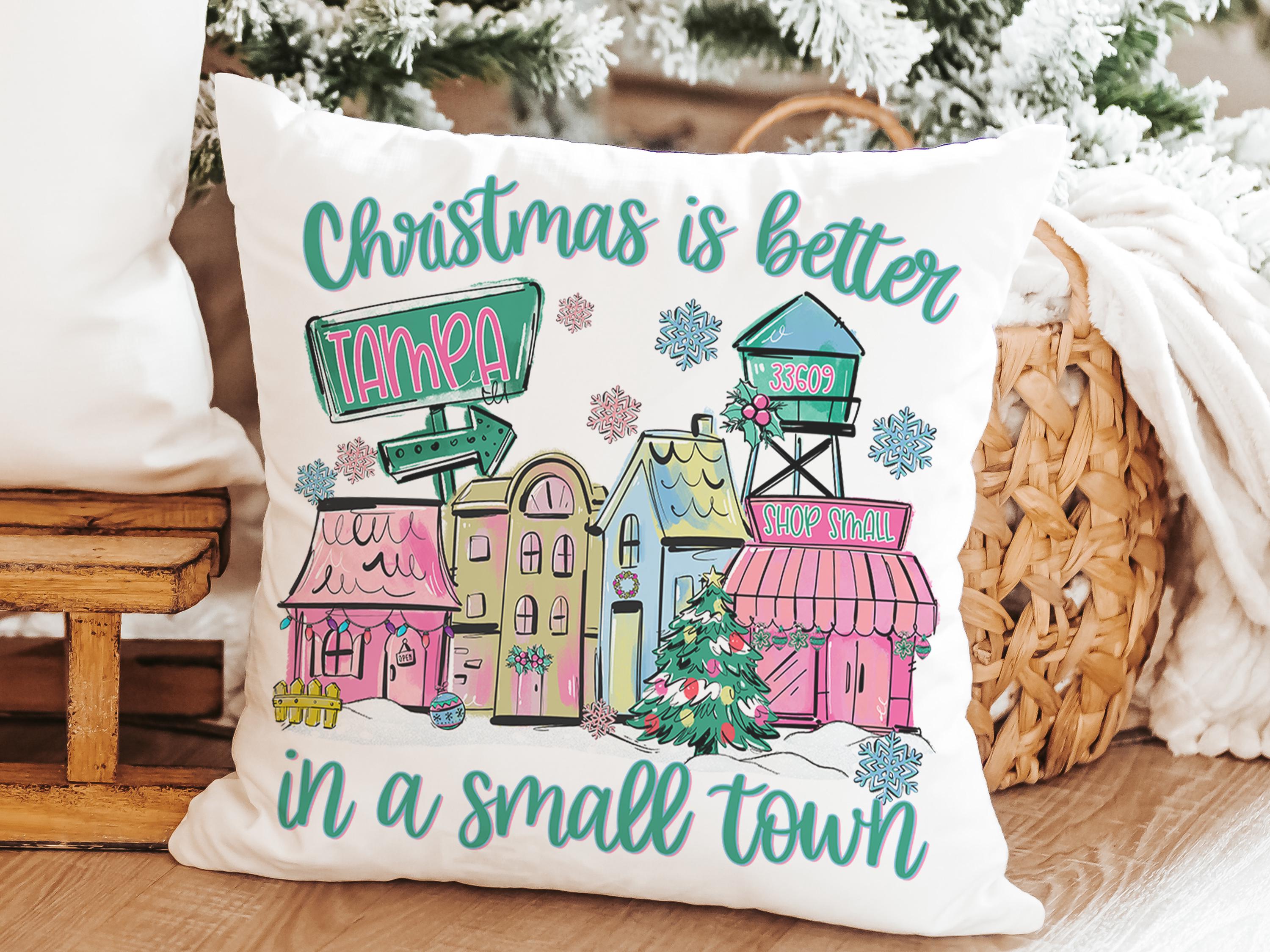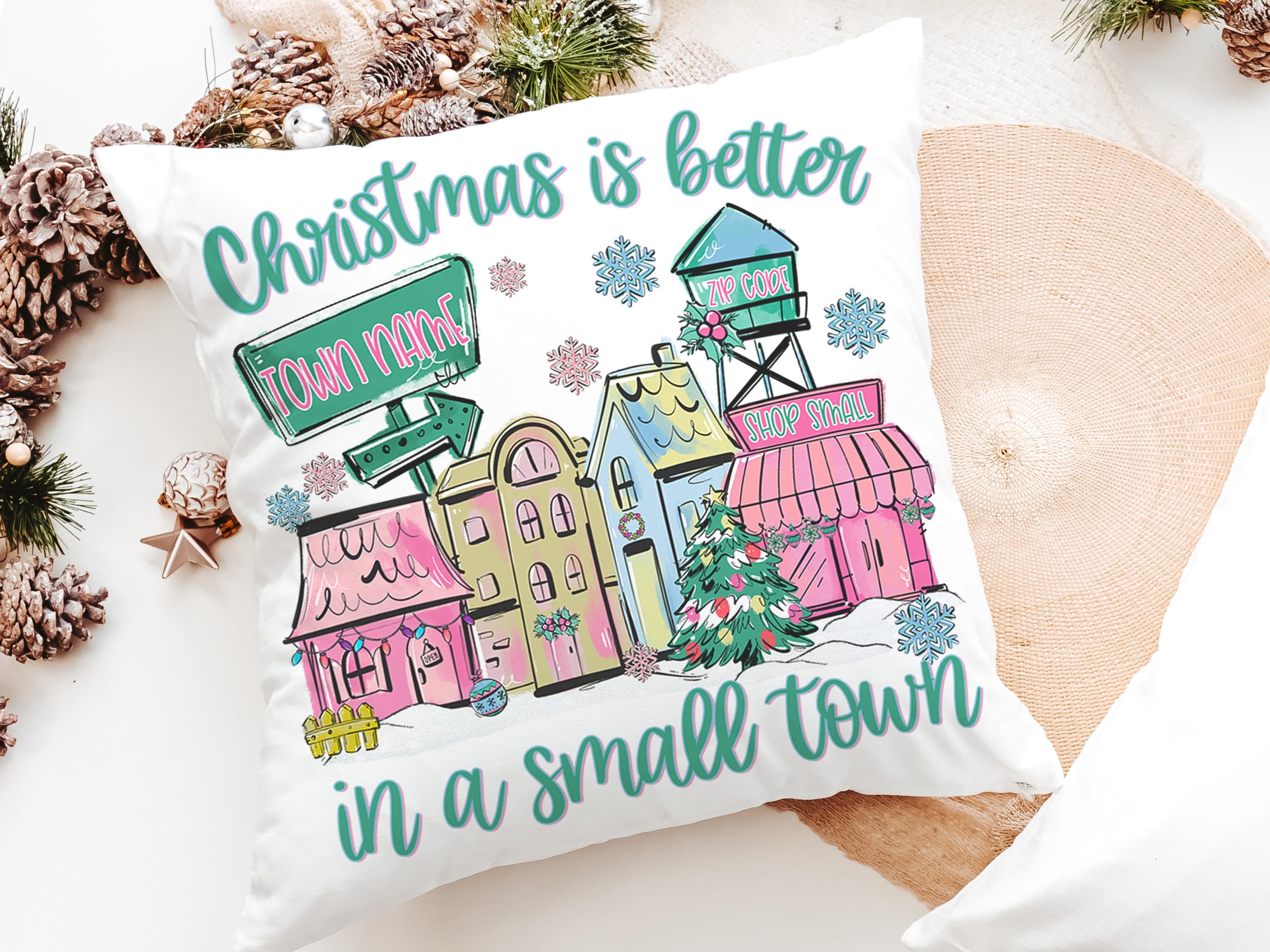 Celebrate hometown Christmas spirit with a Christmas Is Better in a Small Town pillow personalized with your zip code and city. Perfect for cozy couch decor, this pink Christmas accent makes cute holiday gifts for neighbors or a thoughtful touch for a new home.