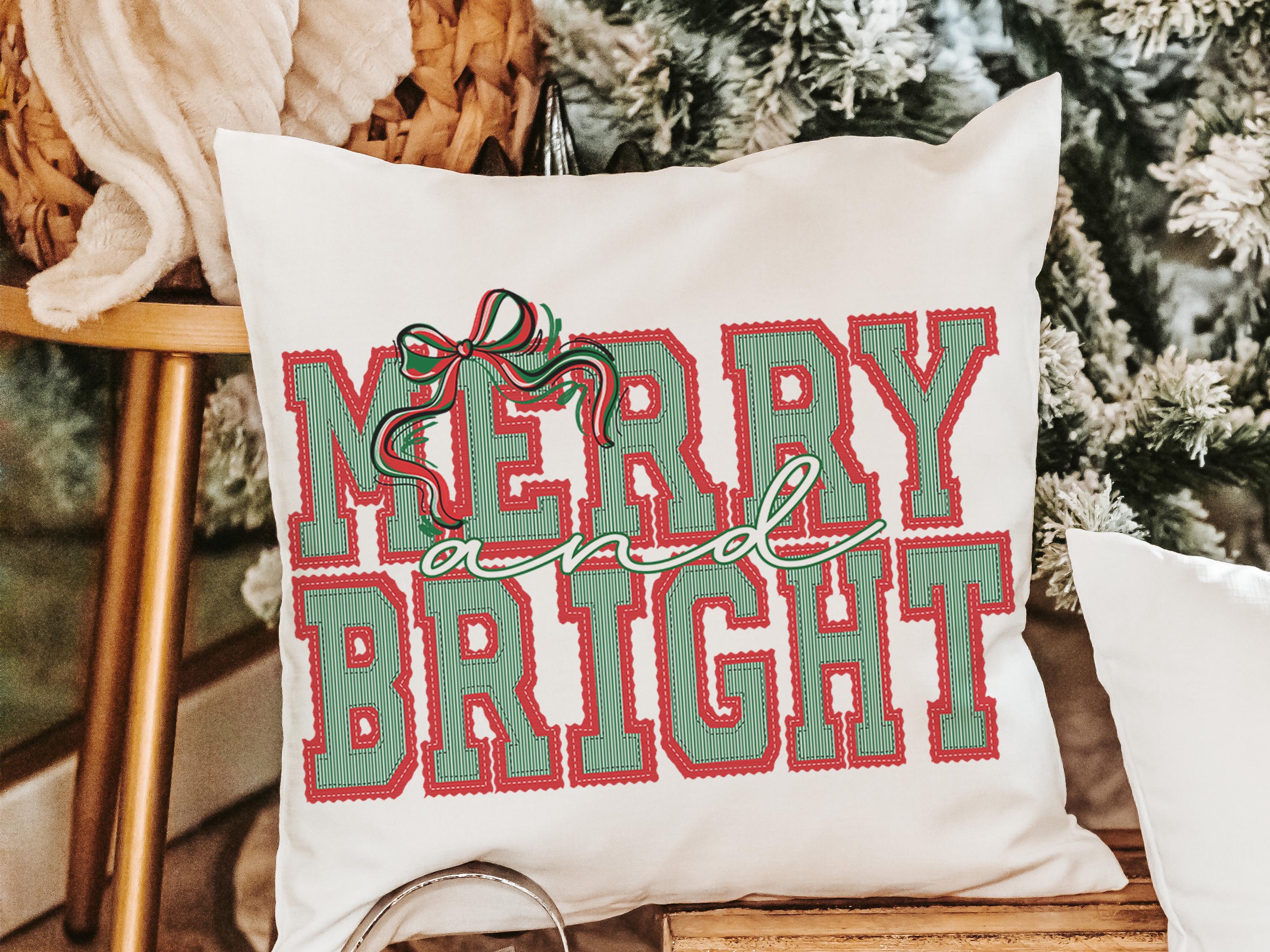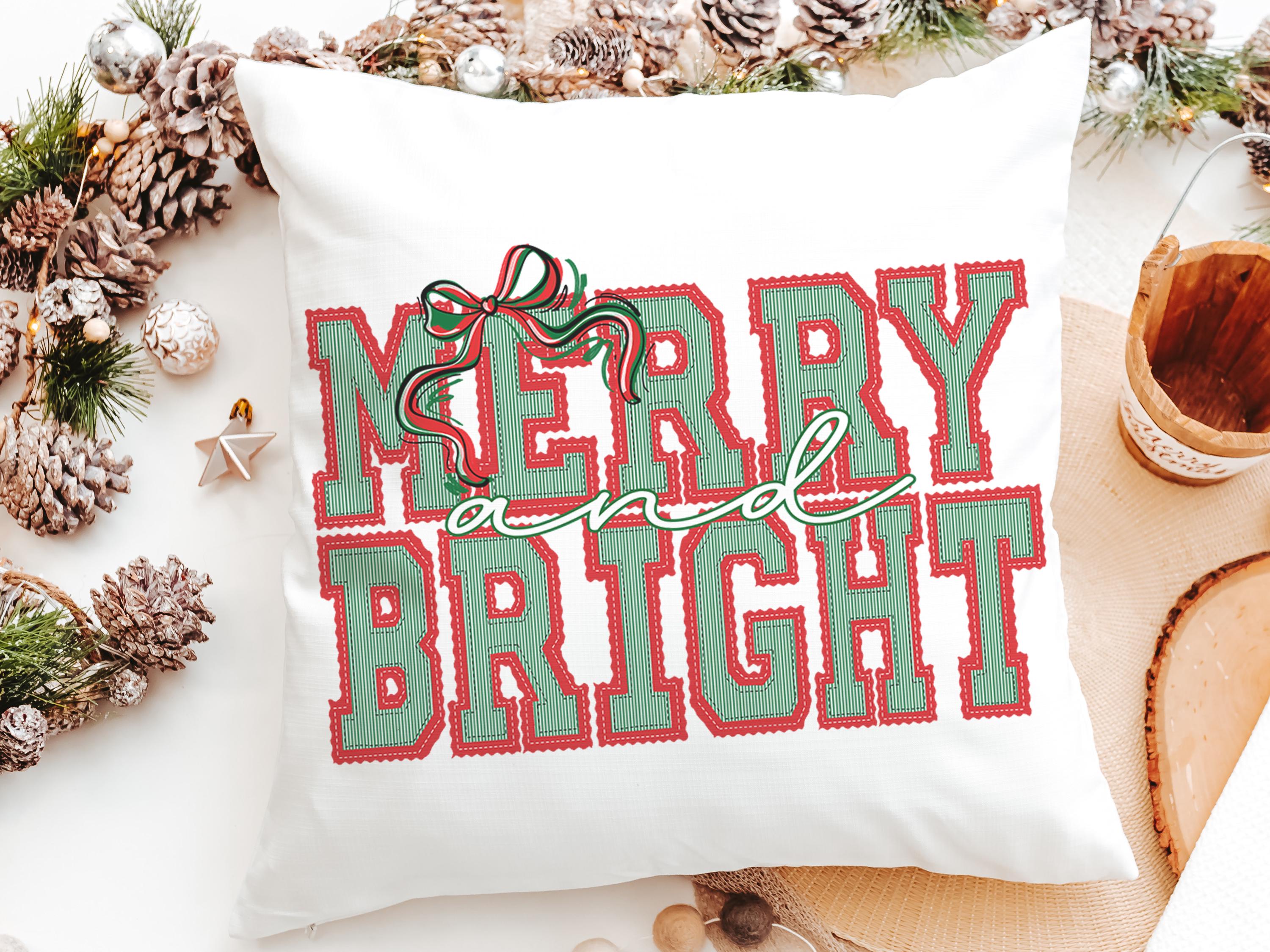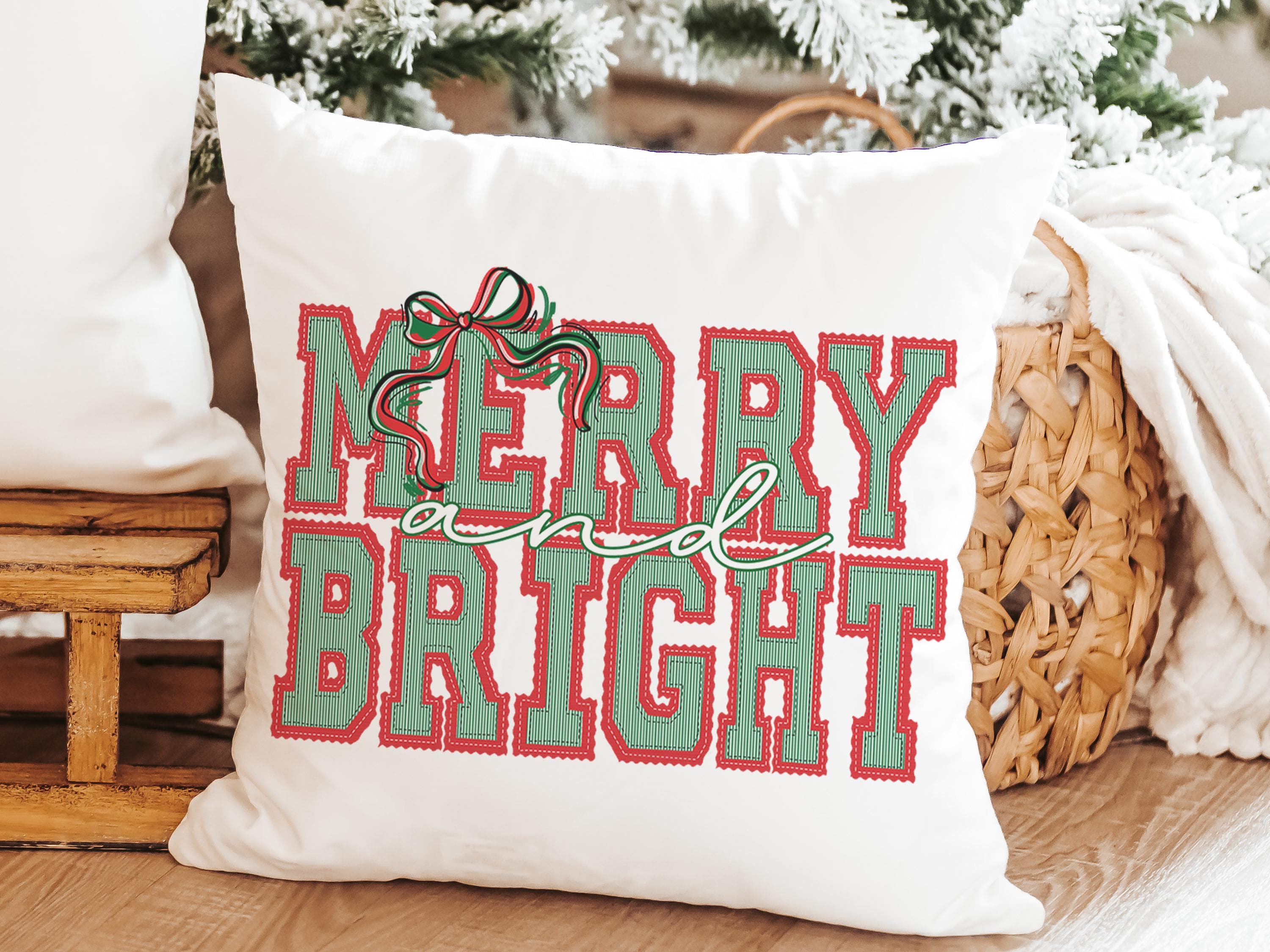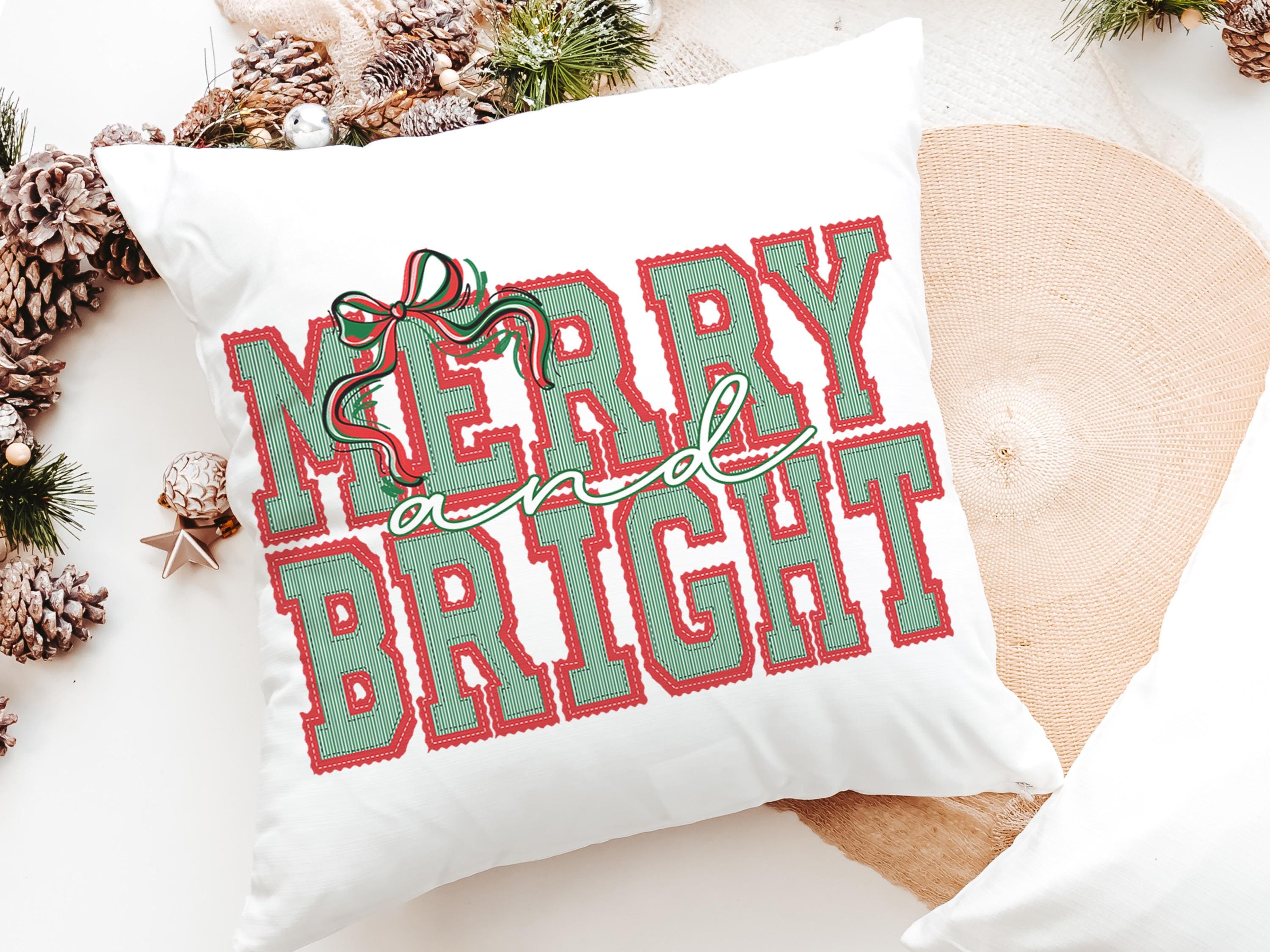 merry and bright preppy Christmas throw pillows for couch red and green seersucker Christmas decor, holiday hosting decor home decor gift