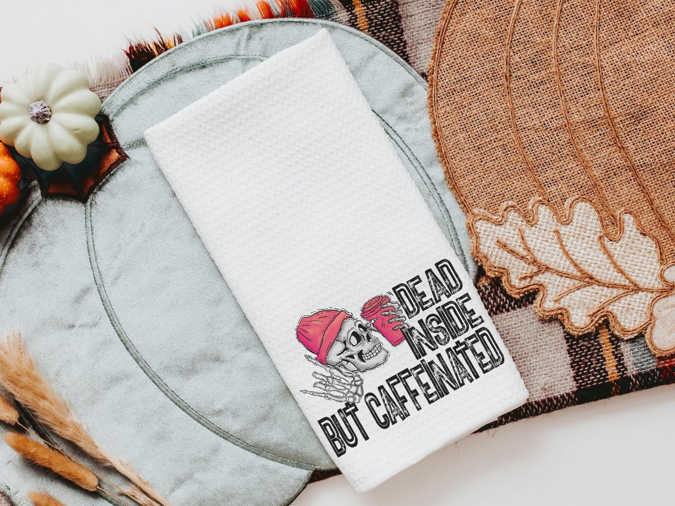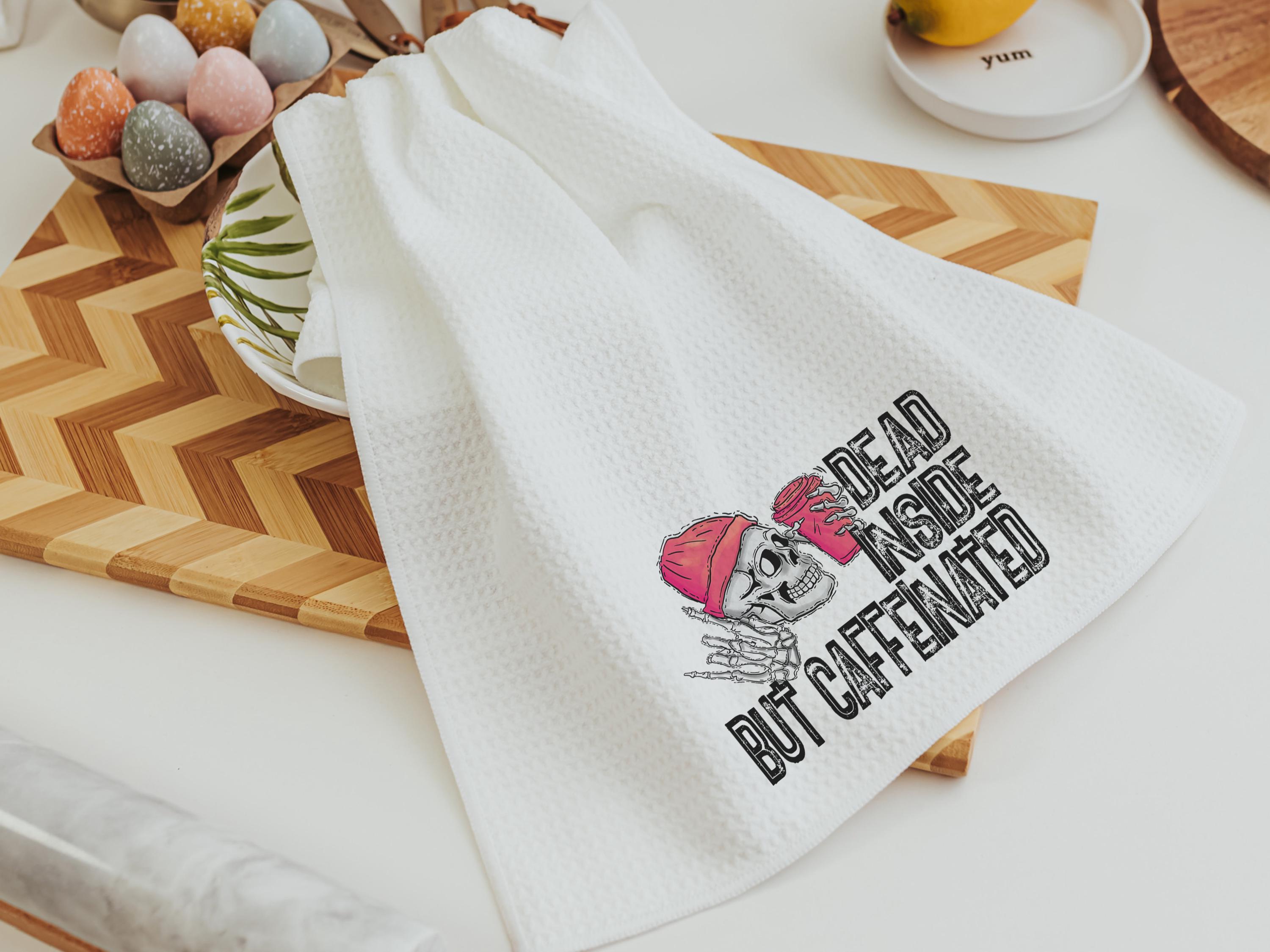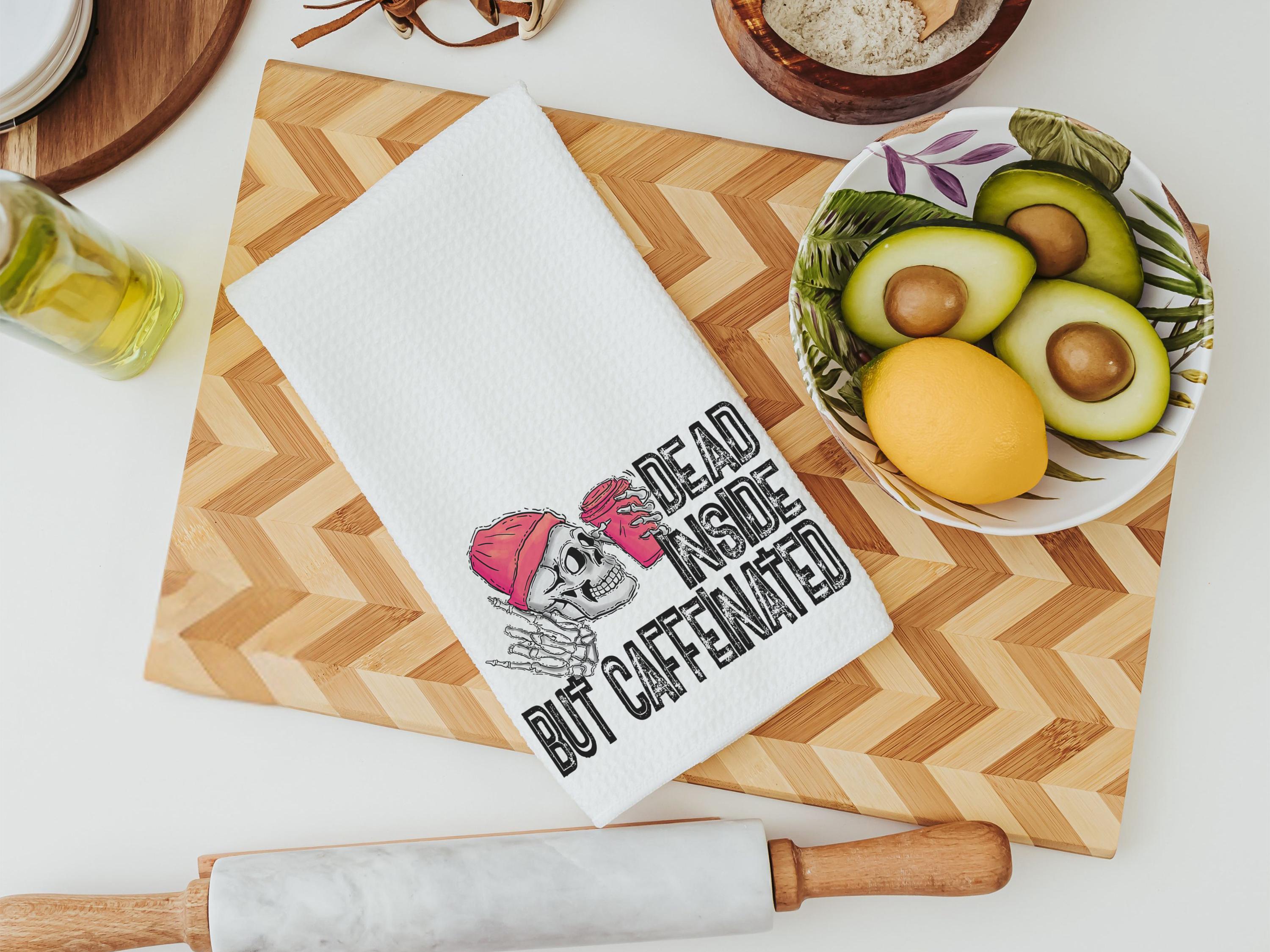 Add humor to your coffee bar with Dead Inside but Caffeinated kitchen towels — perfect for coffee addicts and caffeine-loving besties. These funny hand towels make great sarcastic gifts for coworkers or fun coffee lover gifts.
