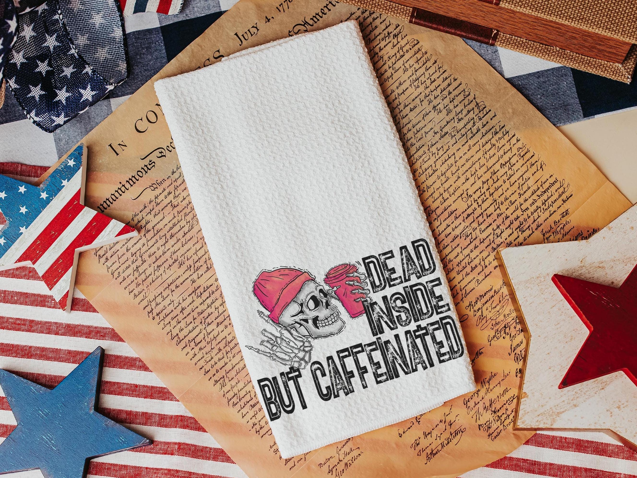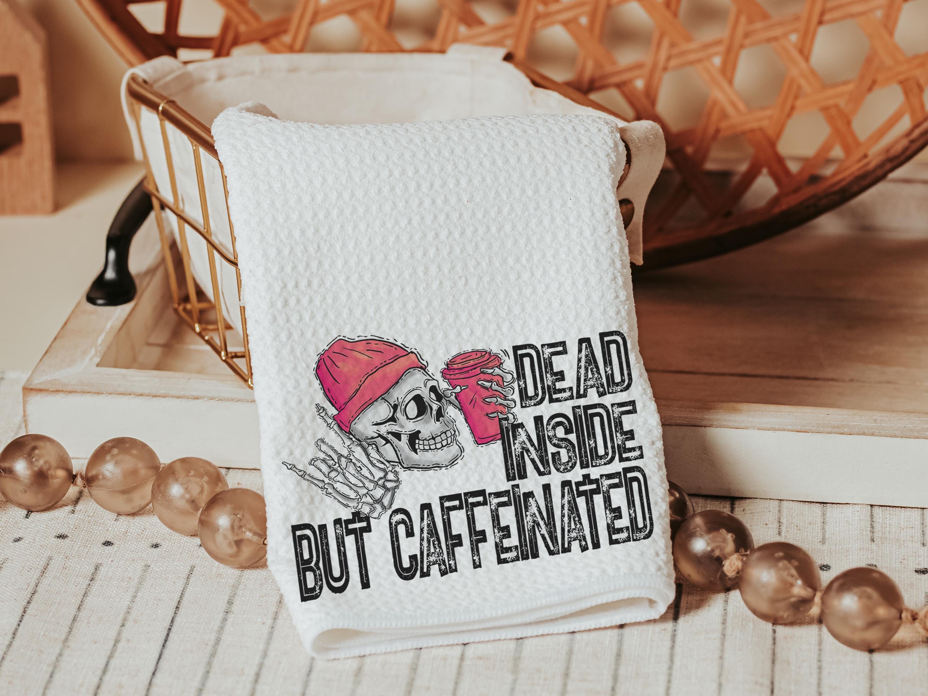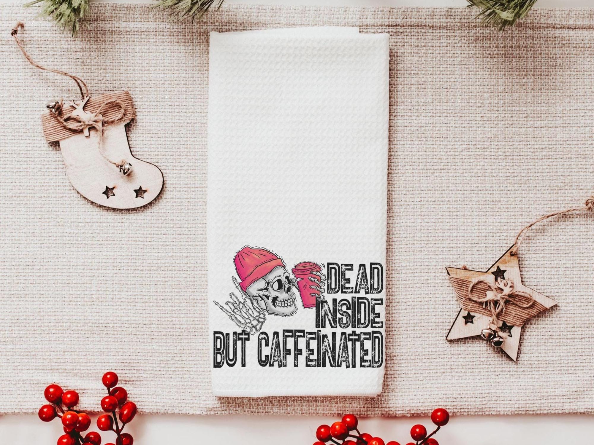 Add humor to your coffee bar with Dead Inside but Caffeinated kitchen towels — perfect for coffee addicts and caffeine-loving besties. These funny hand towels make great sarcastic gifts for coworkers or fun coffee lover gifts.