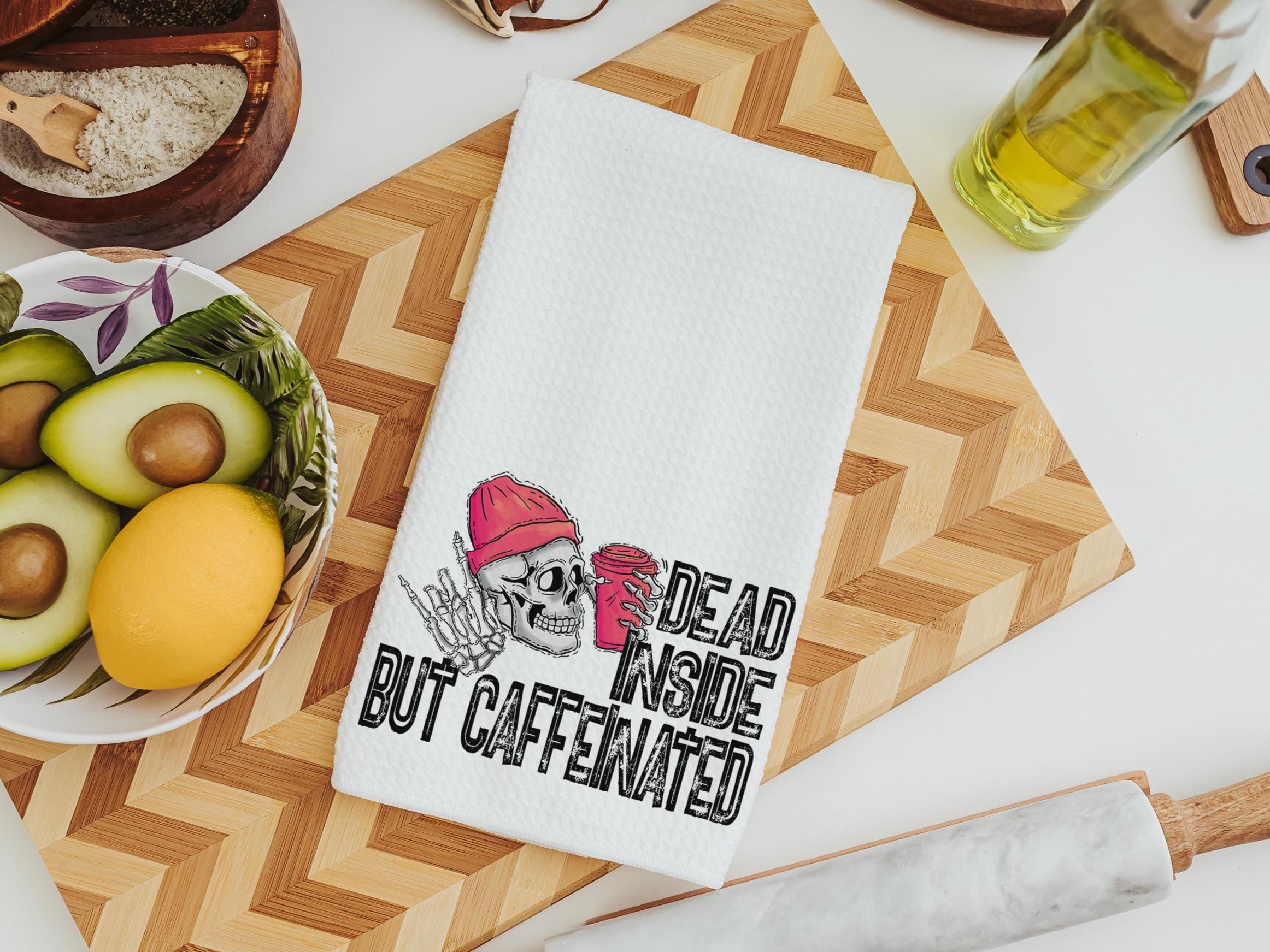 dead inside but caffeinated funny kitchen towels women gifts, coffee bar decor, sarcastic gifts for coworkers, coffee addict hand towels for