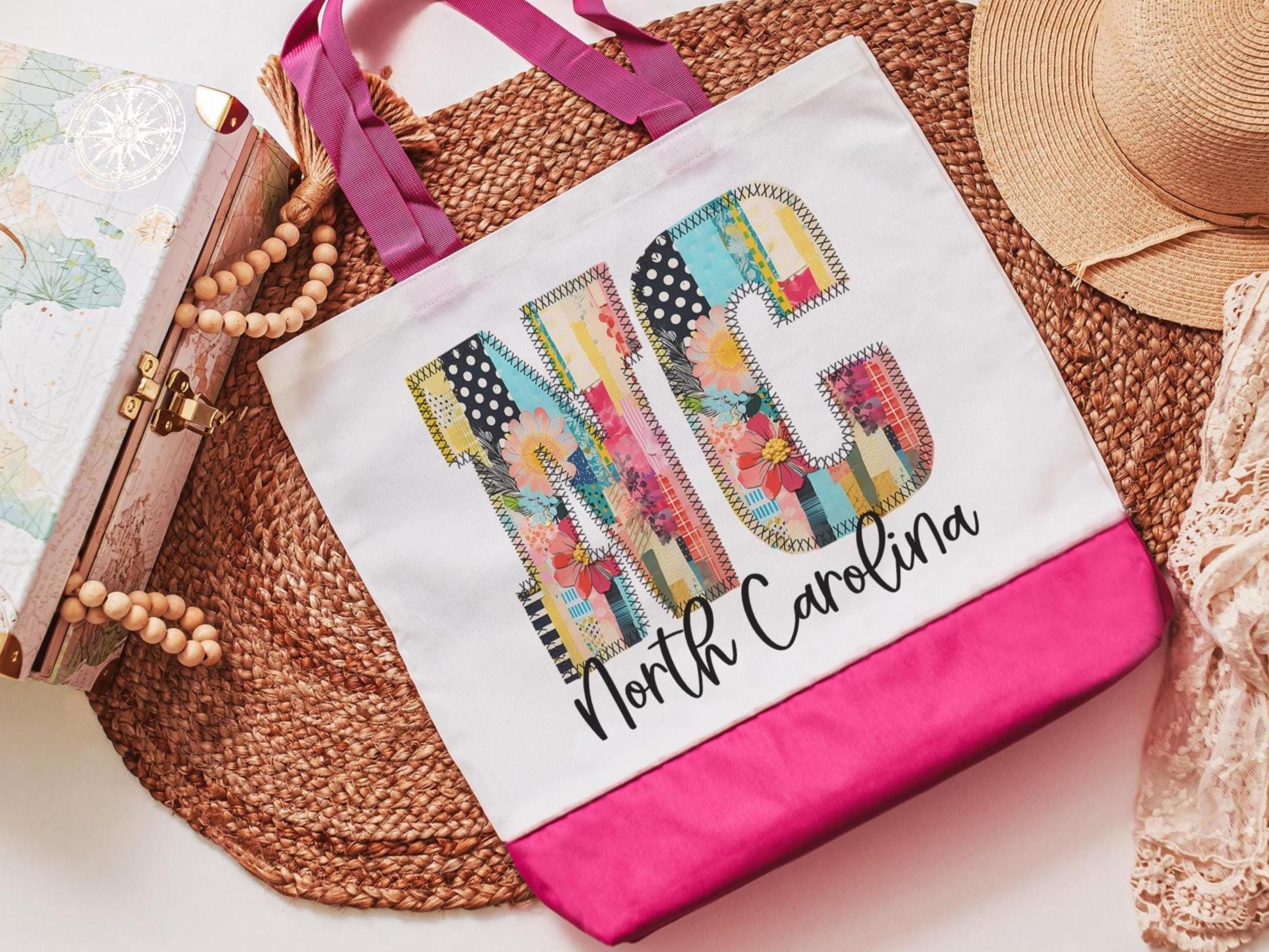 Show North Carolina pride with this faux patchwork NC tote bag, perfect for college, errands, or farmers market trips. A stylish and practical gift, it makes one of the best North Carolina Christmas gifts for realtors or a thoughtful everyday tote for women.
