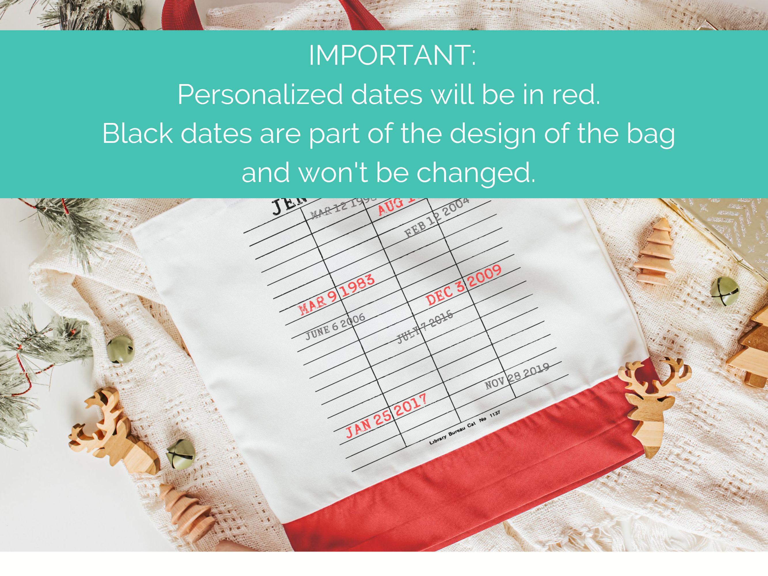 Celebrate her love of books with a personalized library due date tote bag, customized with special dates for a meaningful touch. Perfect for moms, grandmas, or avid readers, it makes a thoughtful bookish Christmas gift and a unique family keepsake she’ll use every day. IMPORTANT: Personalized dates will be in red. Black dates are part of the design of the pillow and won't be changed.