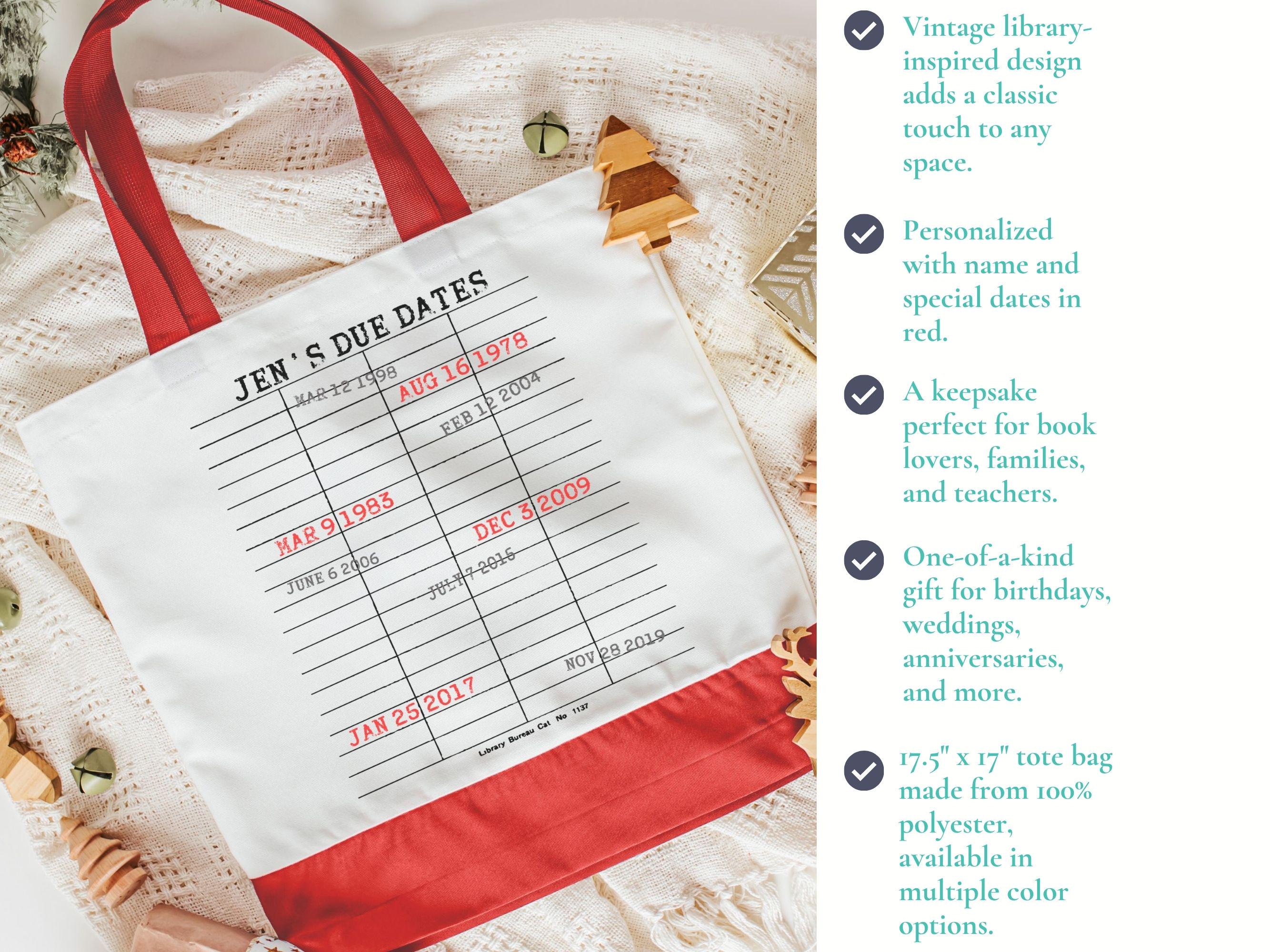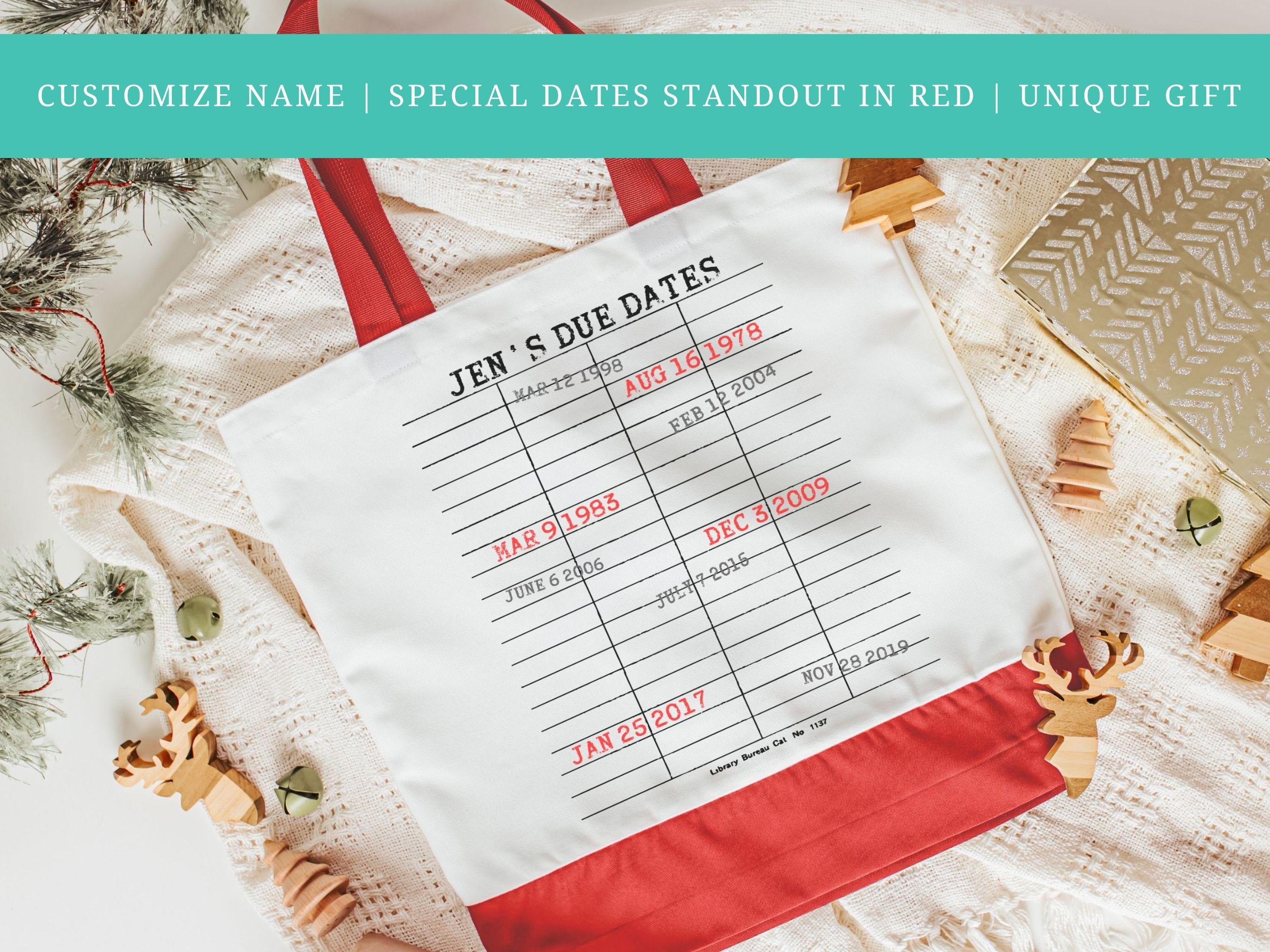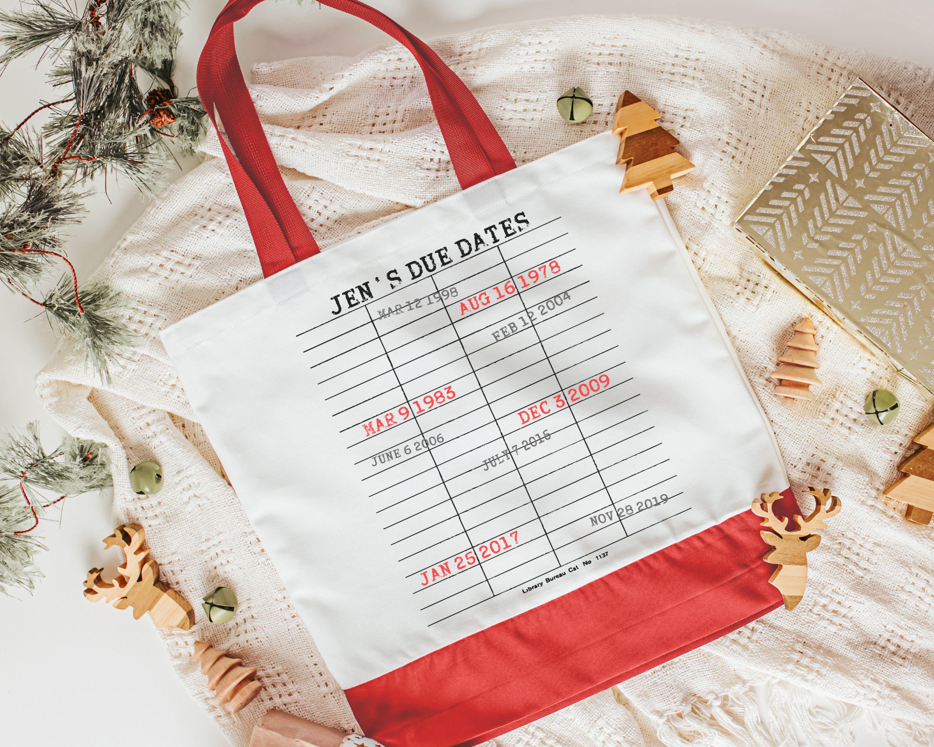 personalized library tote due date bag for moms, bookish Christmas gifts for family, custom book lover gift for women, special date gifts