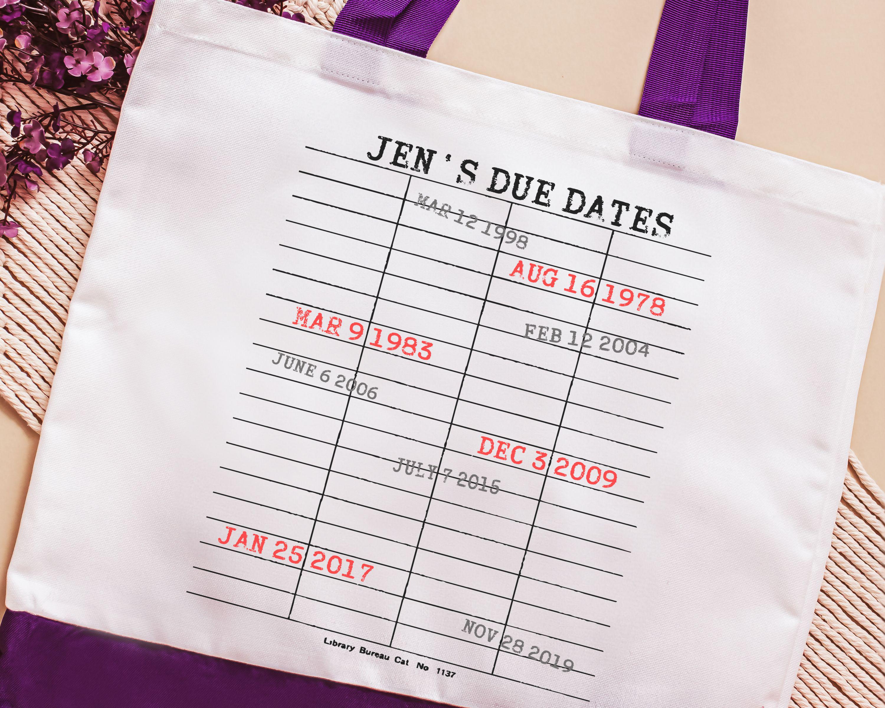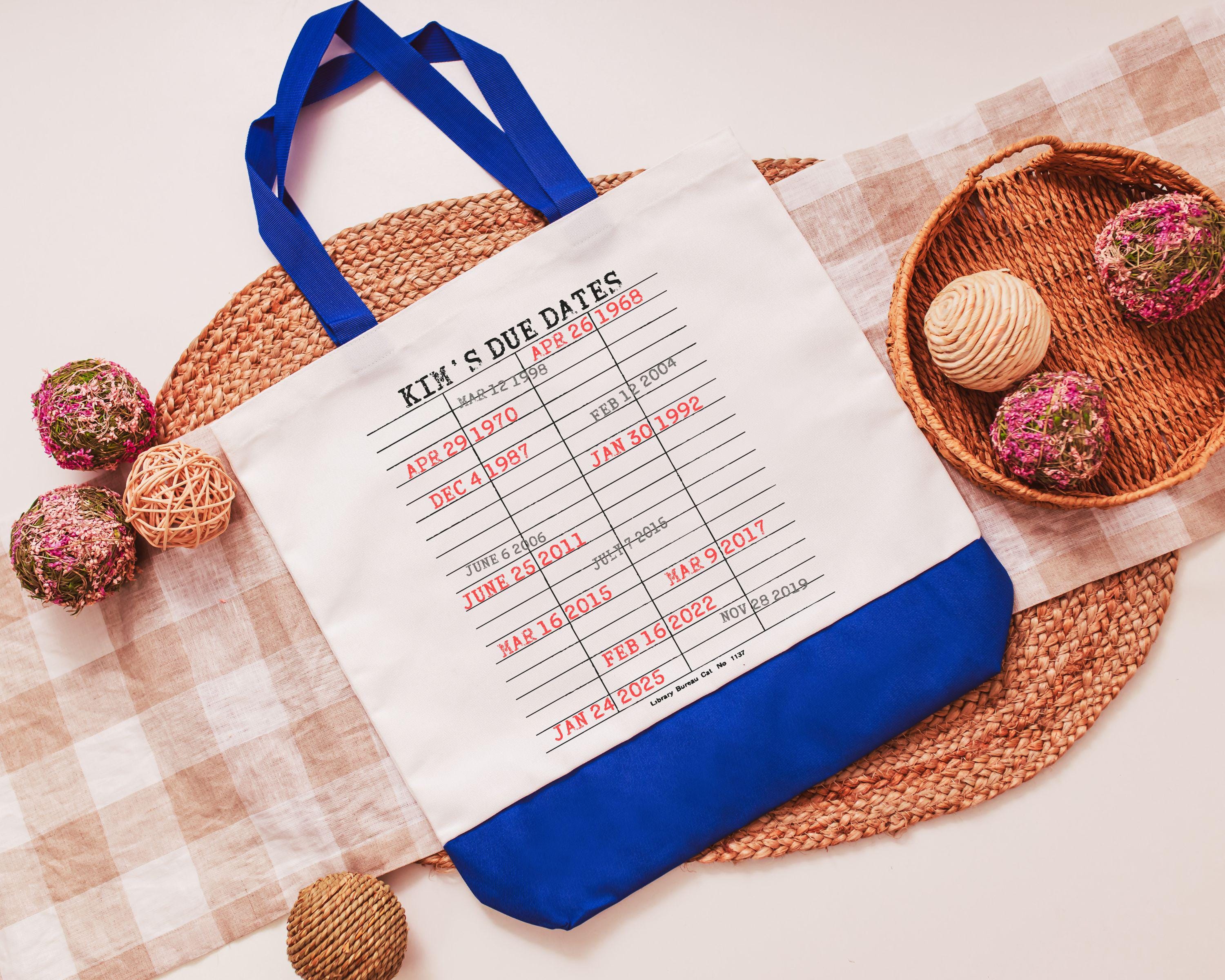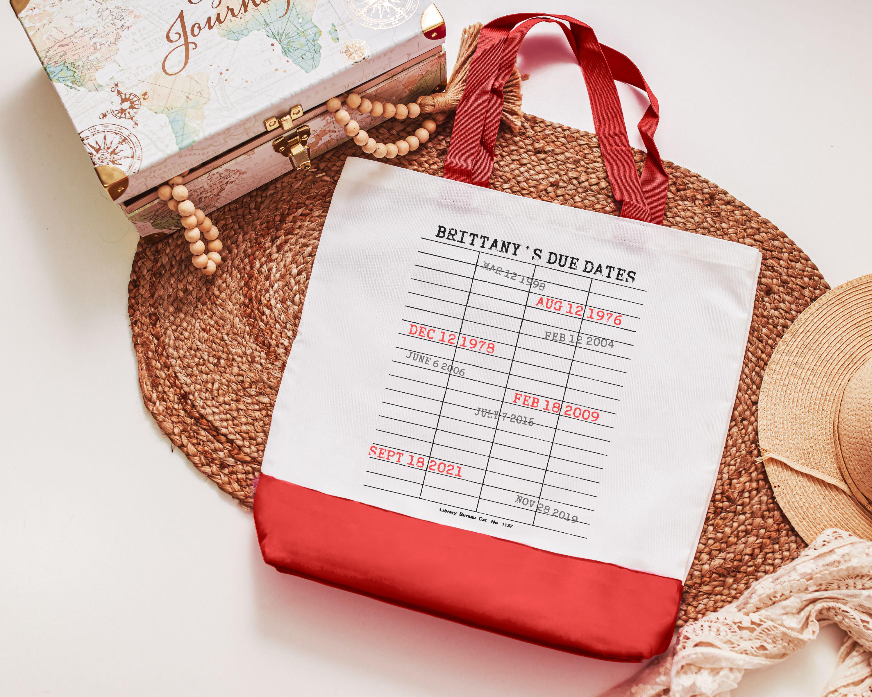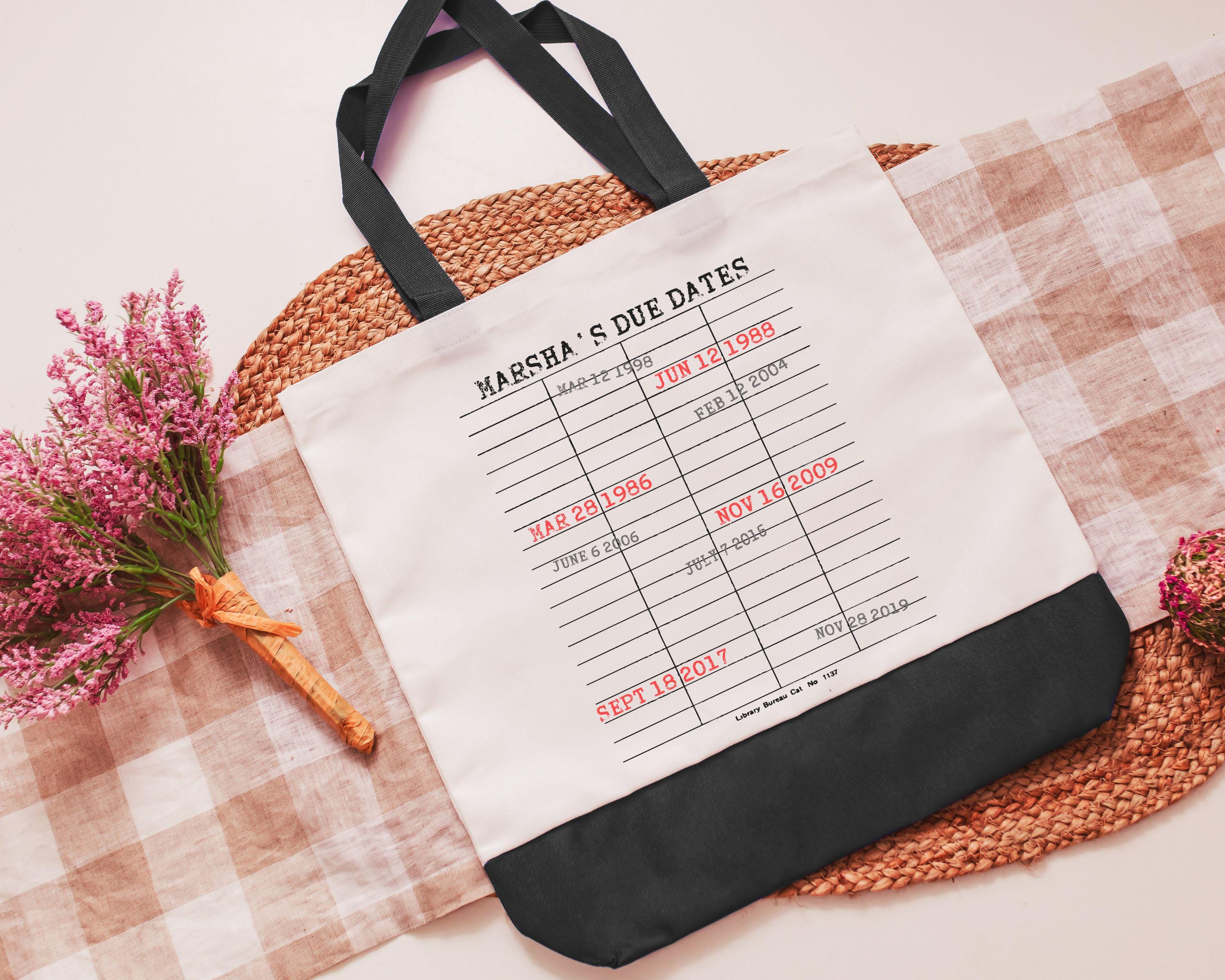 personalized library tote due date bag for moms, bookish Christmas gifts for family, custom book lover gift for women, special date gifts