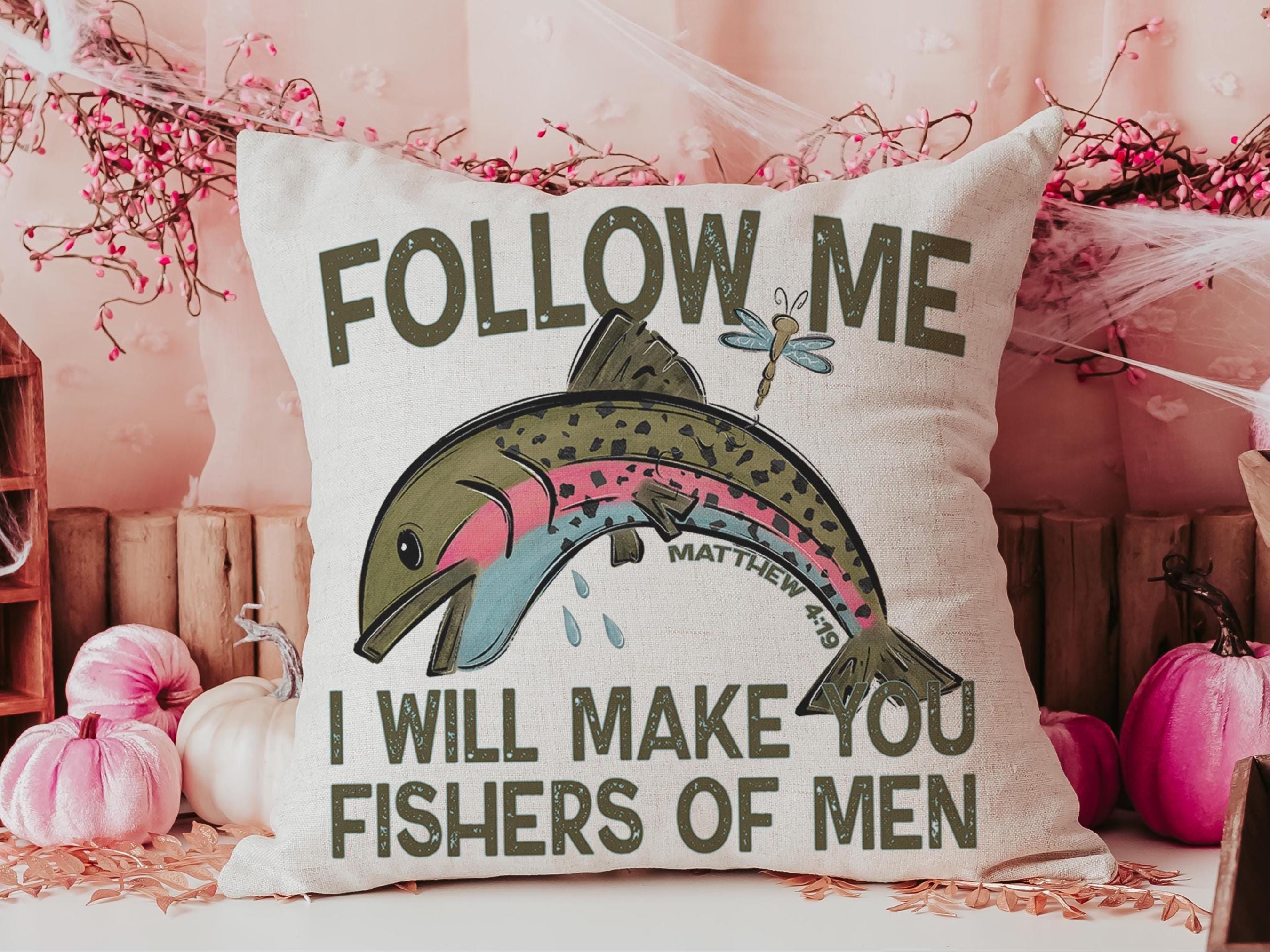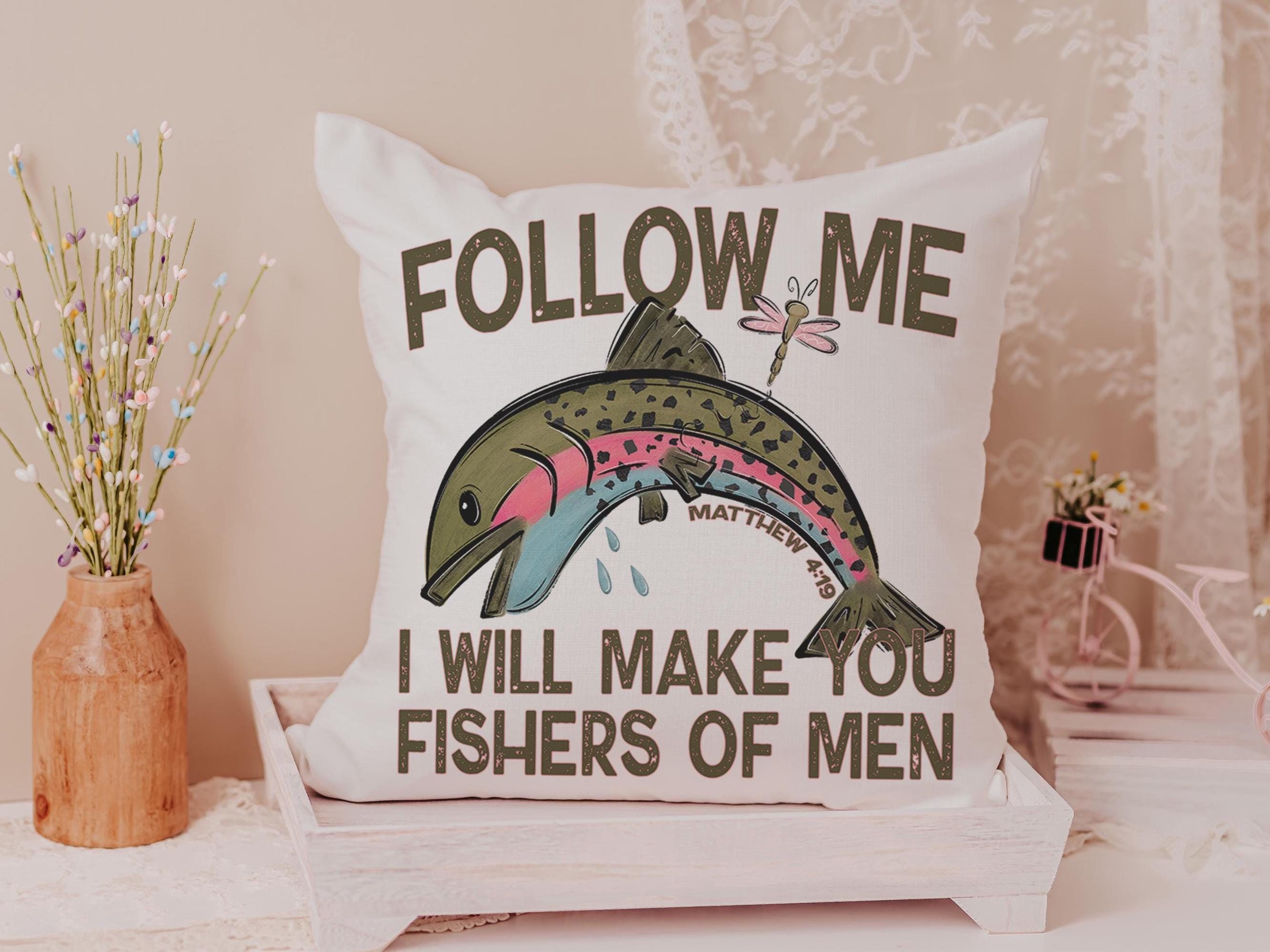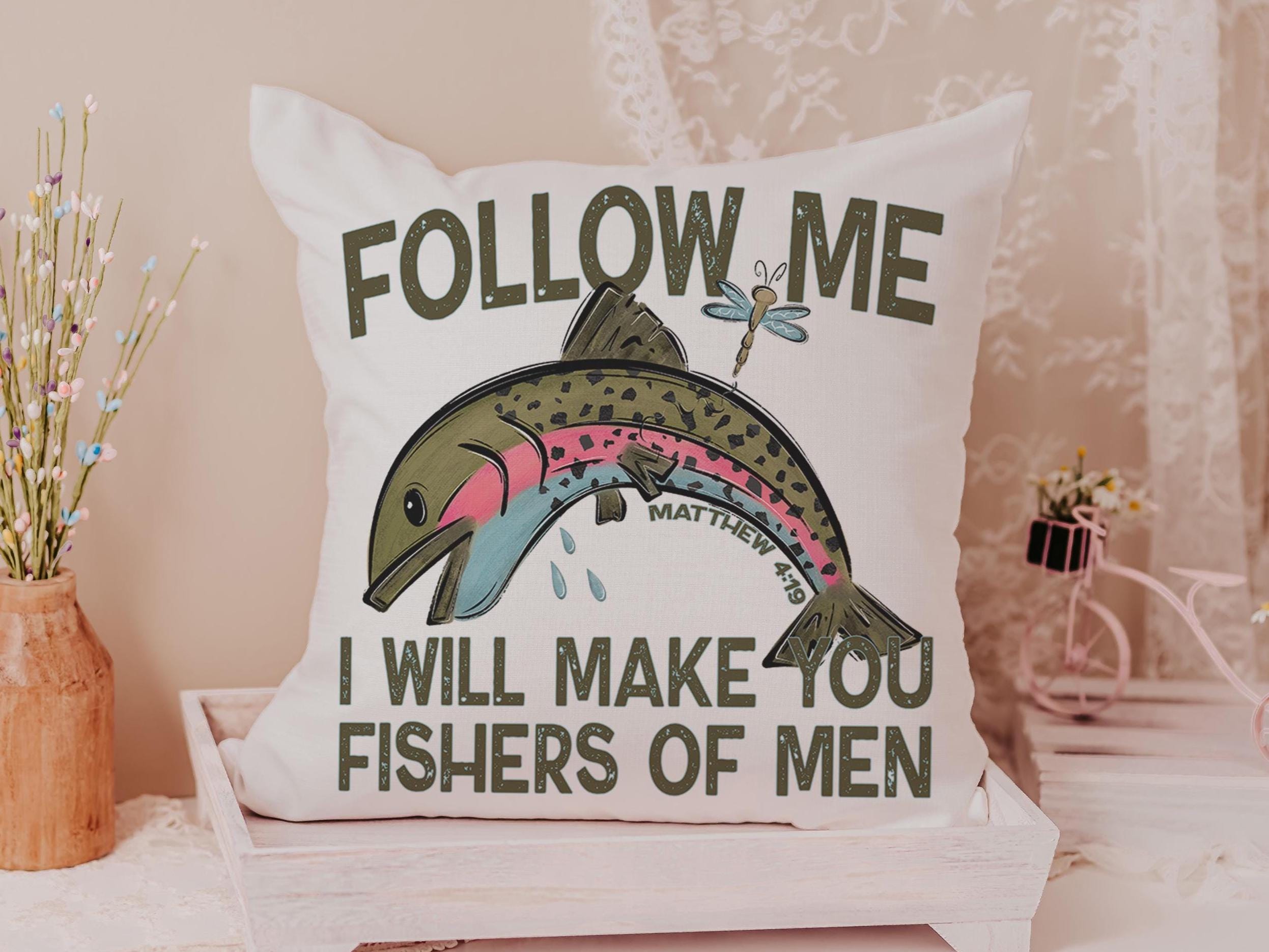 follow me fishers of men throw pillows for couch religious stocking stuffers for teens, rainbow trout outdoorsy nursery decor, Matthew 4:19