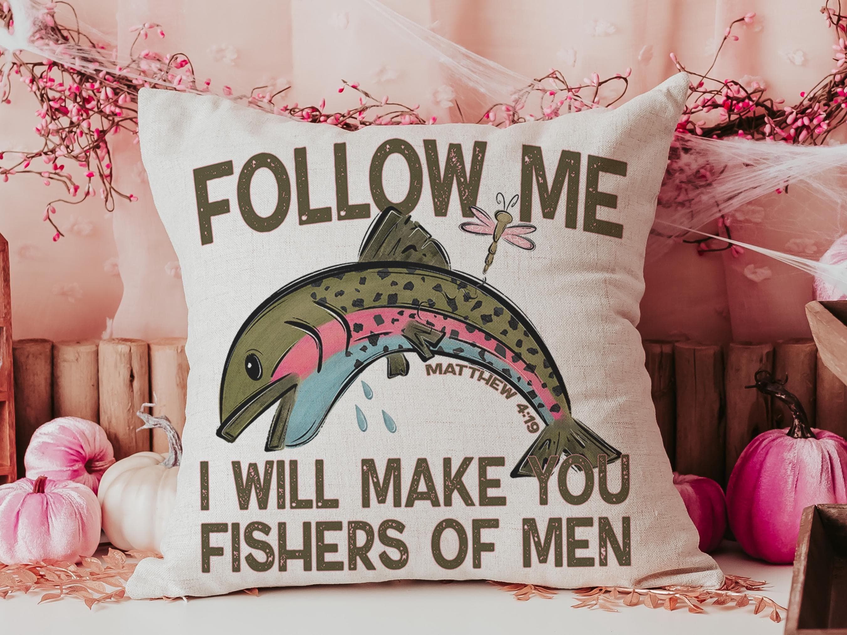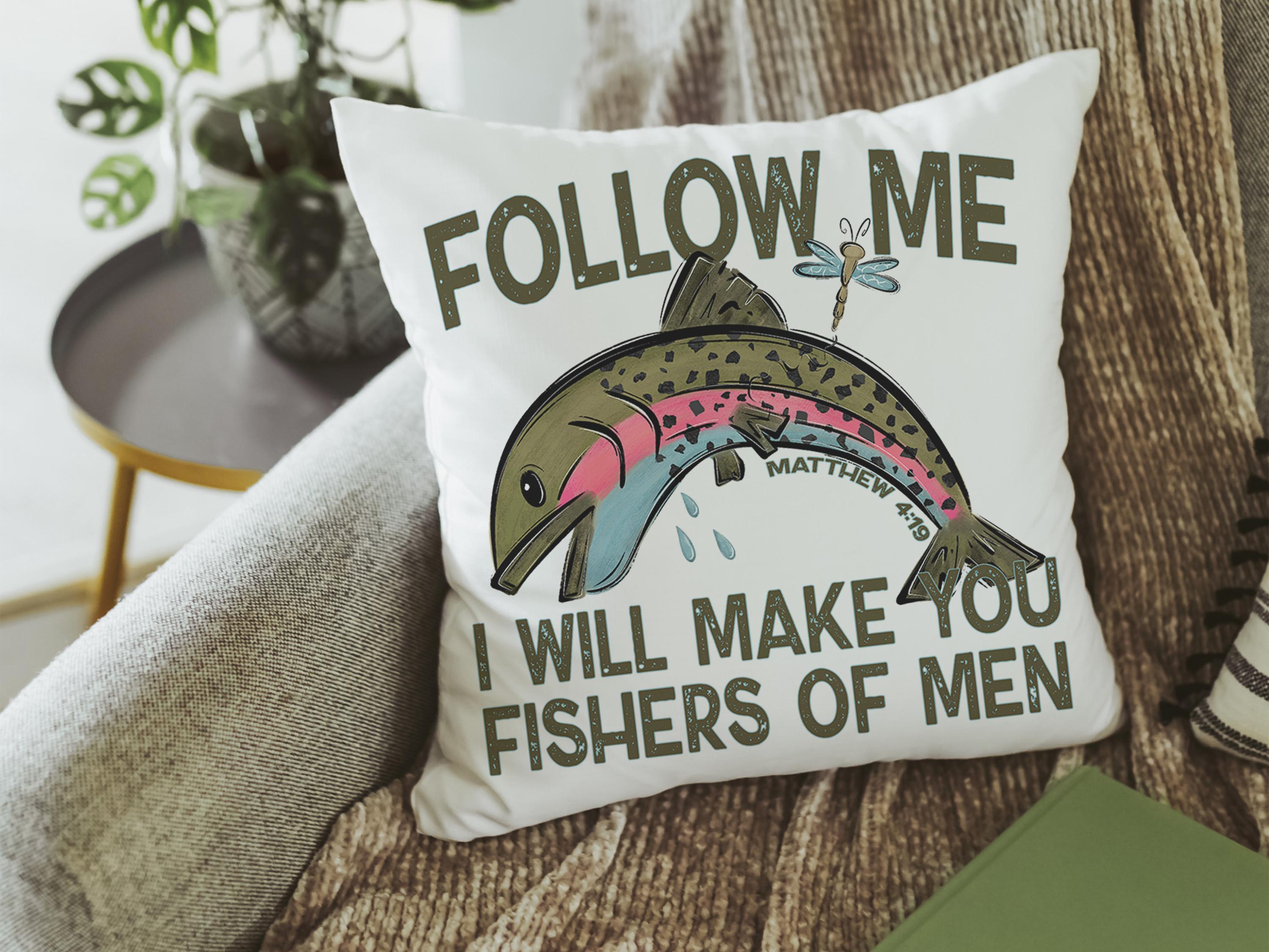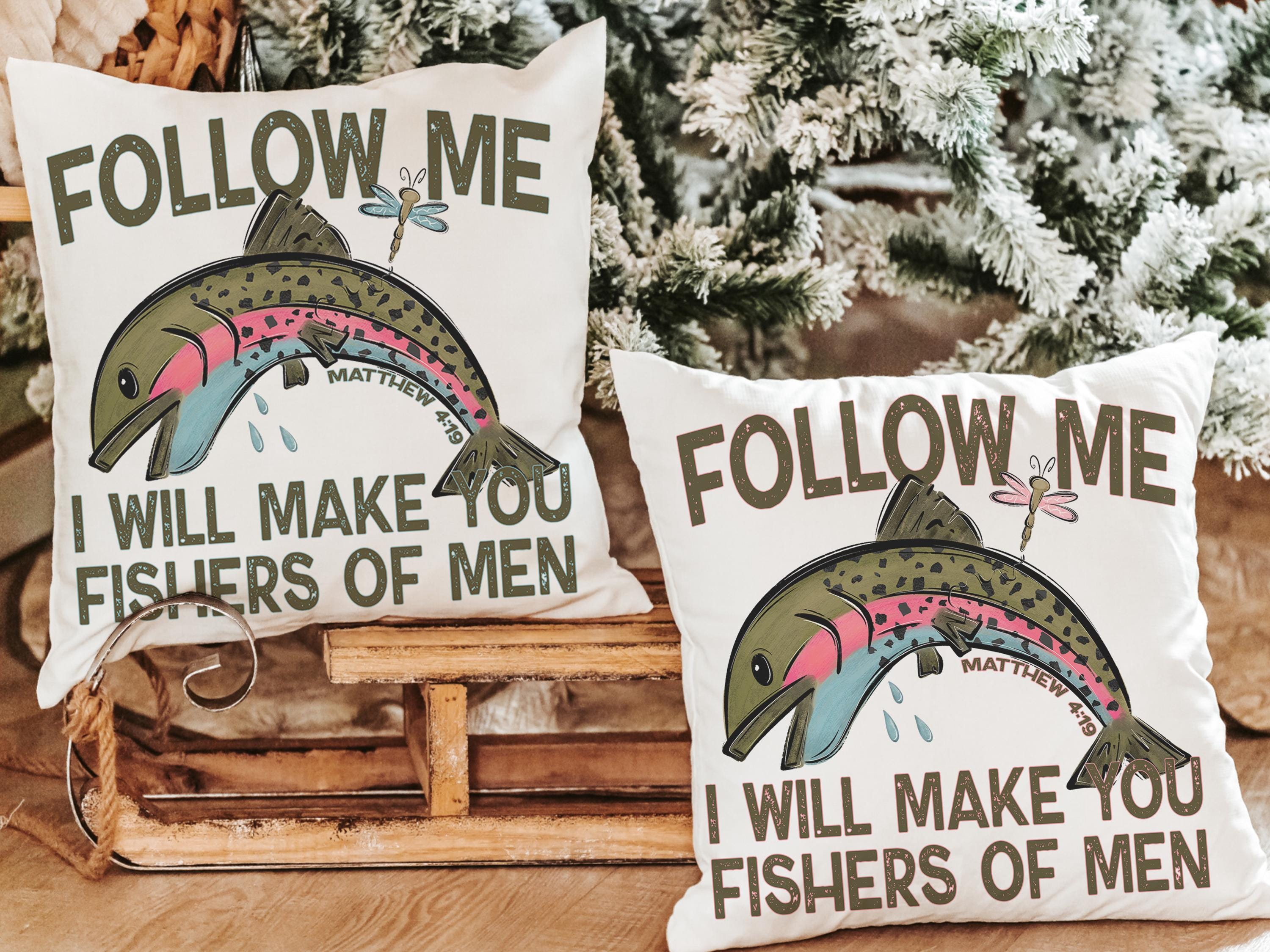 follow me fishers of men throw pillows for couch religious stocking stuffers for teens, rainbow trout outdoorsy nursery decor, Matthew 4:19