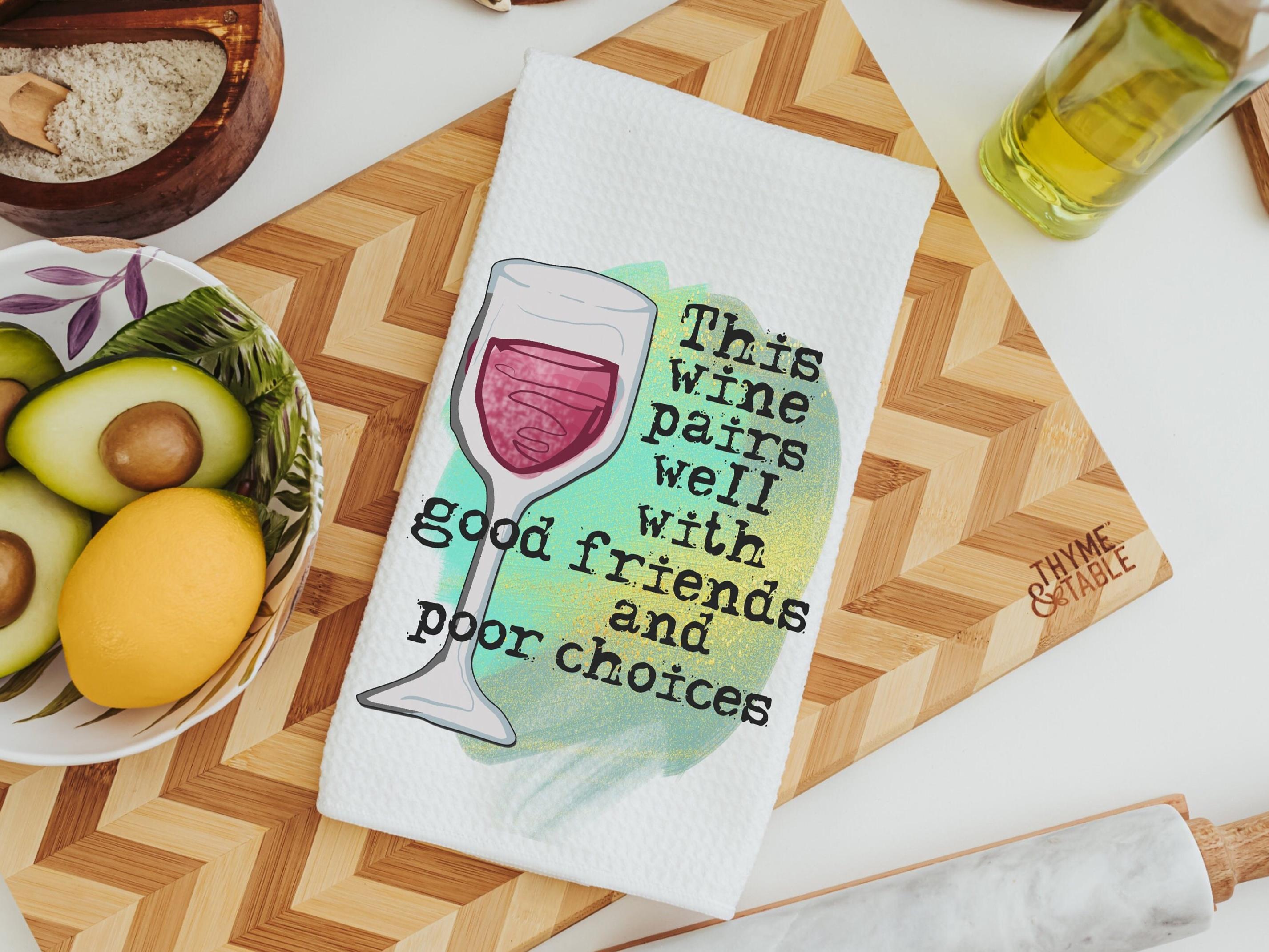 this wine pairs well with home bar towel, wine Christmas gifts for neighbors, good friends bad choices wine kitchen decor, funny kitchen
