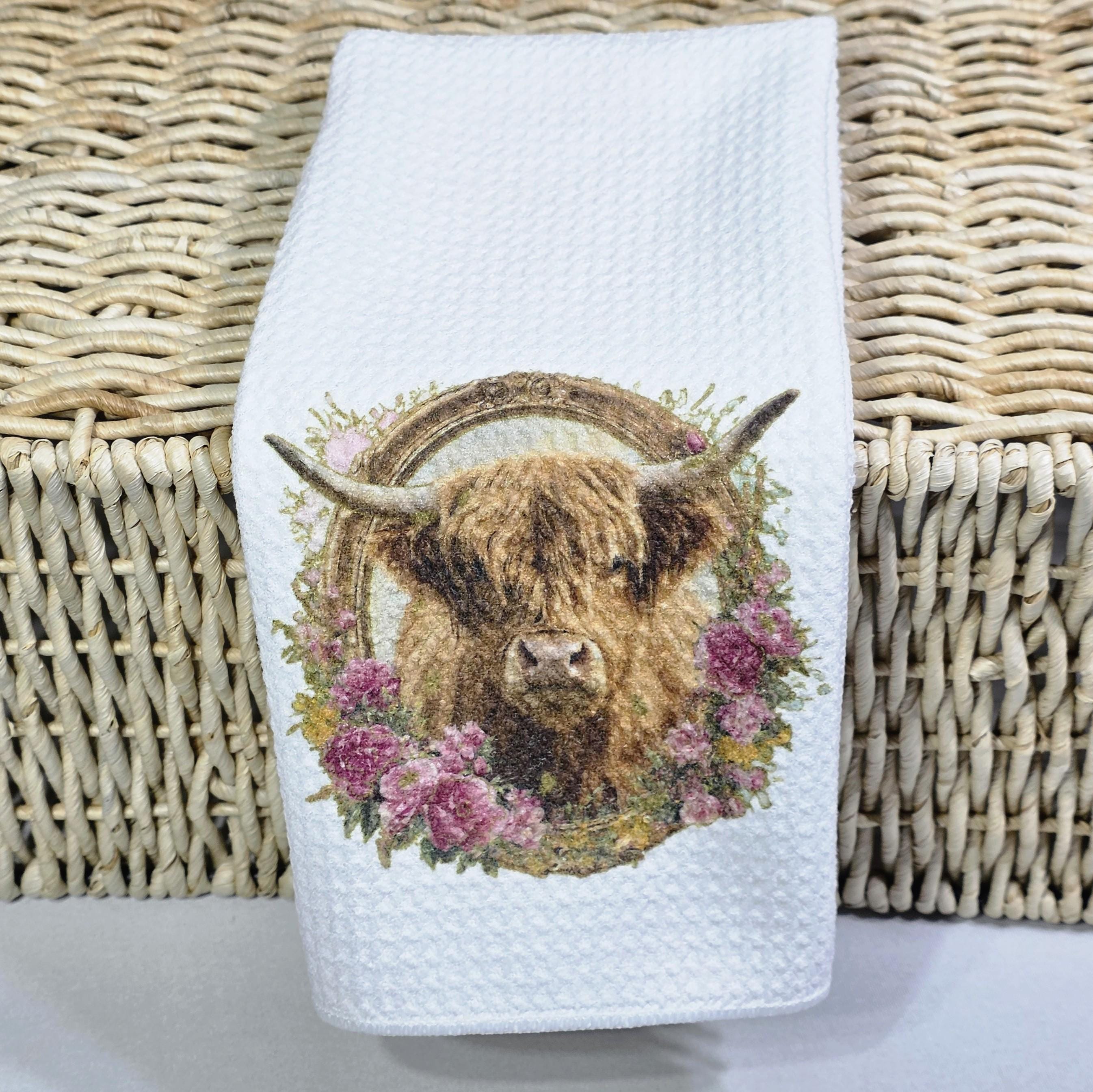 shaggy cow kitchen towels for Christmas gifts for neighbors, highland cow kitchen decor, floral cow gifts for cow lovers, secret Santa gifts