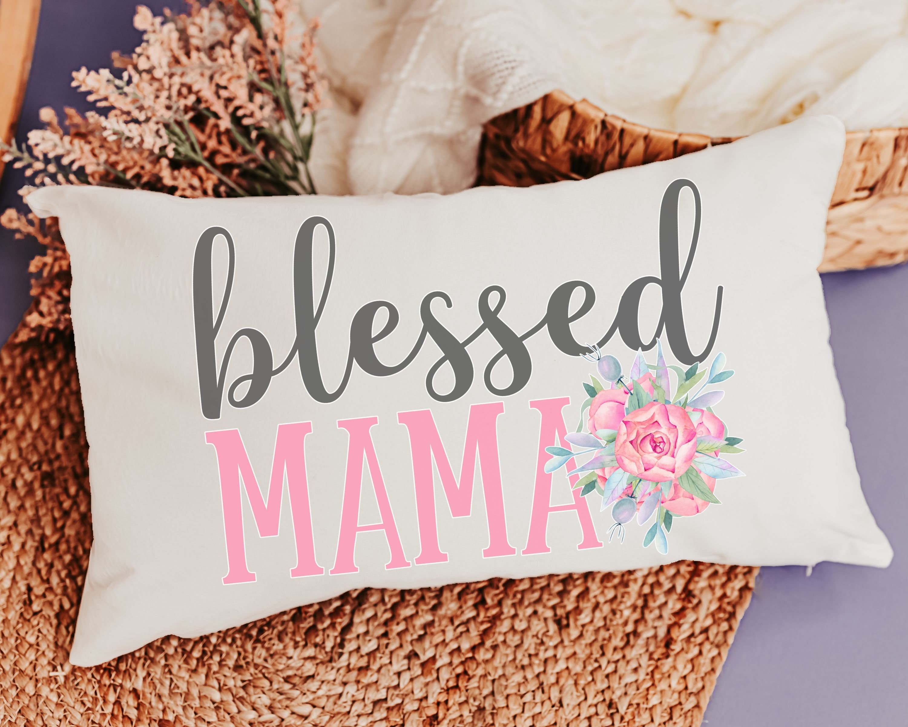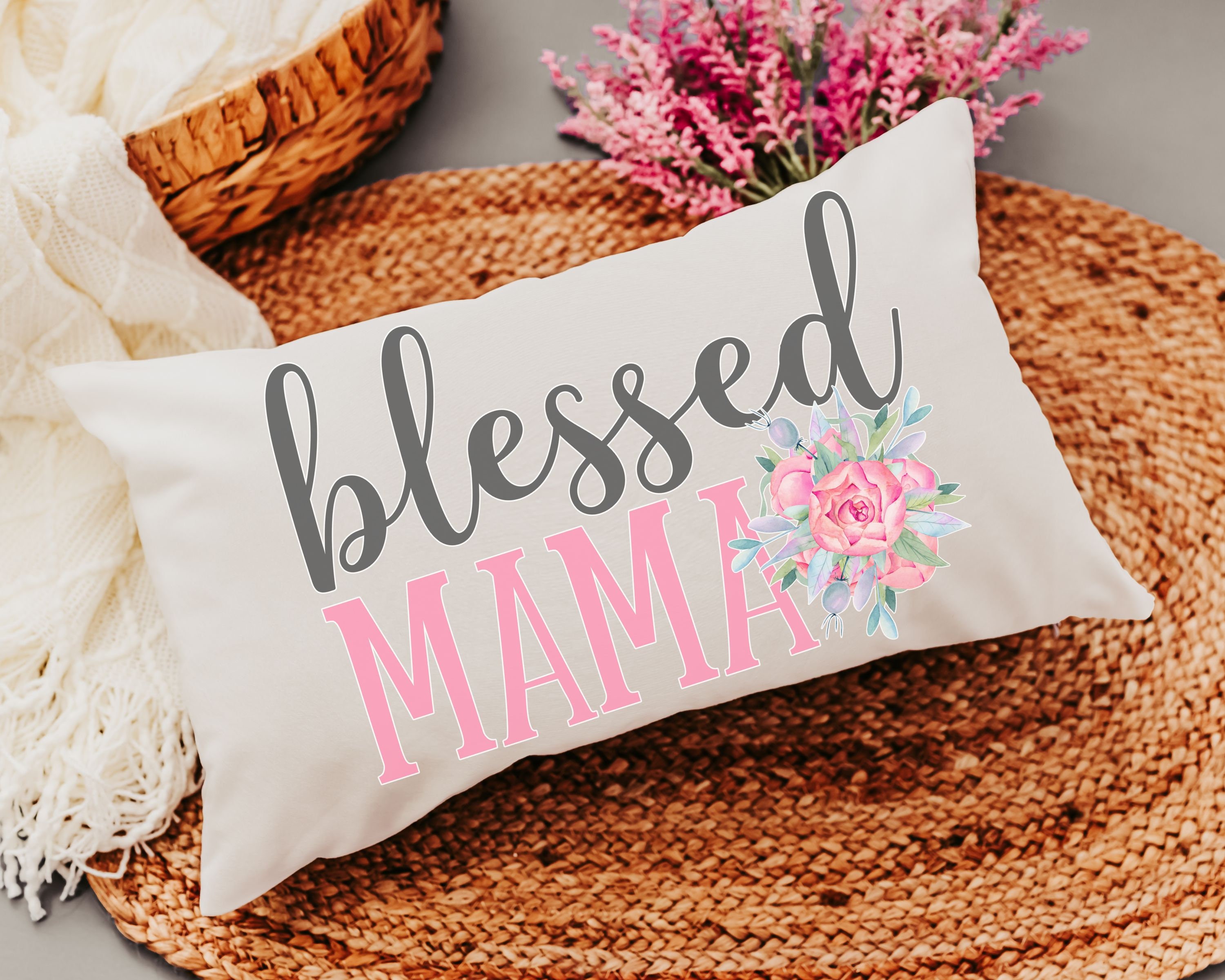Bring faith-inspired charm to your space with this Blessed Mama blush pink floral lumbar pillow. A beautiful Christian Christmas gift for new moms, stepmoms, or mothers-in-law — and a beautiful accent for any couch or reading nook.