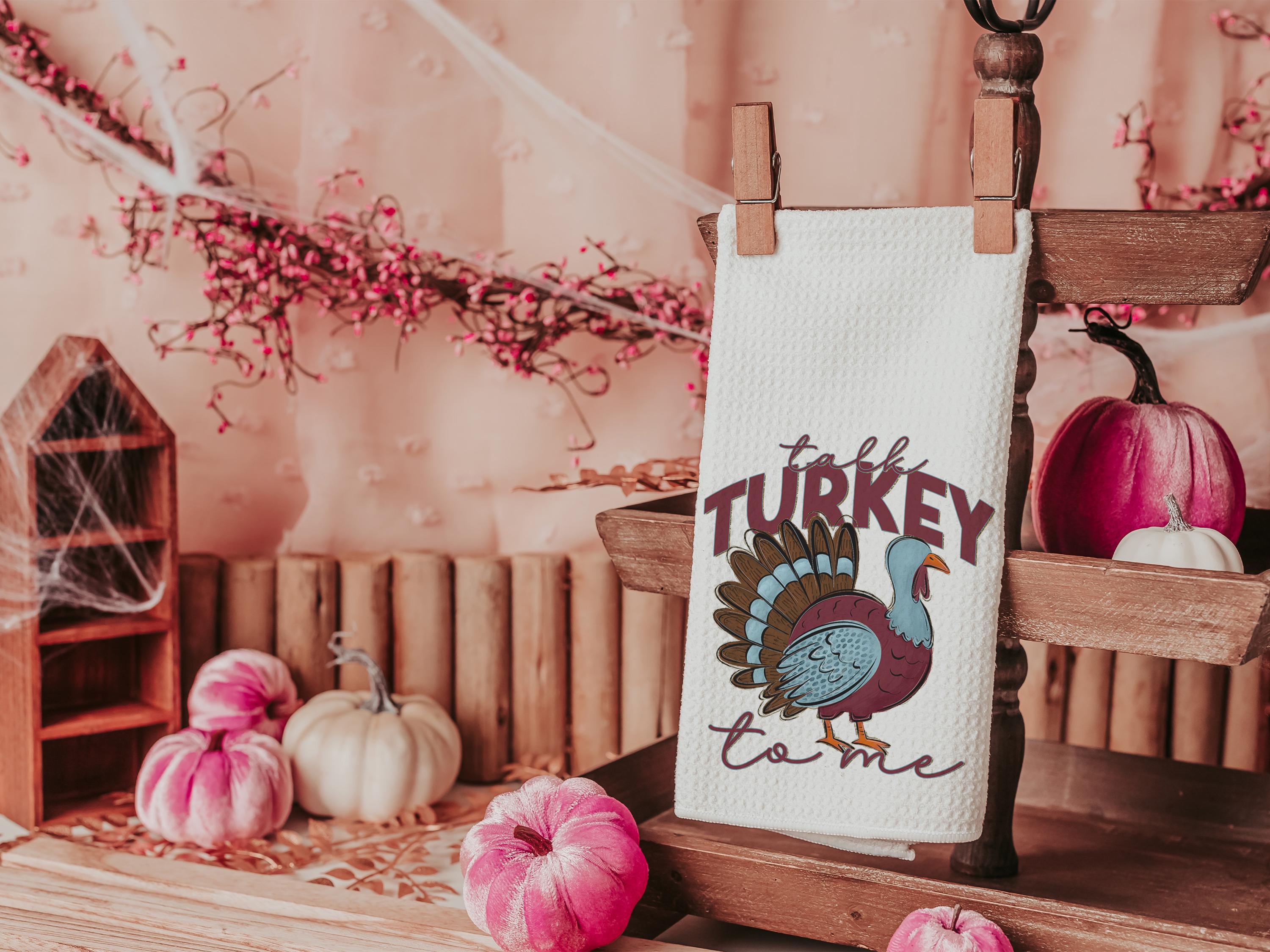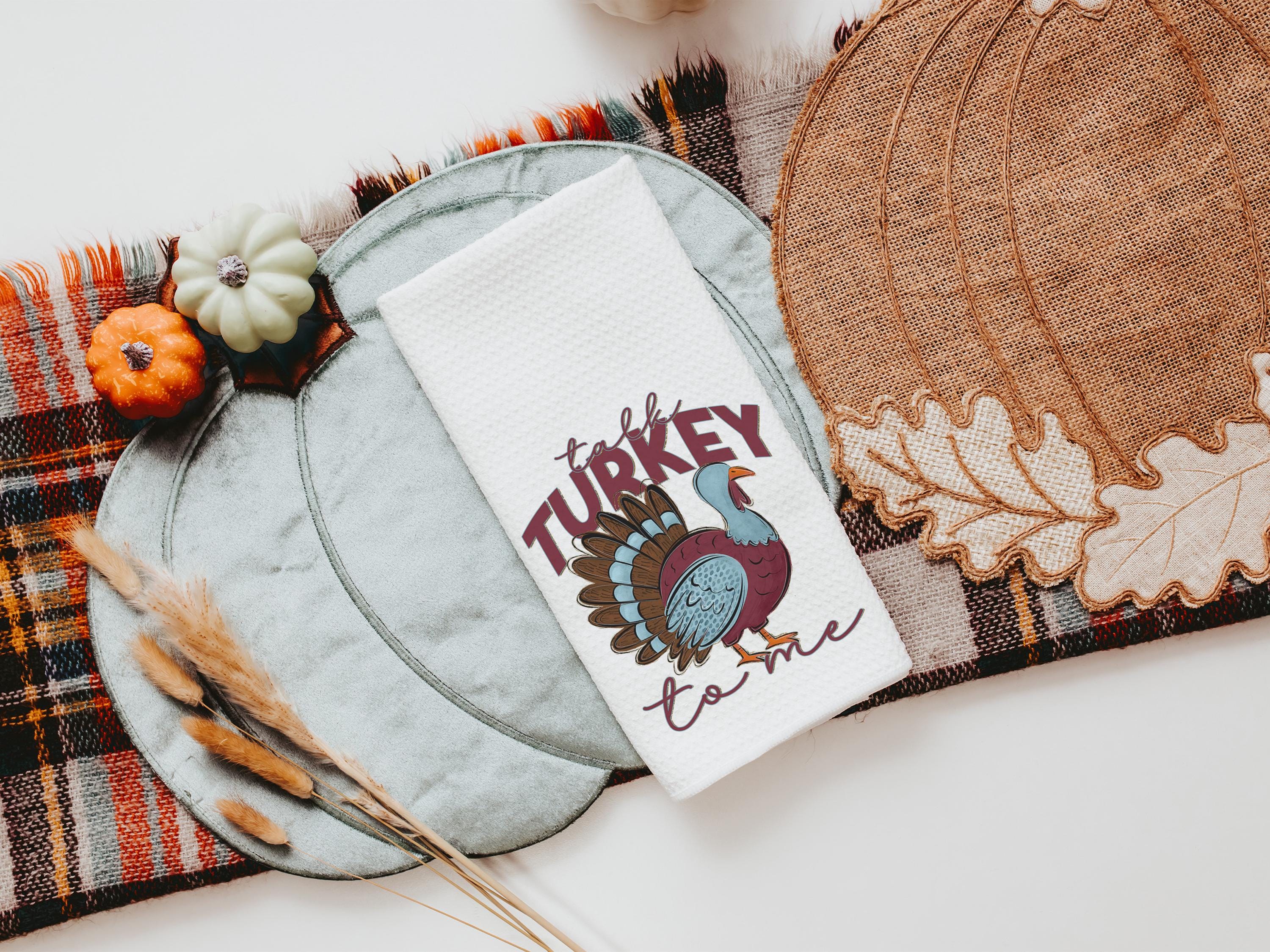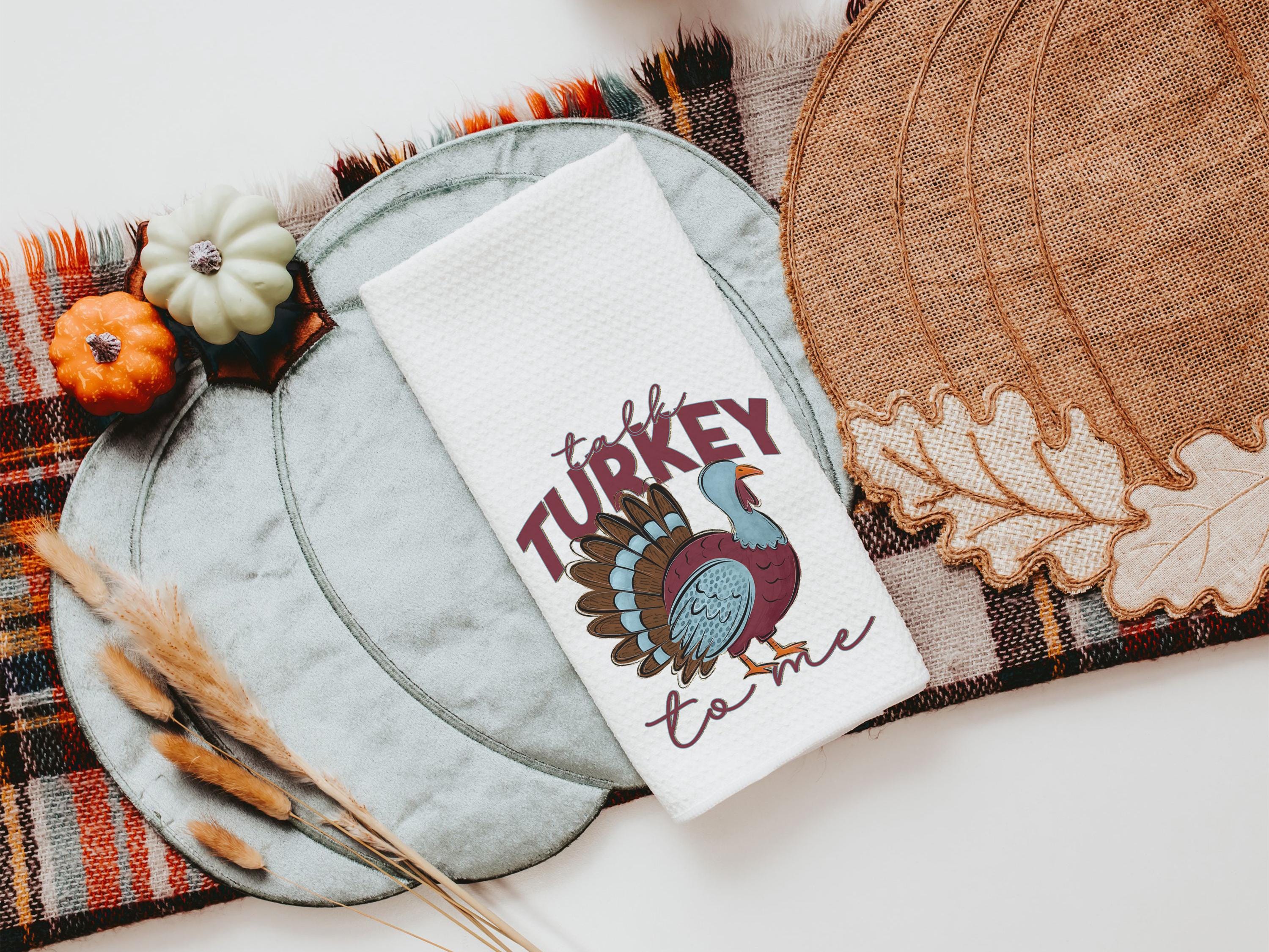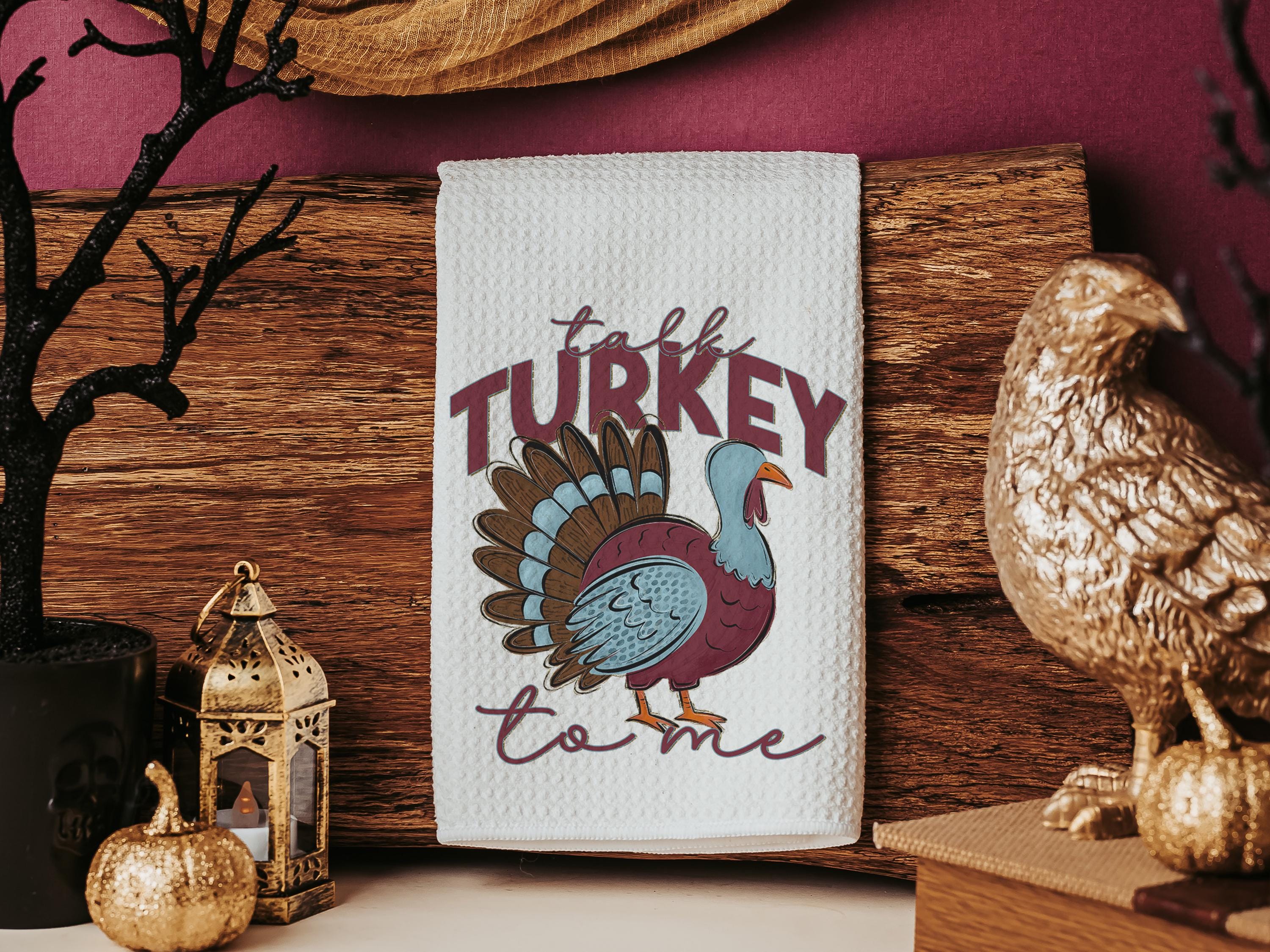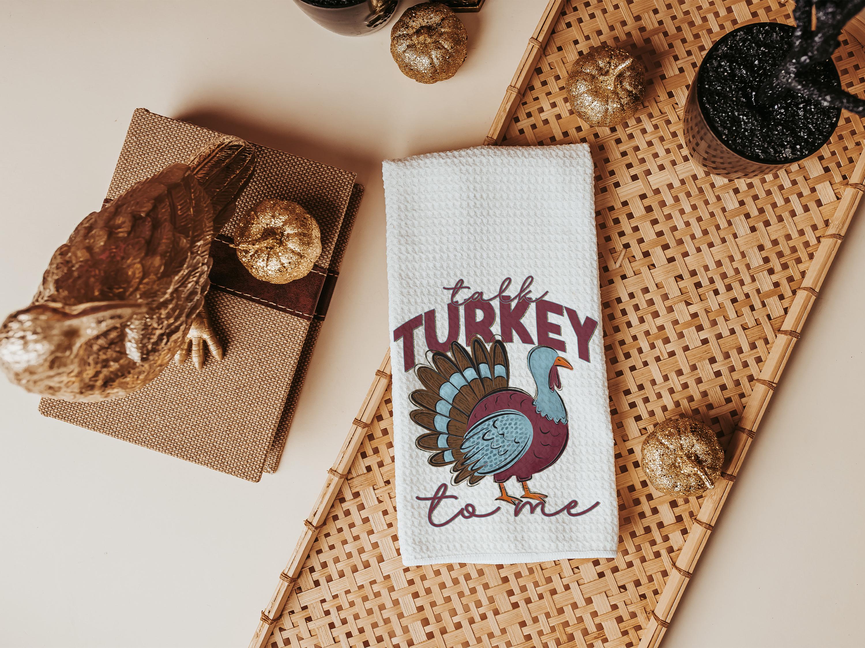 talk turkey to me Thanksgiving kitchen towels for fall, turkey day hand towels for autumn, Friendsgiving gifts for girlfriends, funny gifts