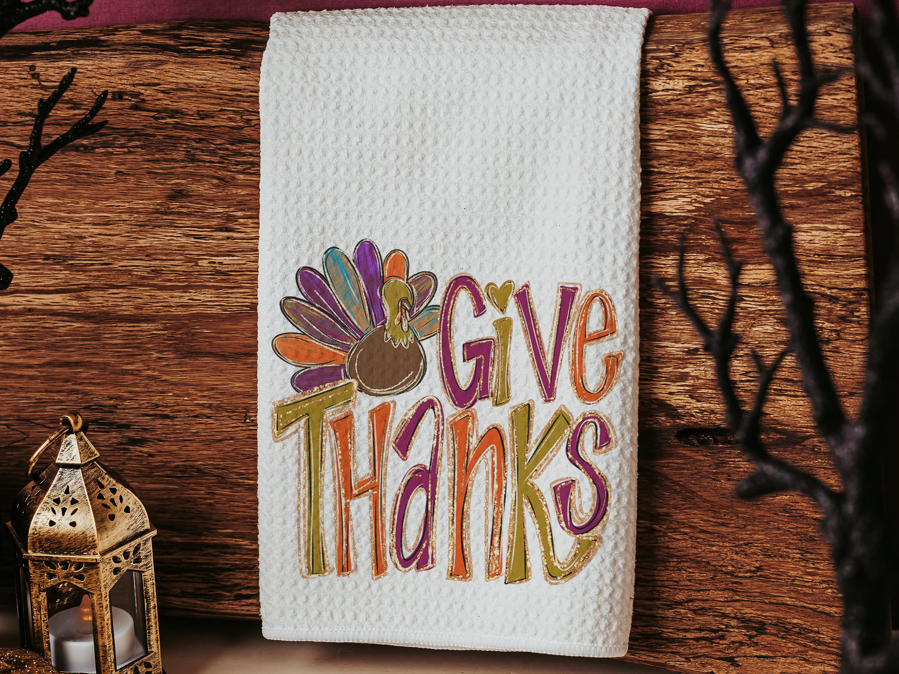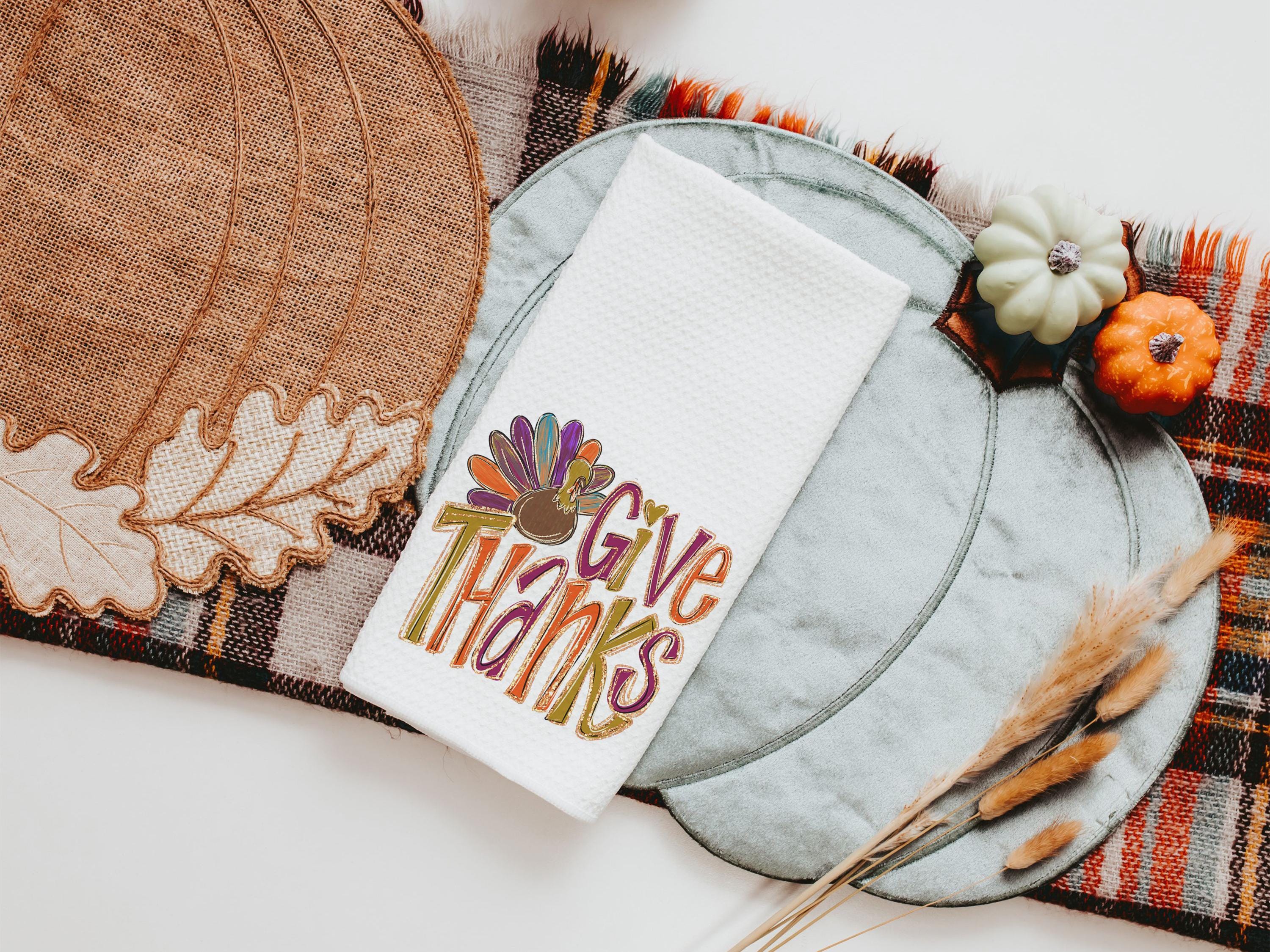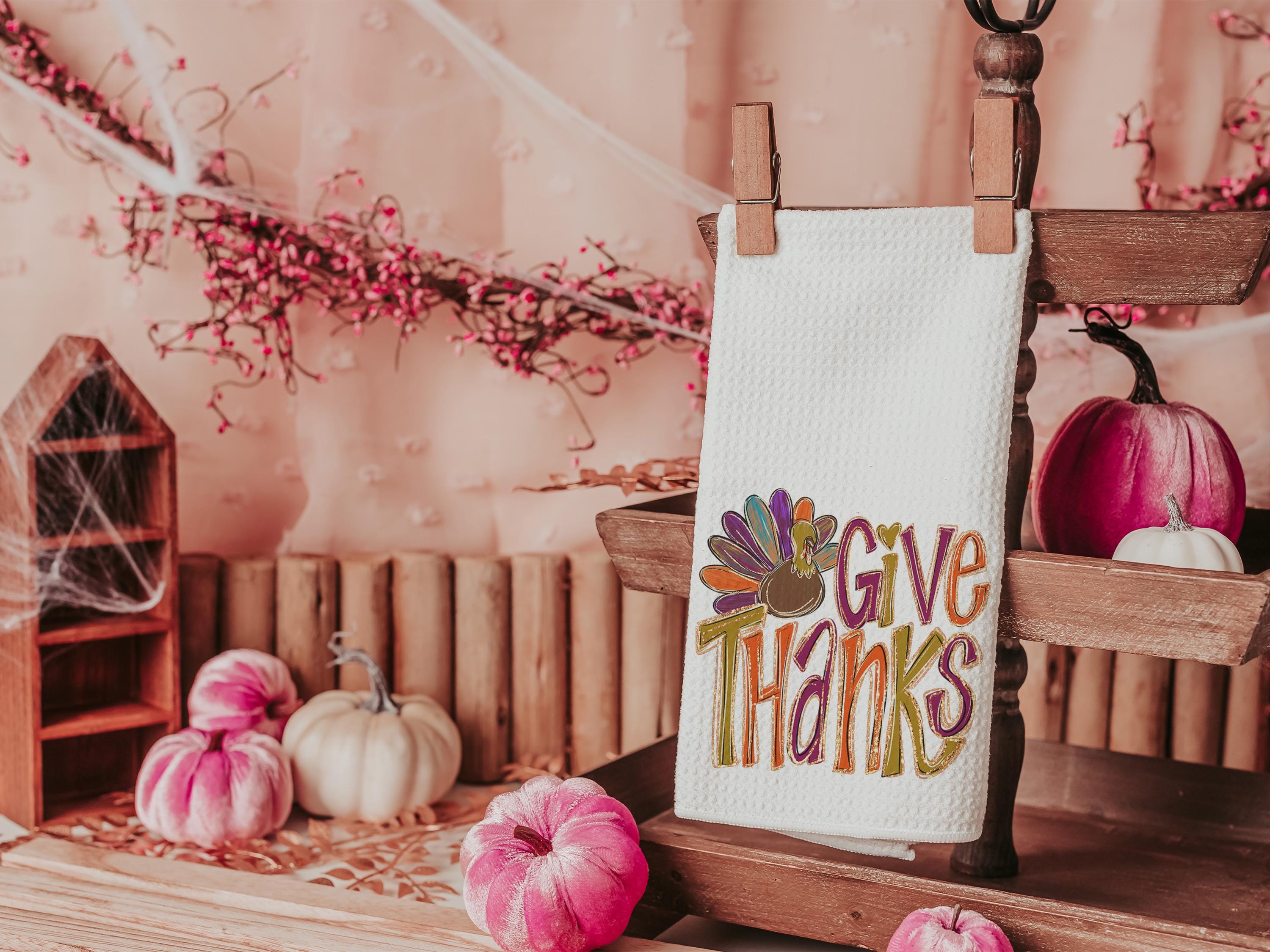 give thanks Thanksgiving kitchen towels for fall, cute turkey thankful hand towels for autumn, Friendsgiving gifts for girlfriends, colorful