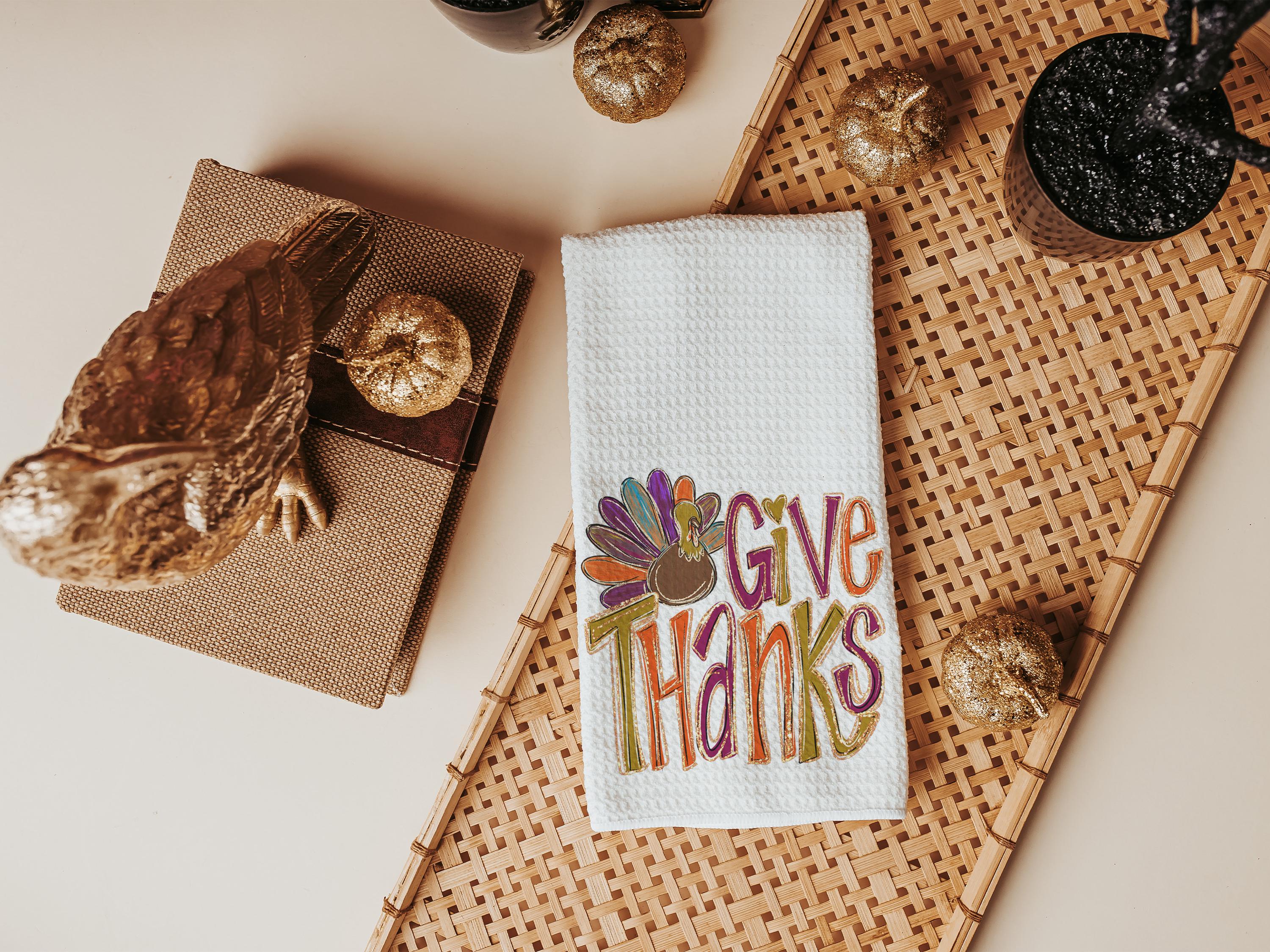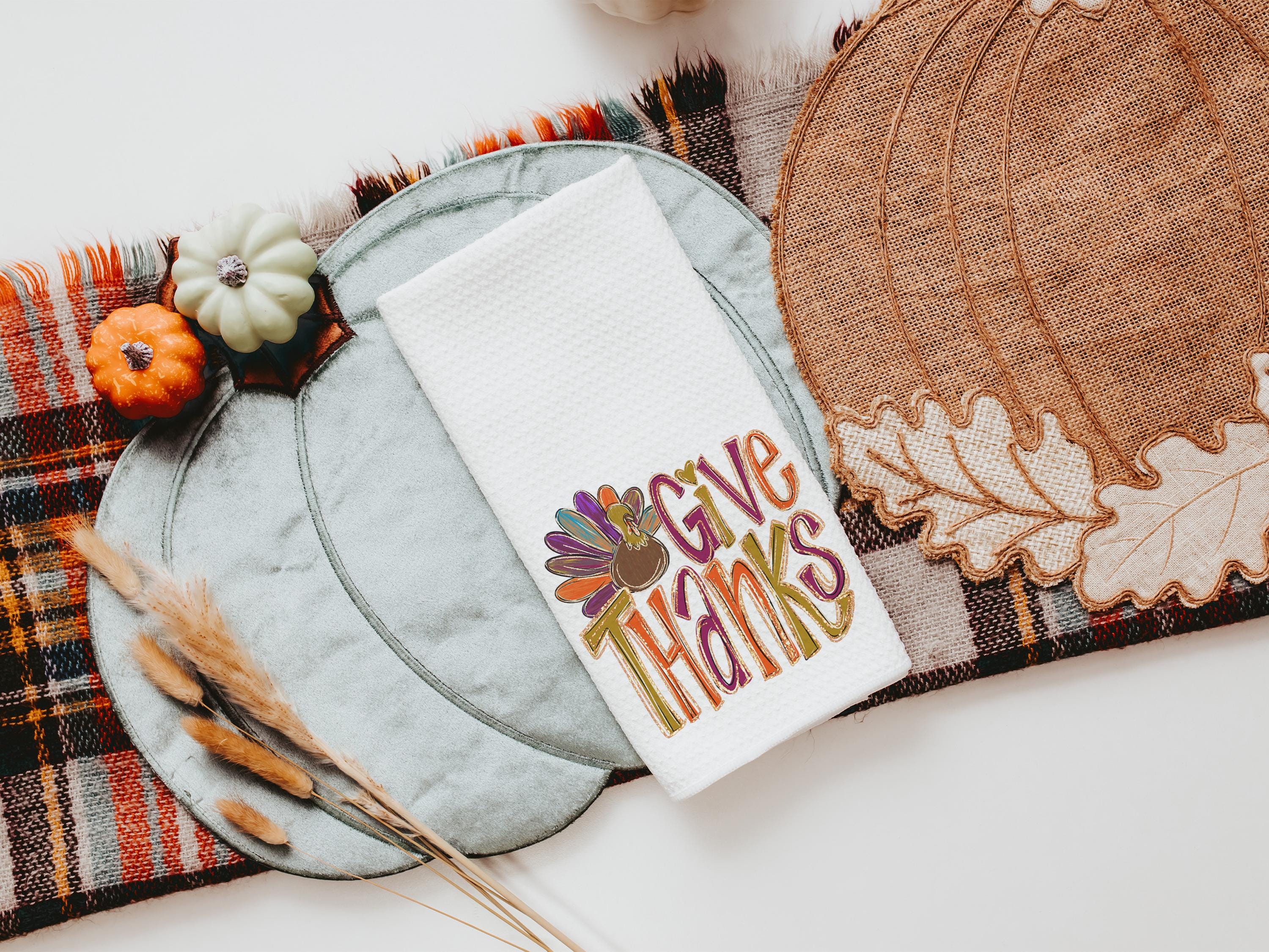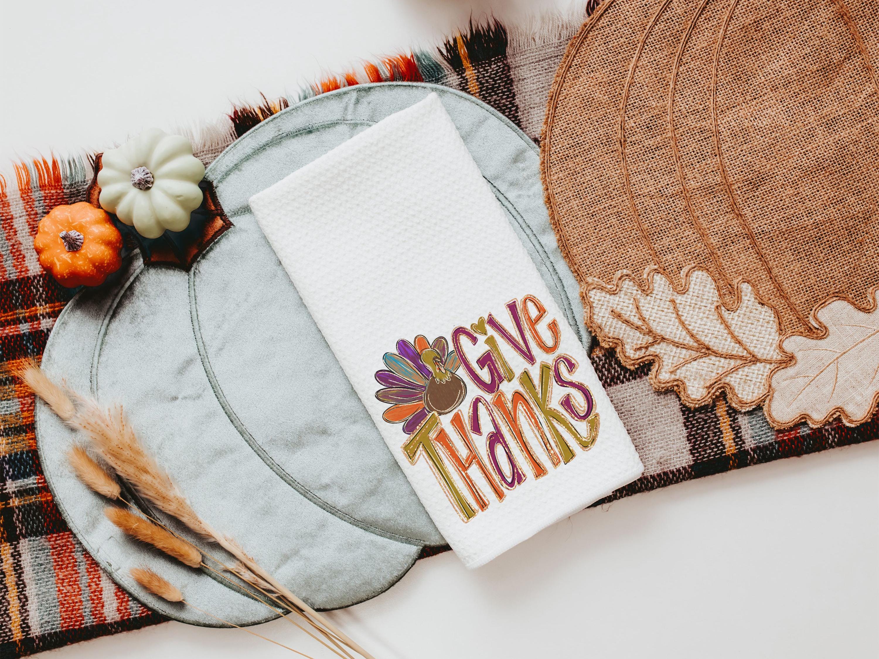 give thanks Thanksgiving kitchen towels for fall, cute turkey thankful hand towels for autumn, Friendsgiving gifts for girlfriends, colorful