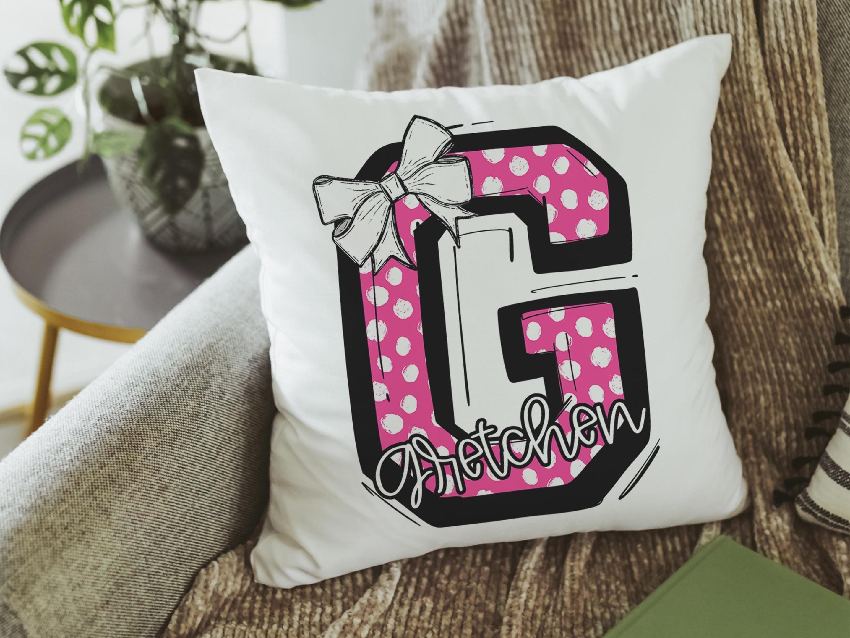 Our personalized initial throw pillows bring a hot-pink touch to nurseries, teen rooms, and tween spaces, making them an easy choice for secret Santa, coquette-style Christmas gifts, or anyone who loves fun name-based decor.