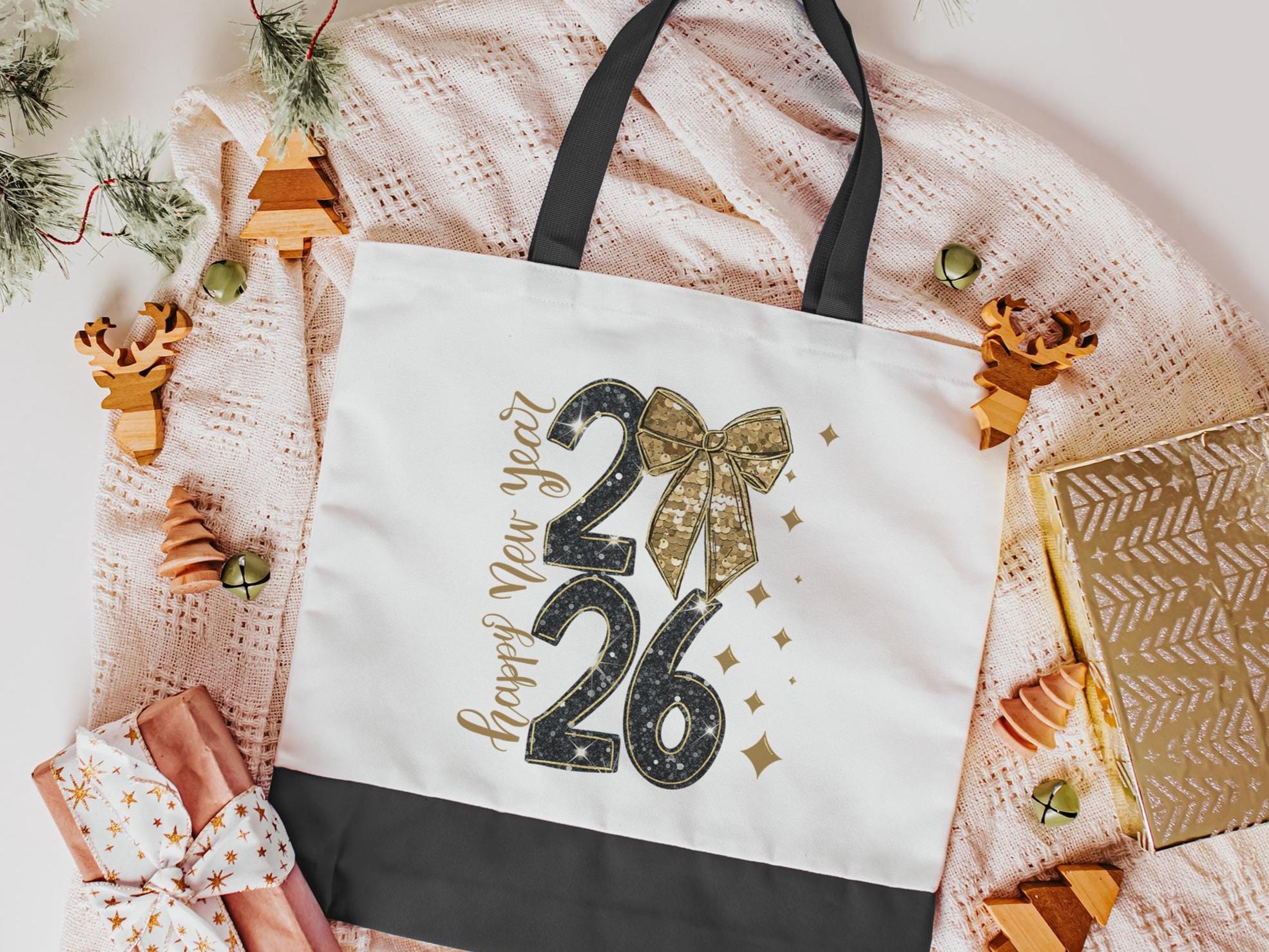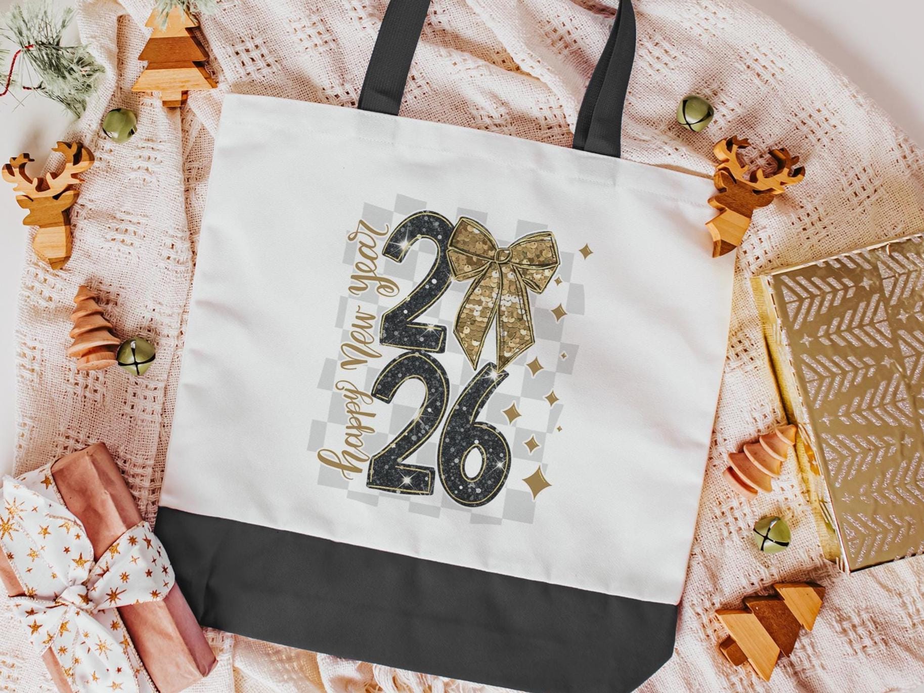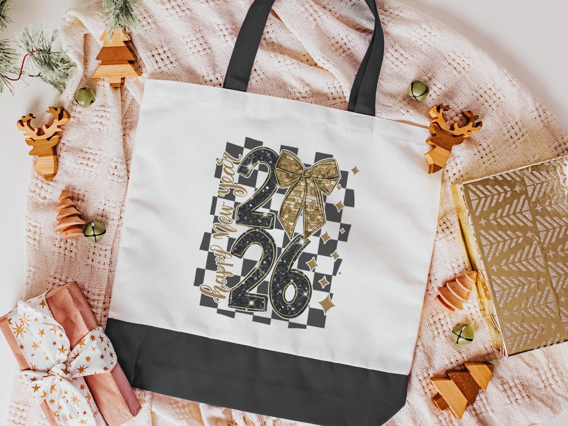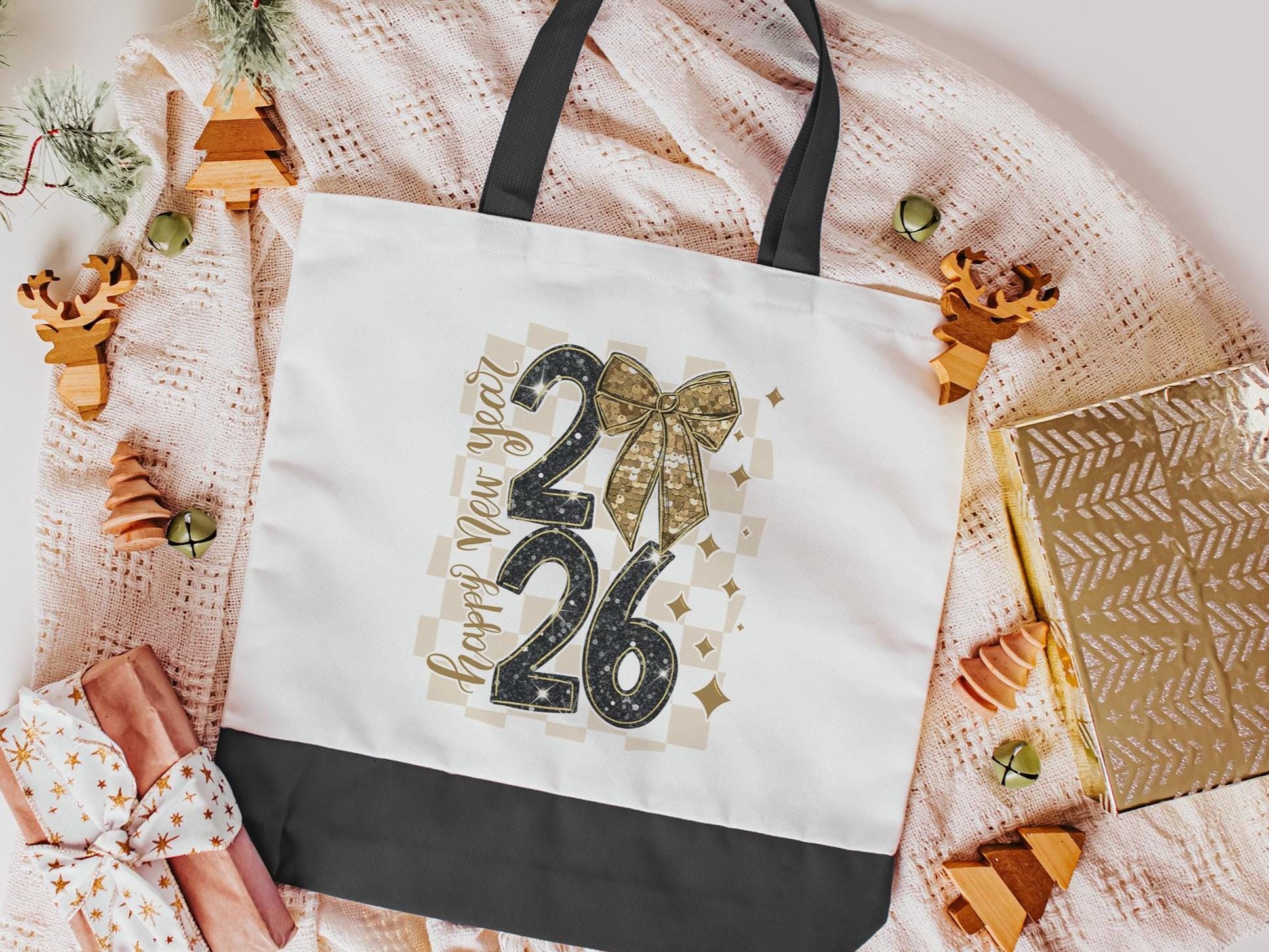 Happy New Year 2026 tote bags for women, New Year gifts for friends, cute shopping bags reusable, New Years hostess gift, shopaholic gifts