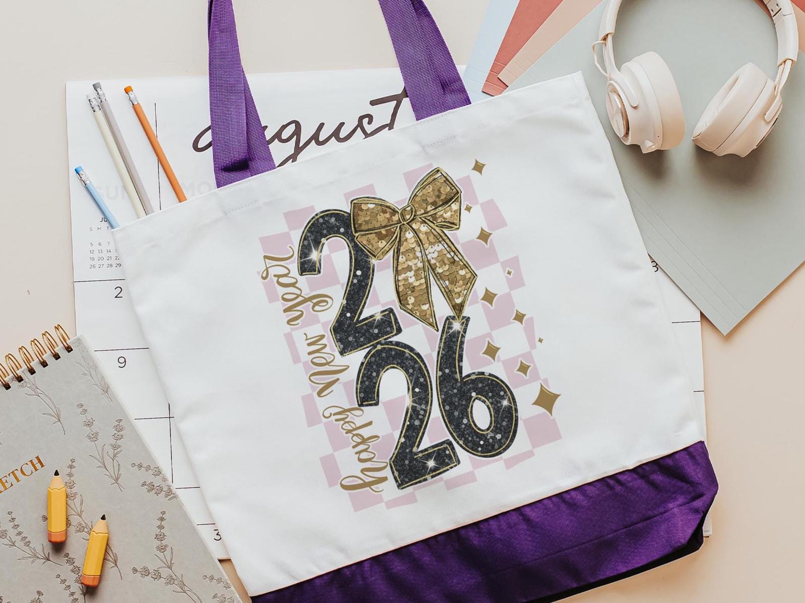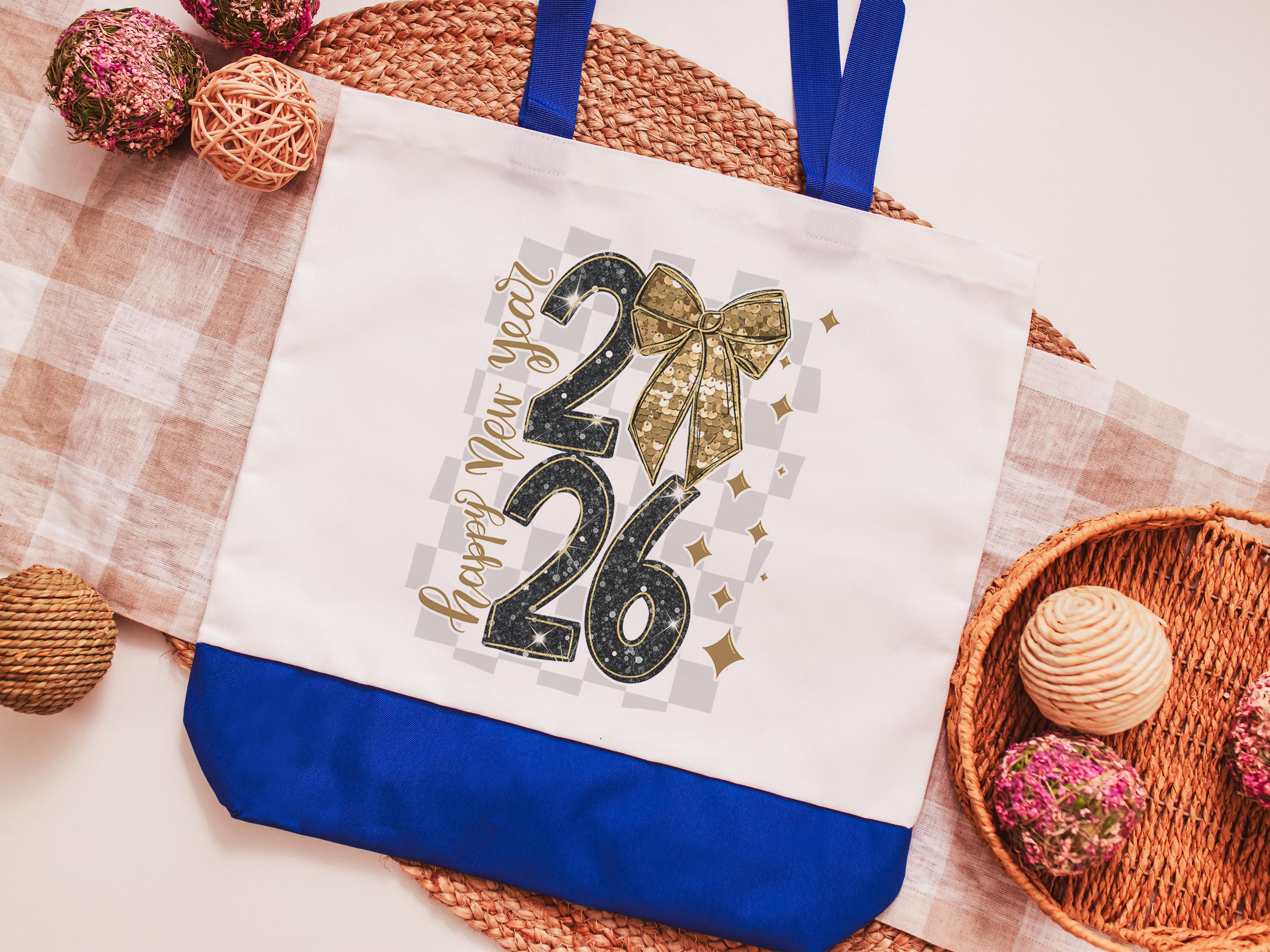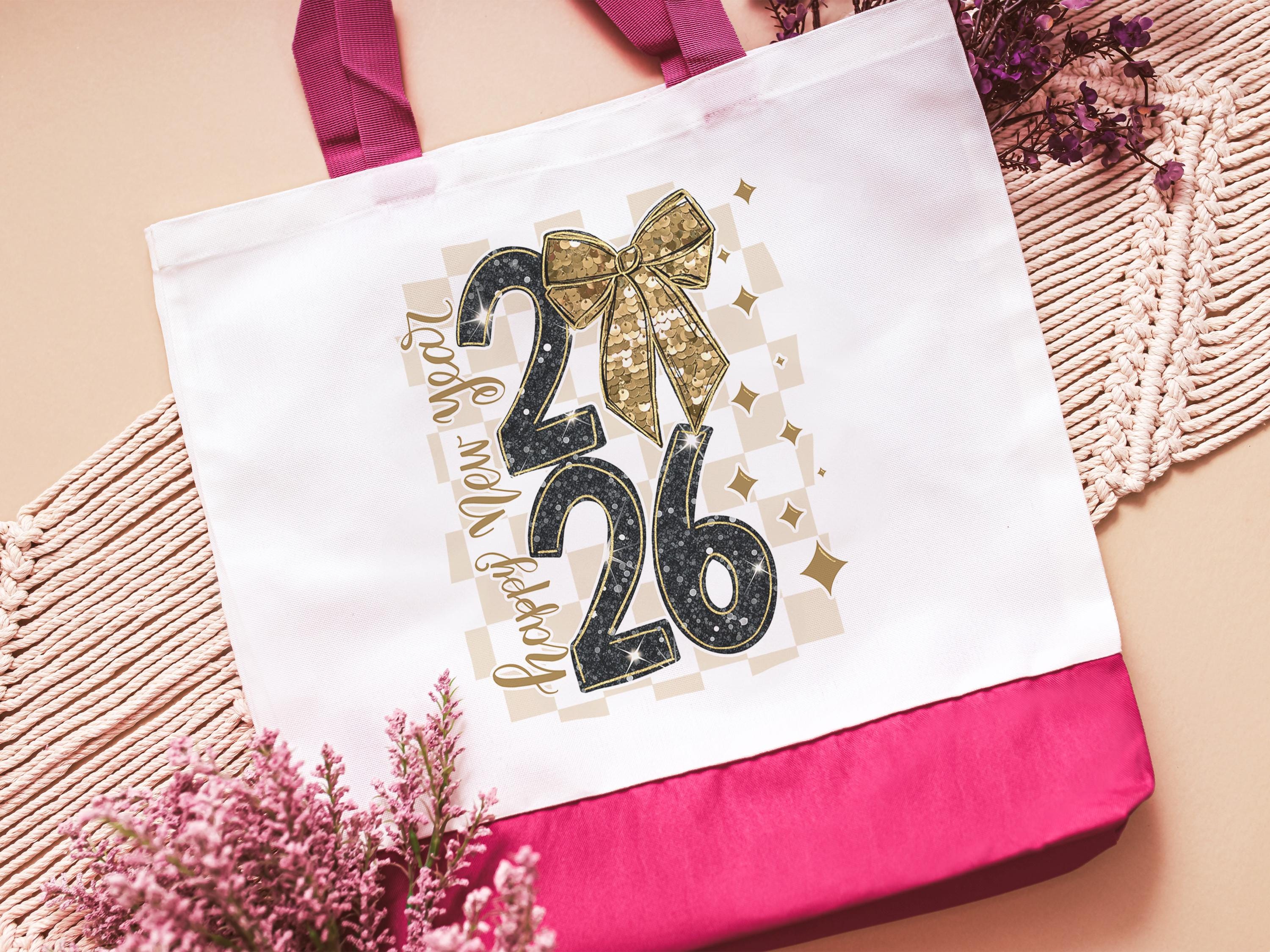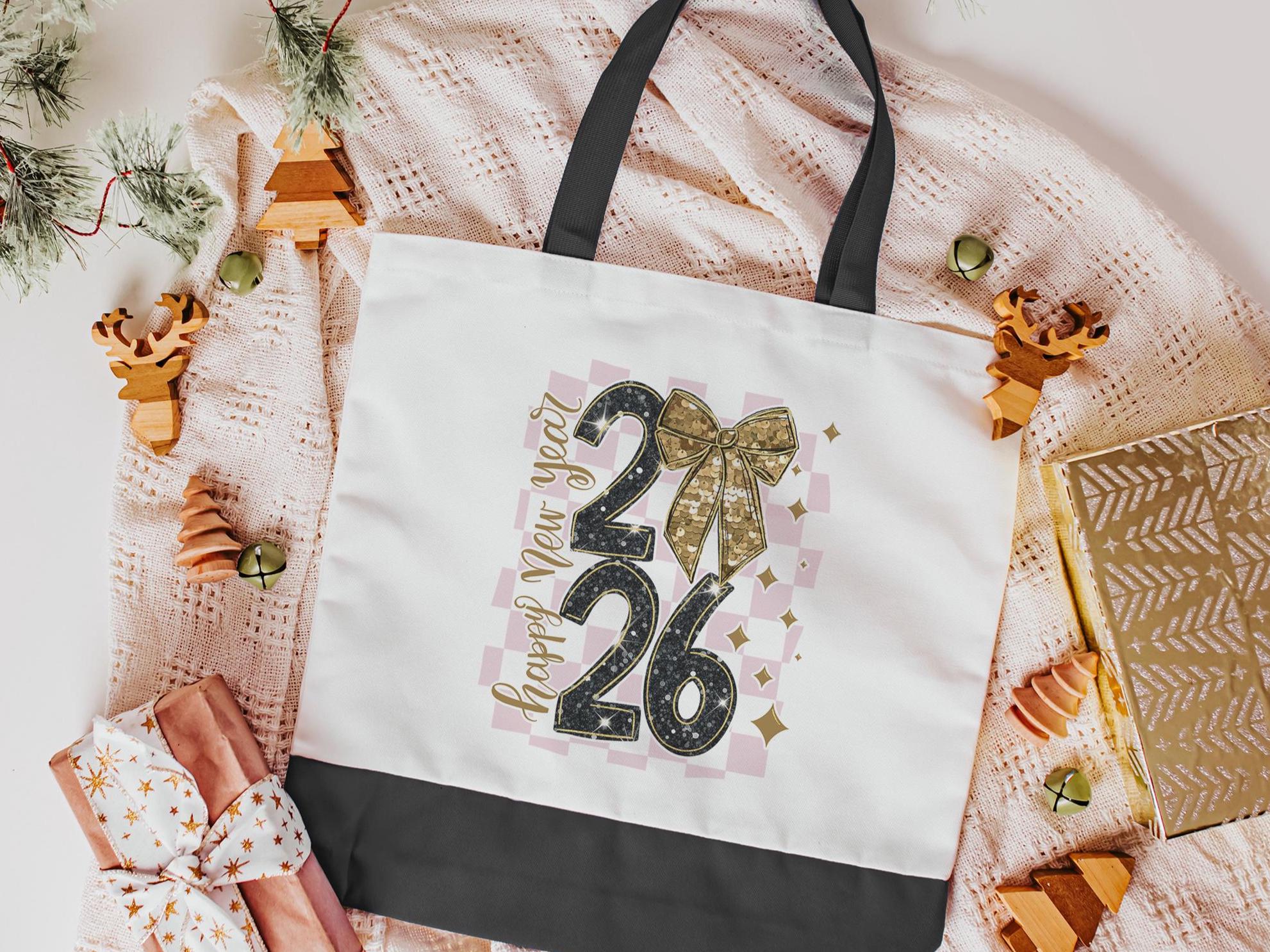 Happy New Year 2026 tote bags for women, New Year gifts for friends, cute shopping bags reusable, New Years hostess gift, shopaholic gifts