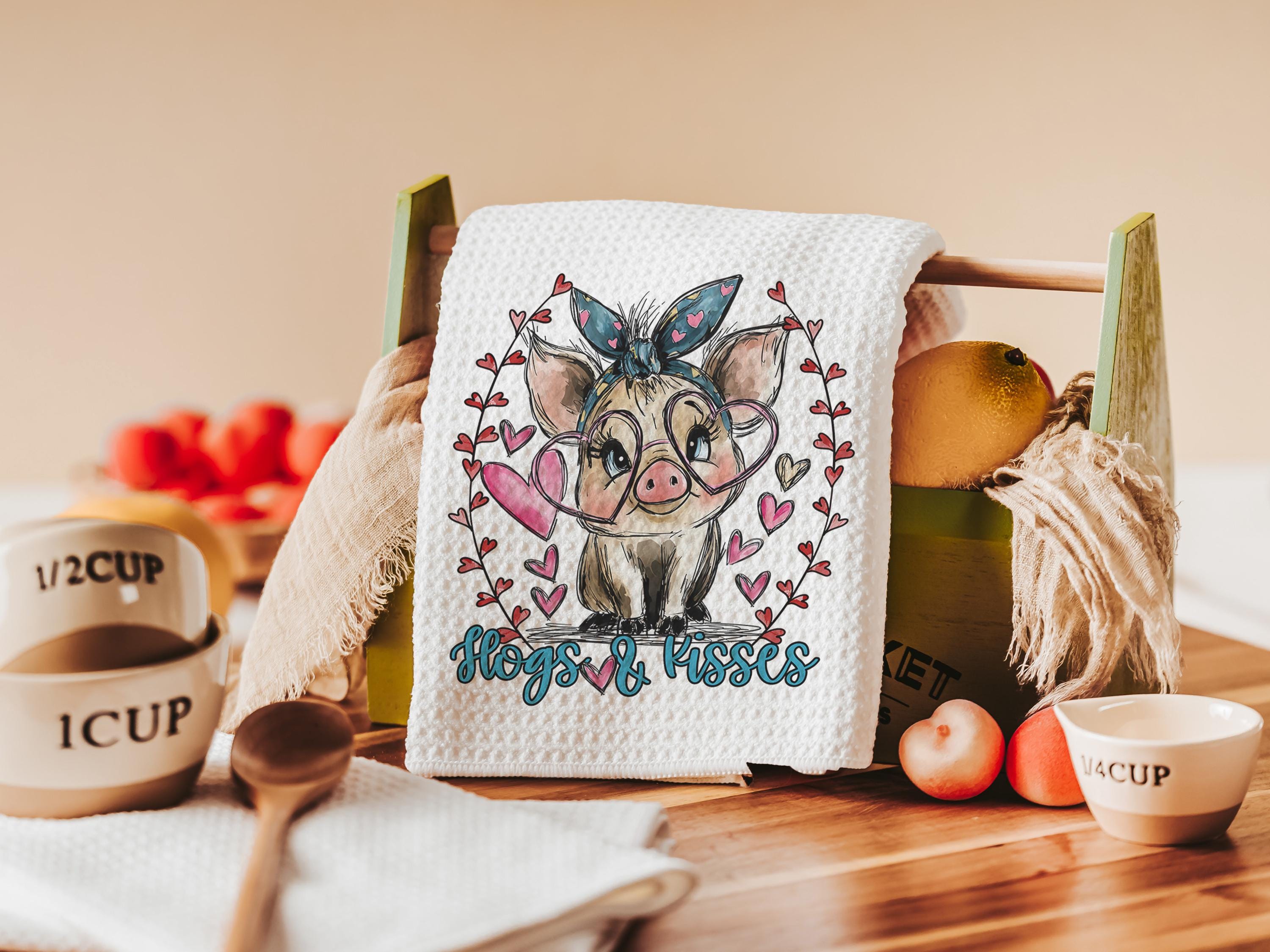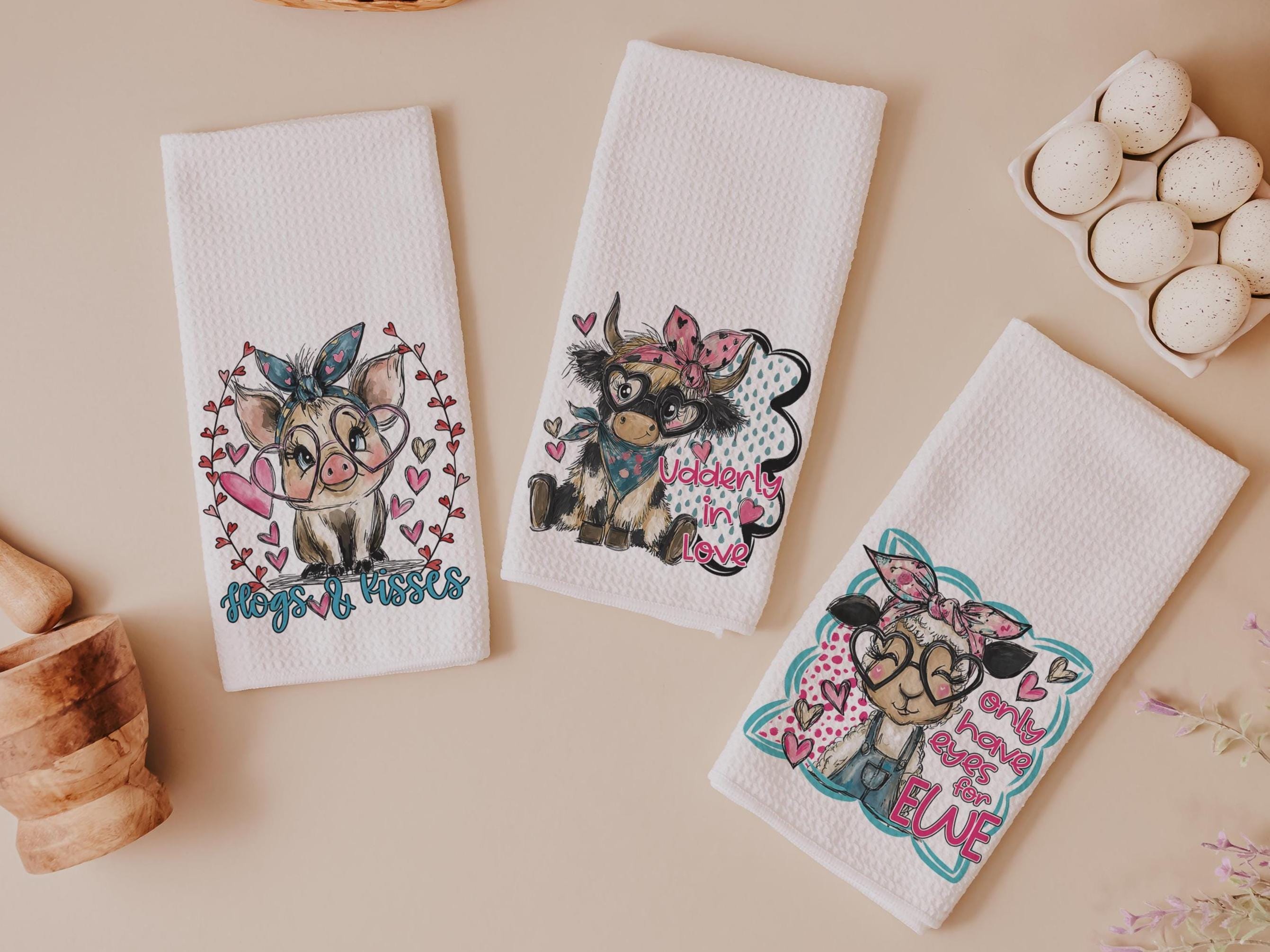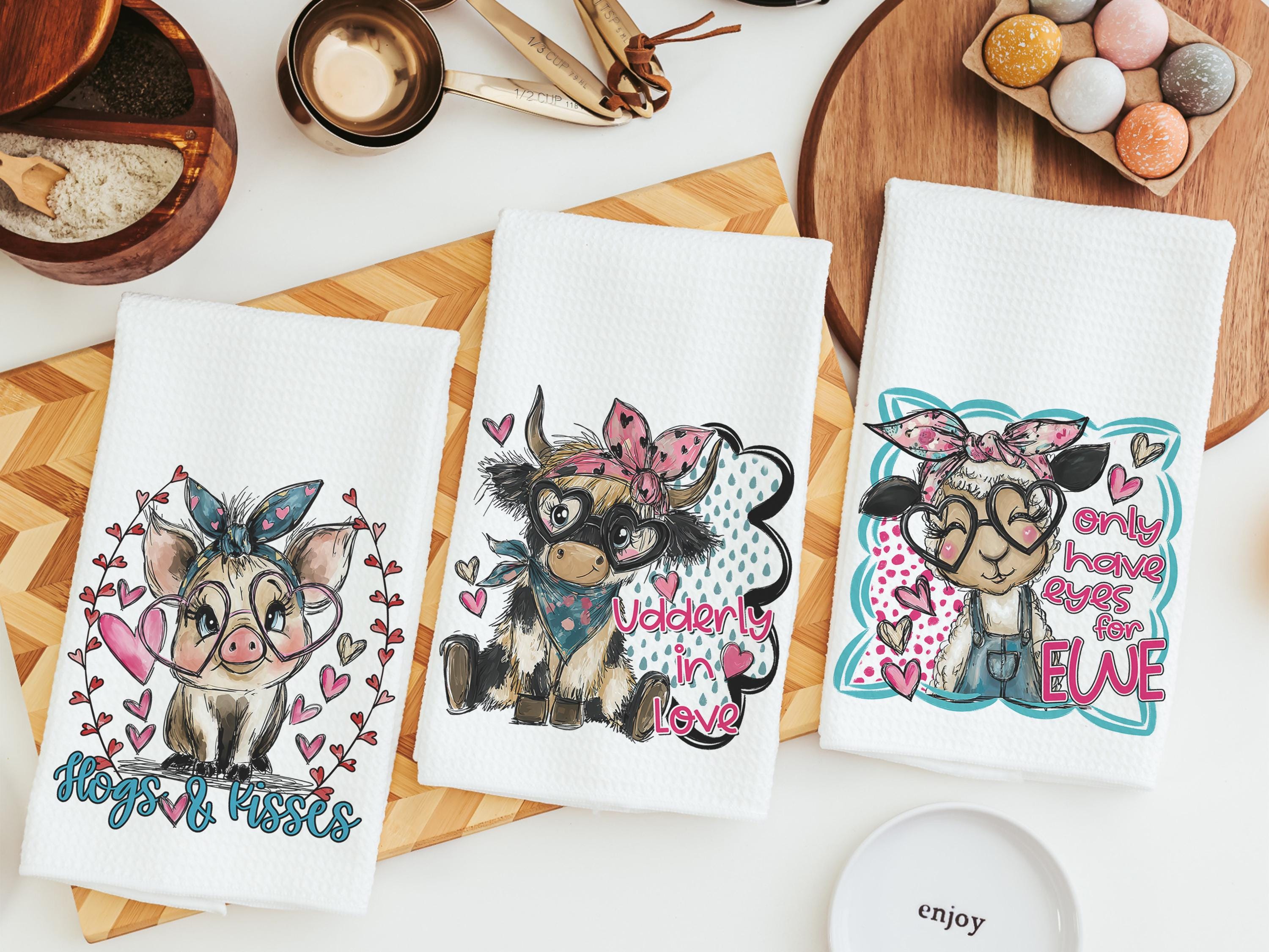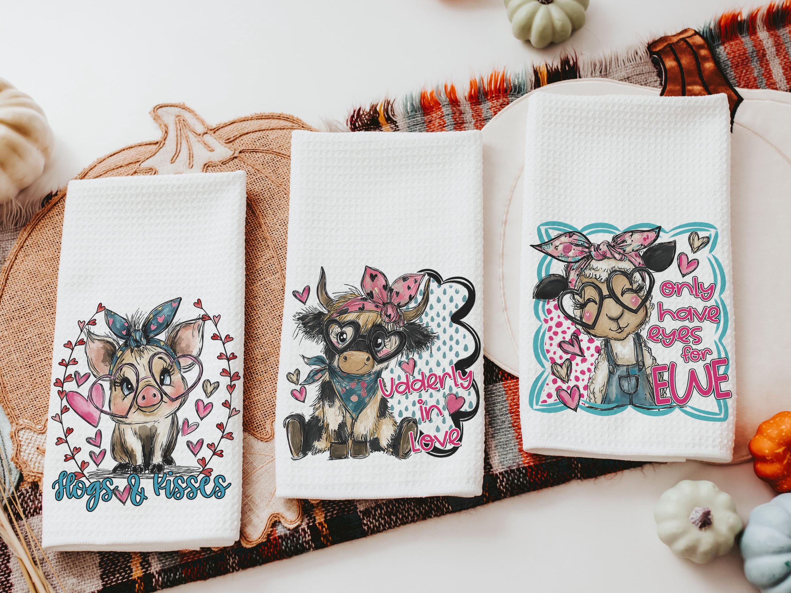 Udderly in love farmhouse cow kitchen towels, hogs and kisses pig gifts for pig lovers, funny Valentines day gifts for her, farm gifts for
