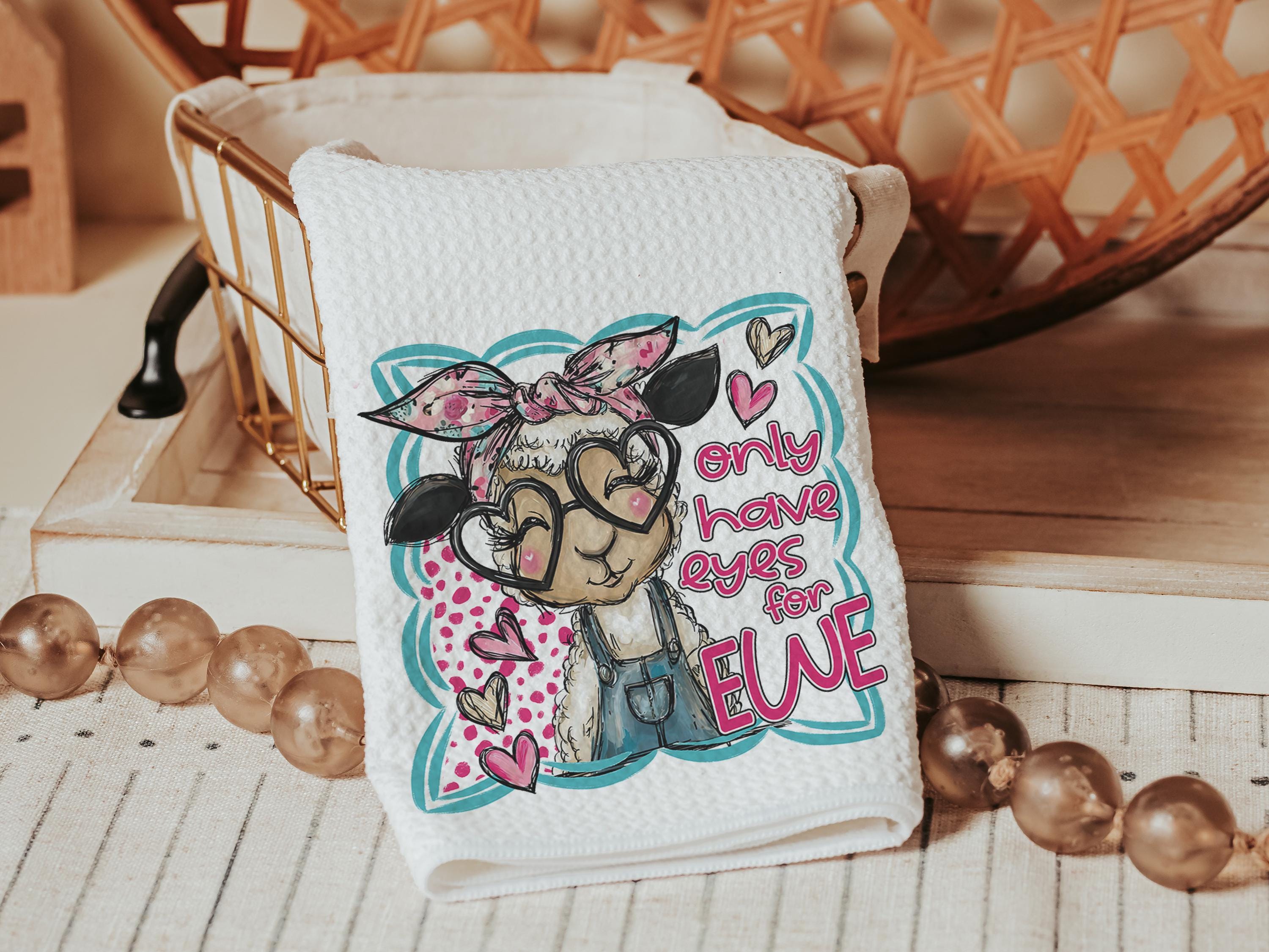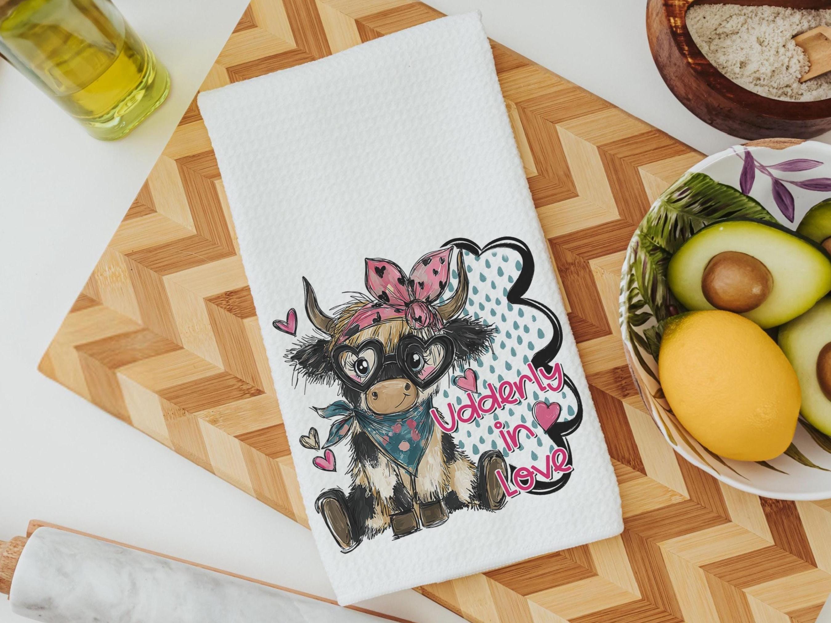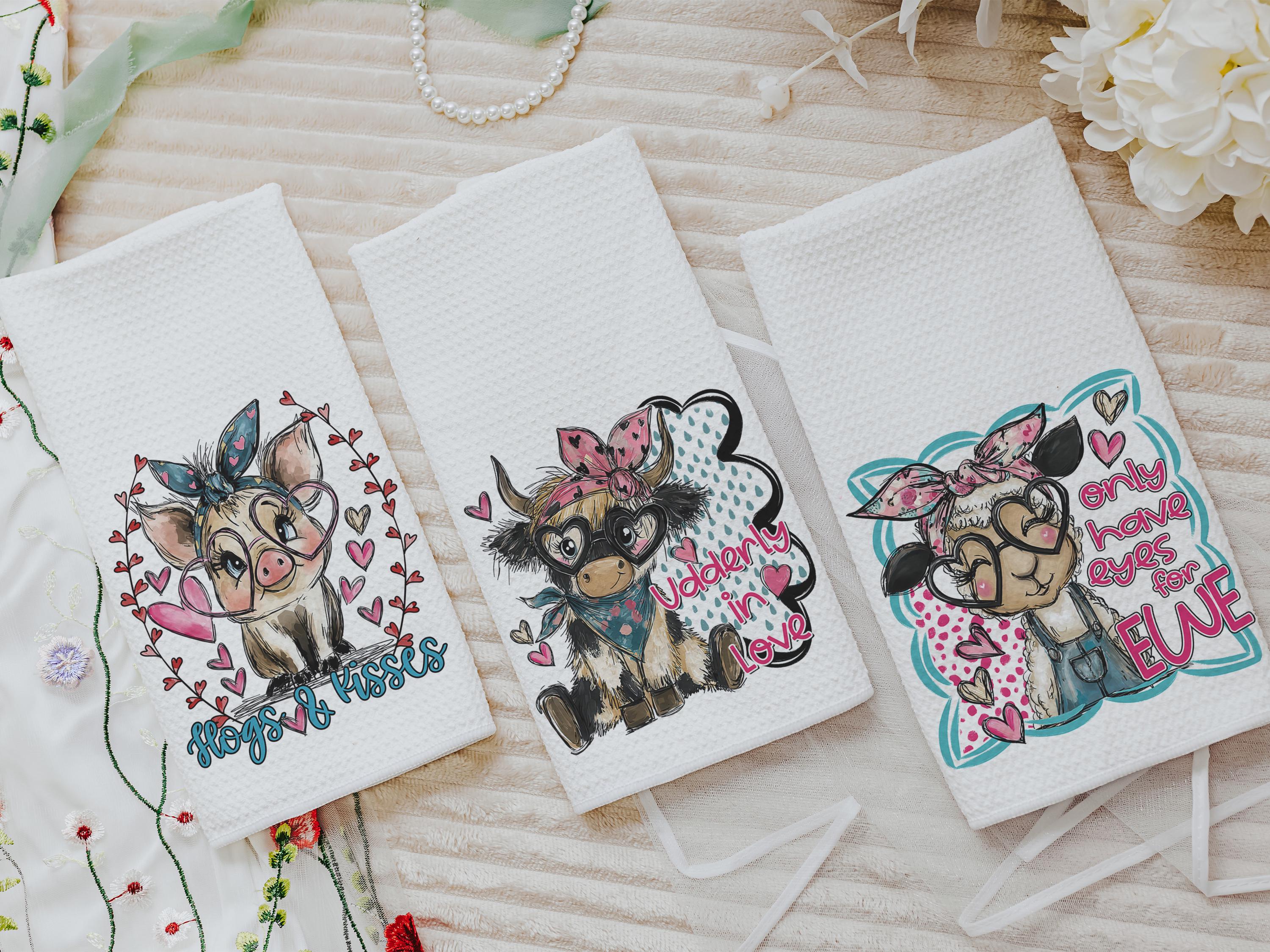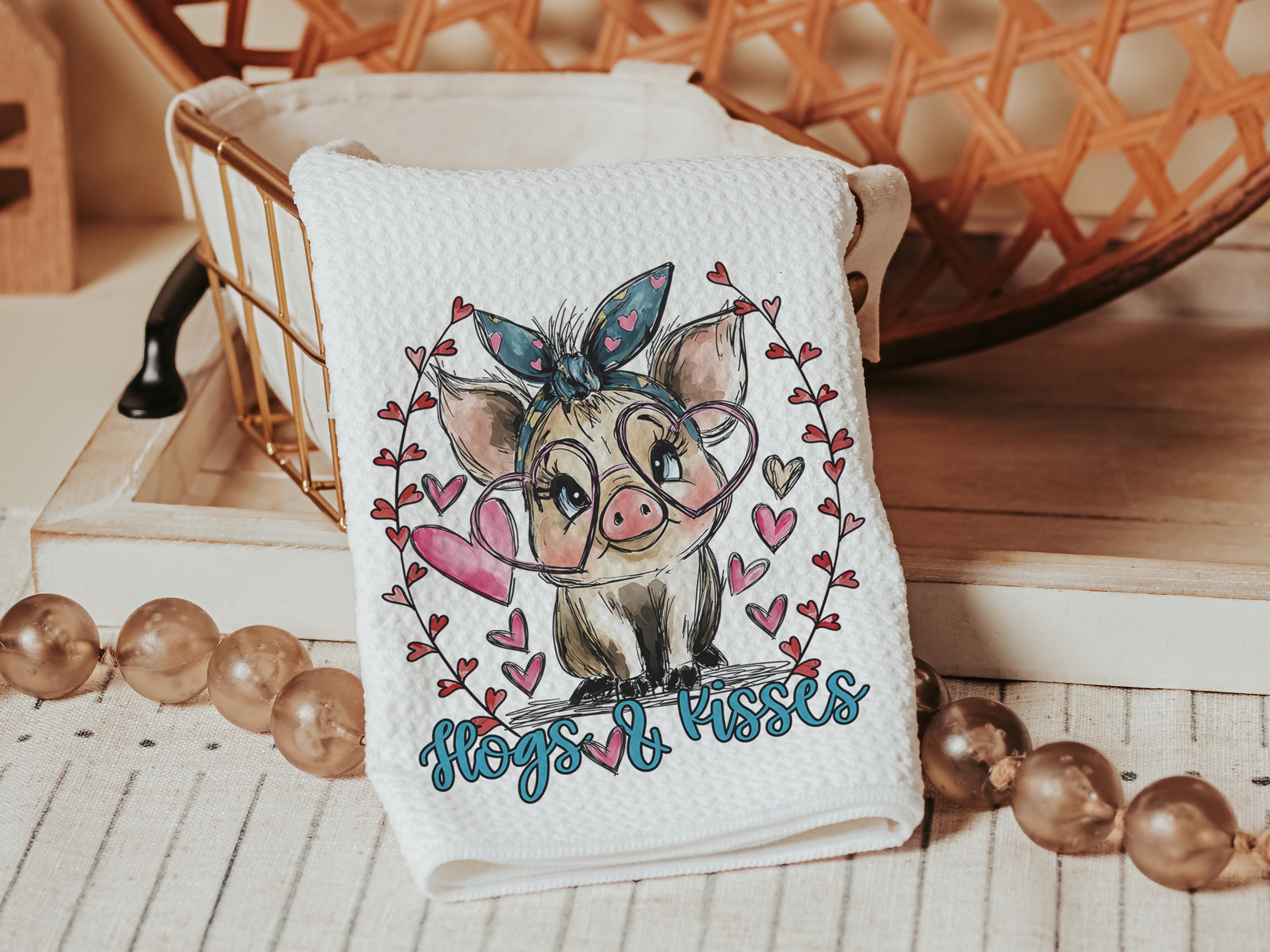 Udderly in love farmhouse cow kitchen towels, hogs and kisses pig gifts for pig lovers, funny Valentines day gifts for her, farm gifts for