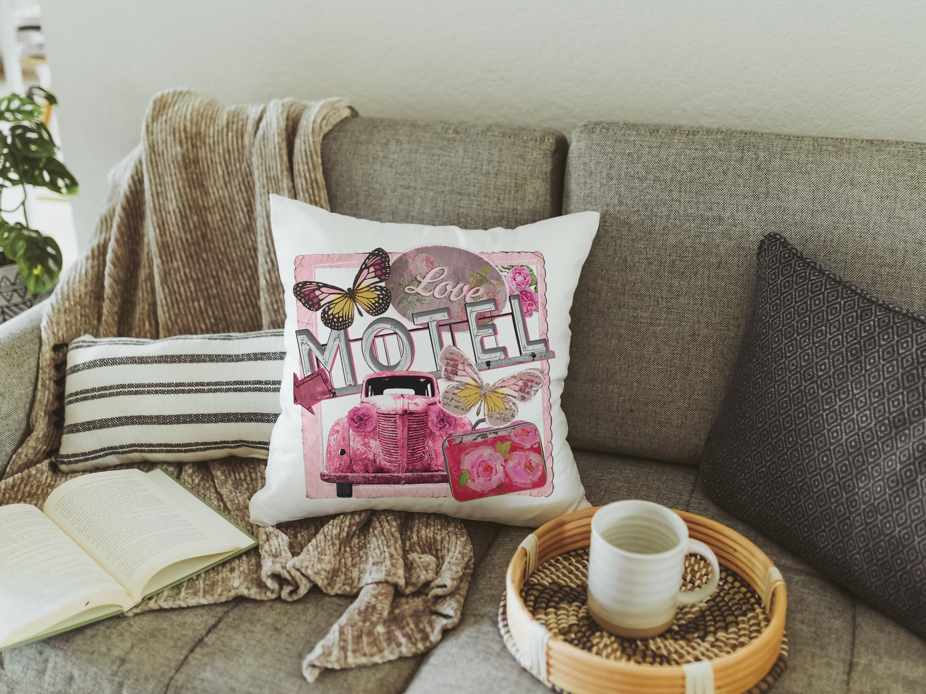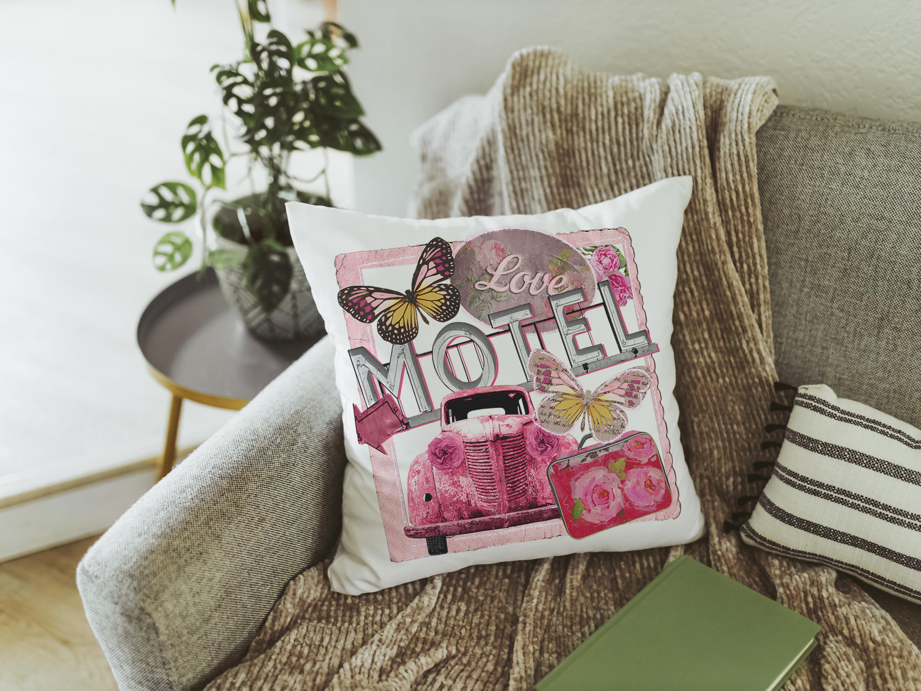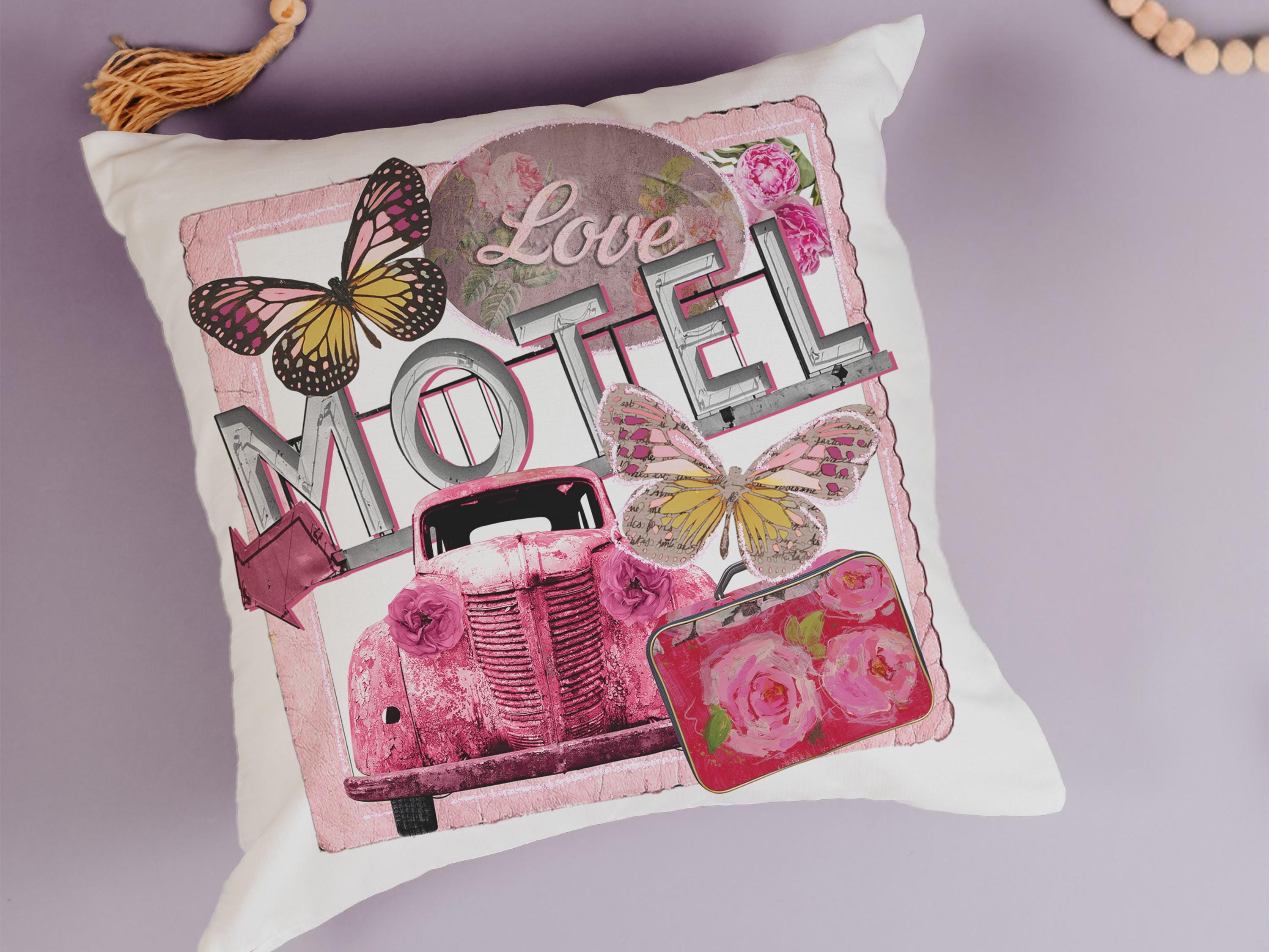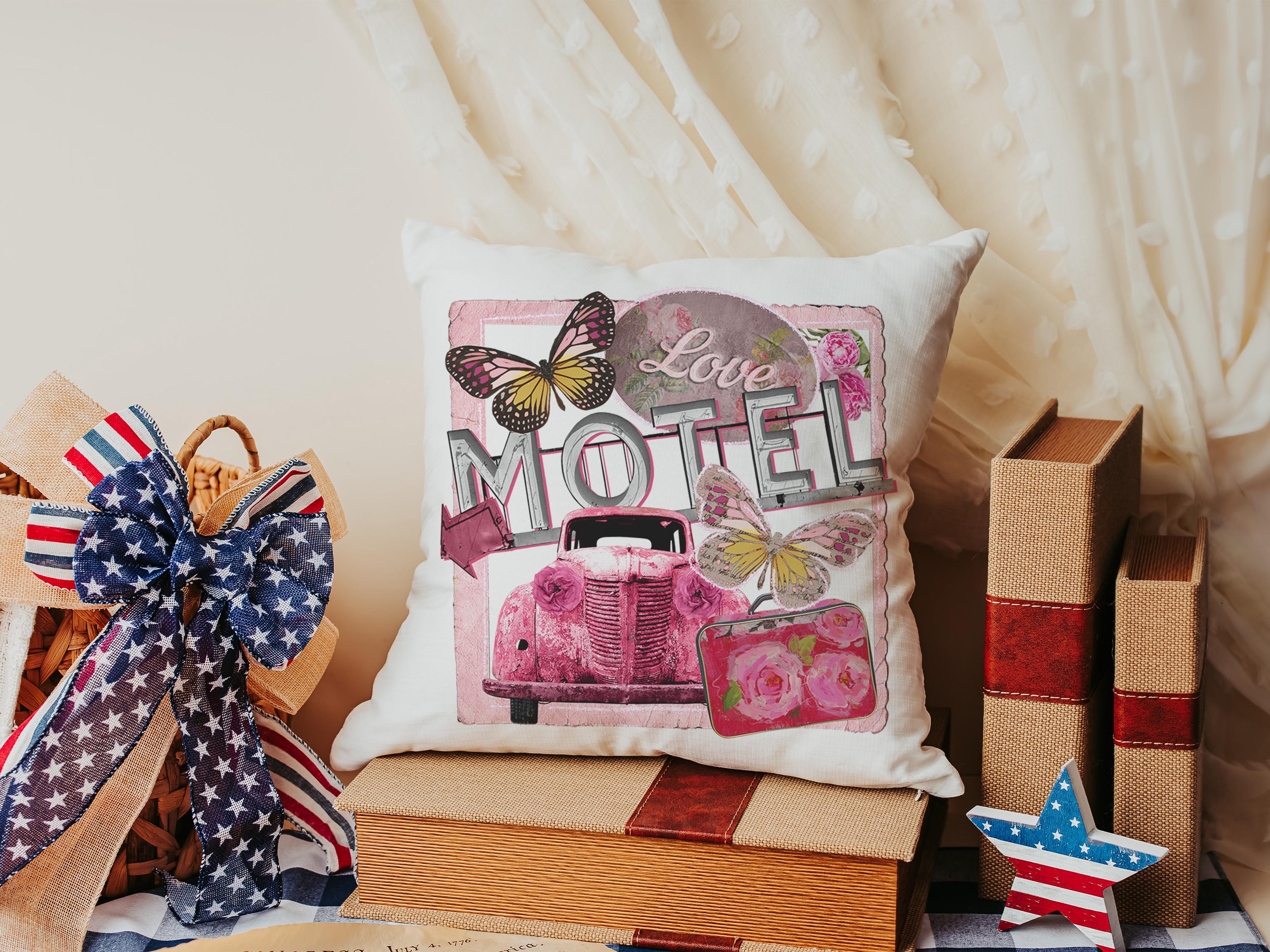 retro motel love throw pillows for women, Galentines day gifts for friends, funky Valentines day best selling gifts Etsy shops, pink truck