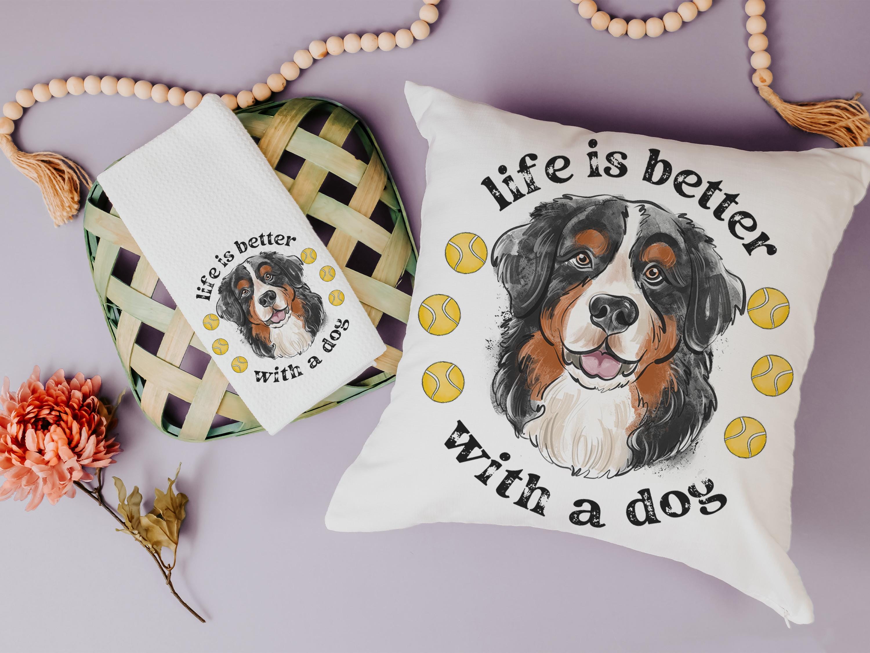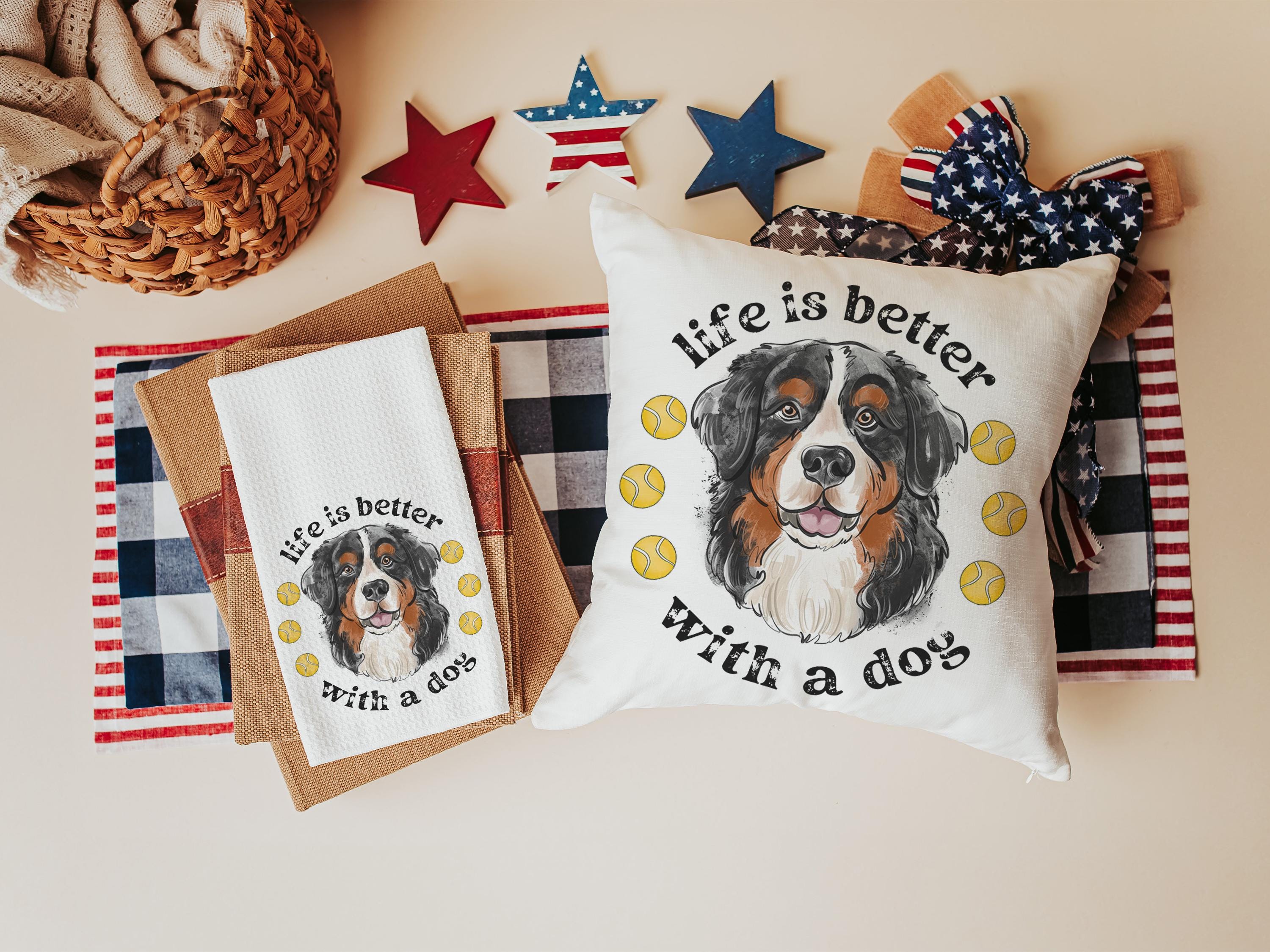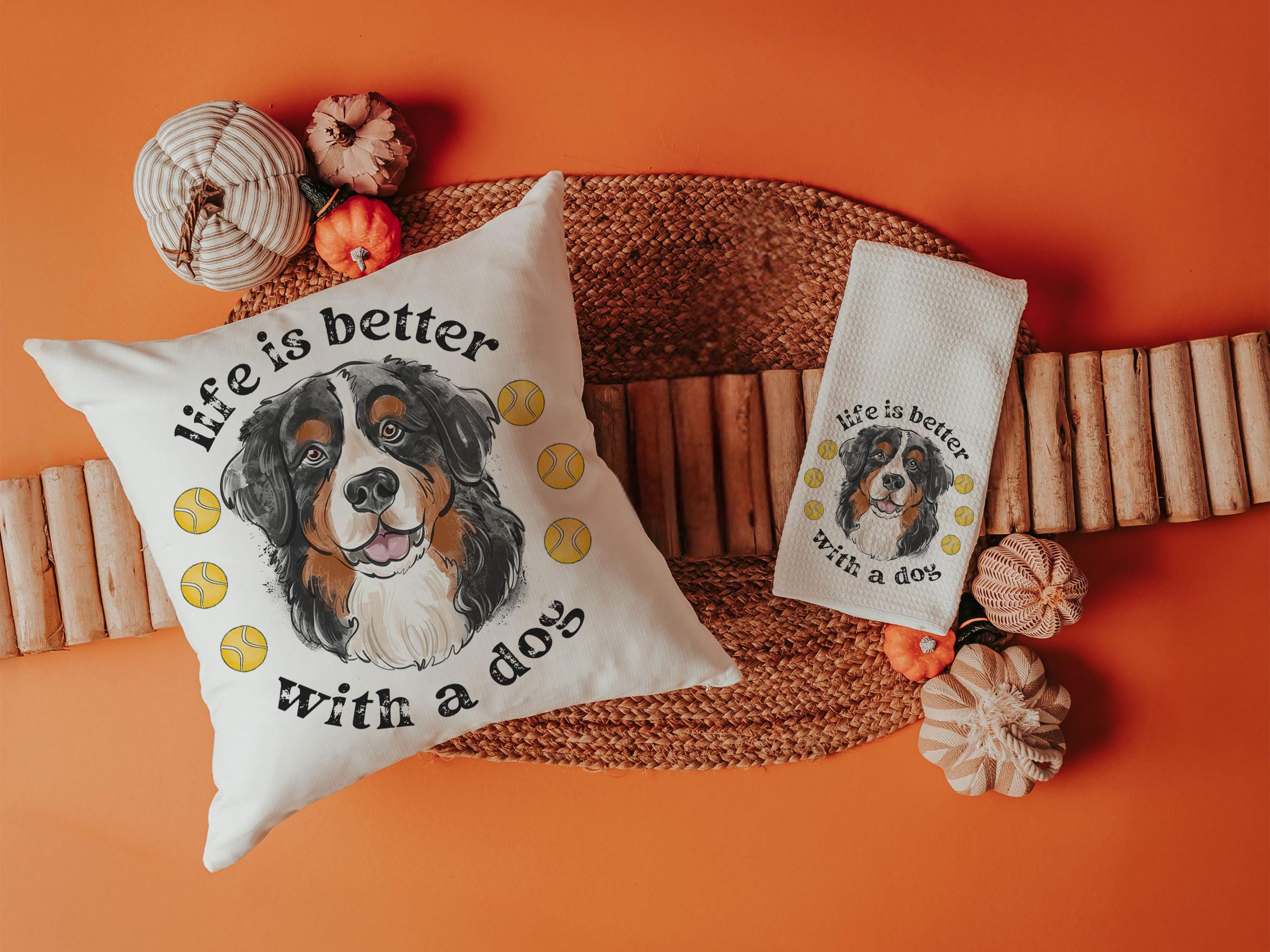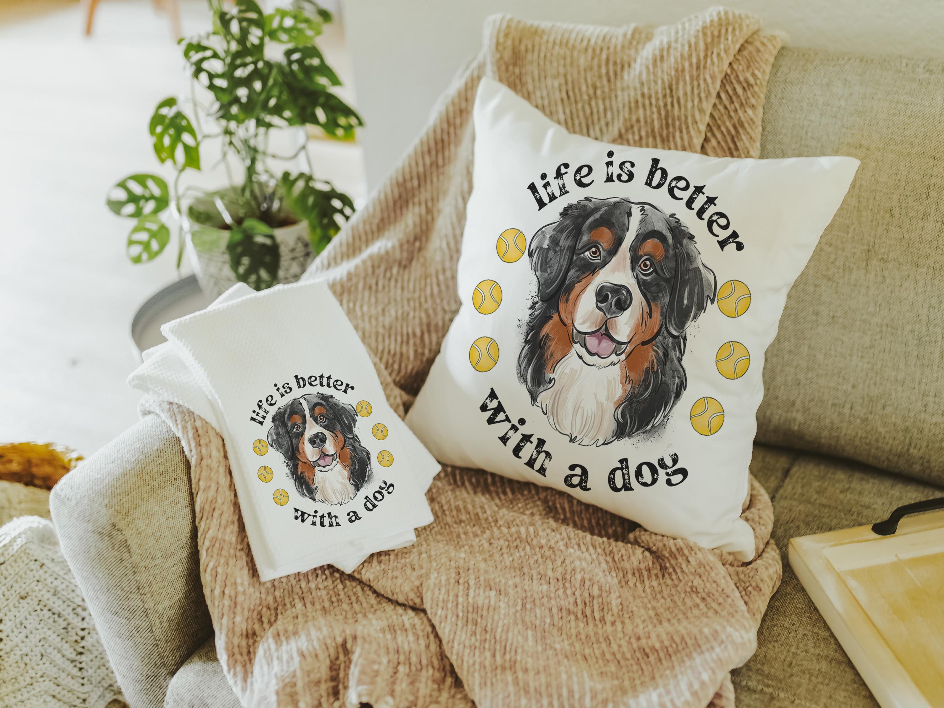 Add an inviting touch to any space with our life is better with a dog bernese mountain dog throw pillow and matching towel, perfect for berner lovers and dog owners. This cute throw pillow brings personality to the sofa or home decor. Available individually or as a set, makes it a thoughtful and stylish choice for any dog mom, dog lover or bernese fan.