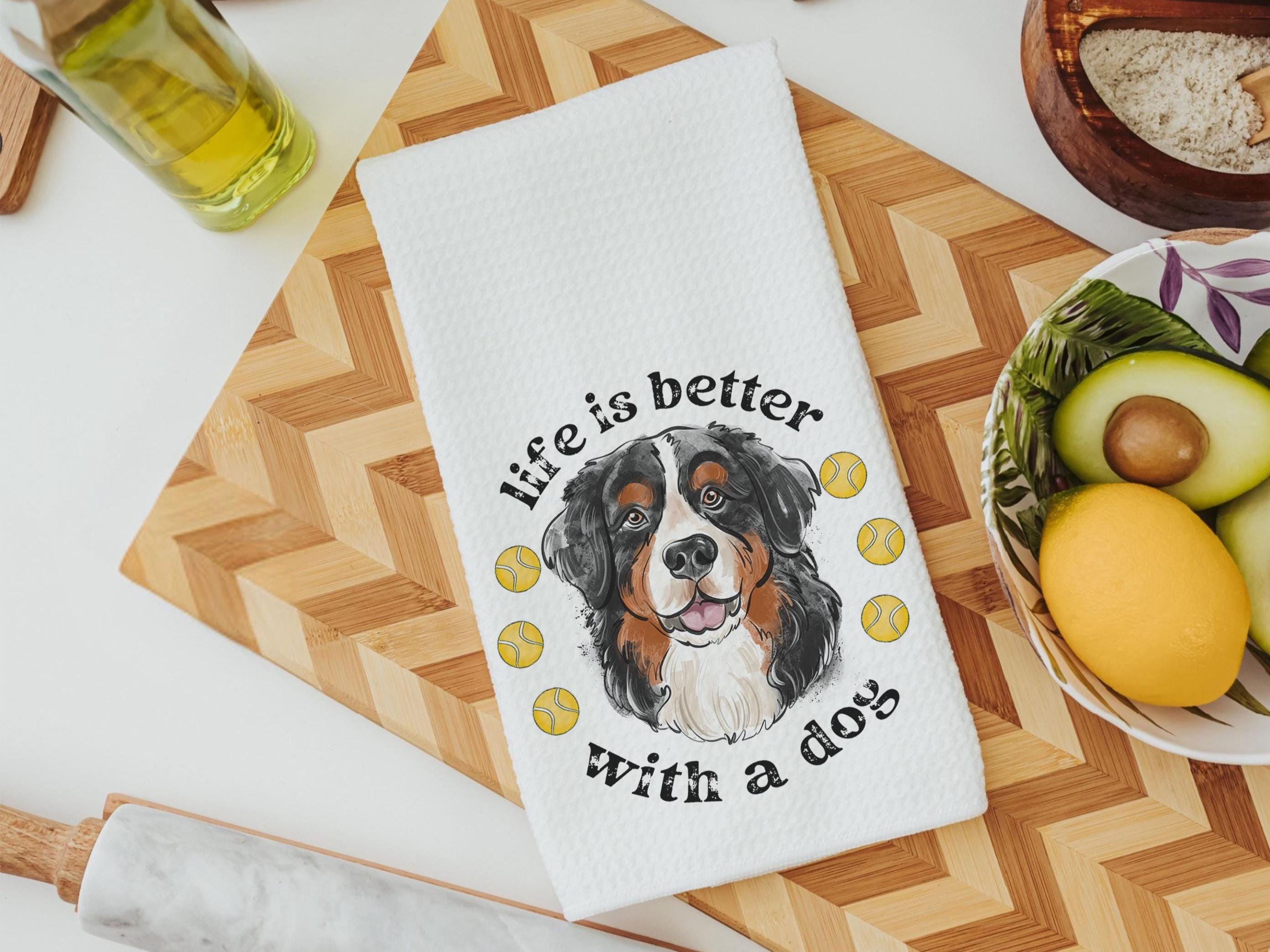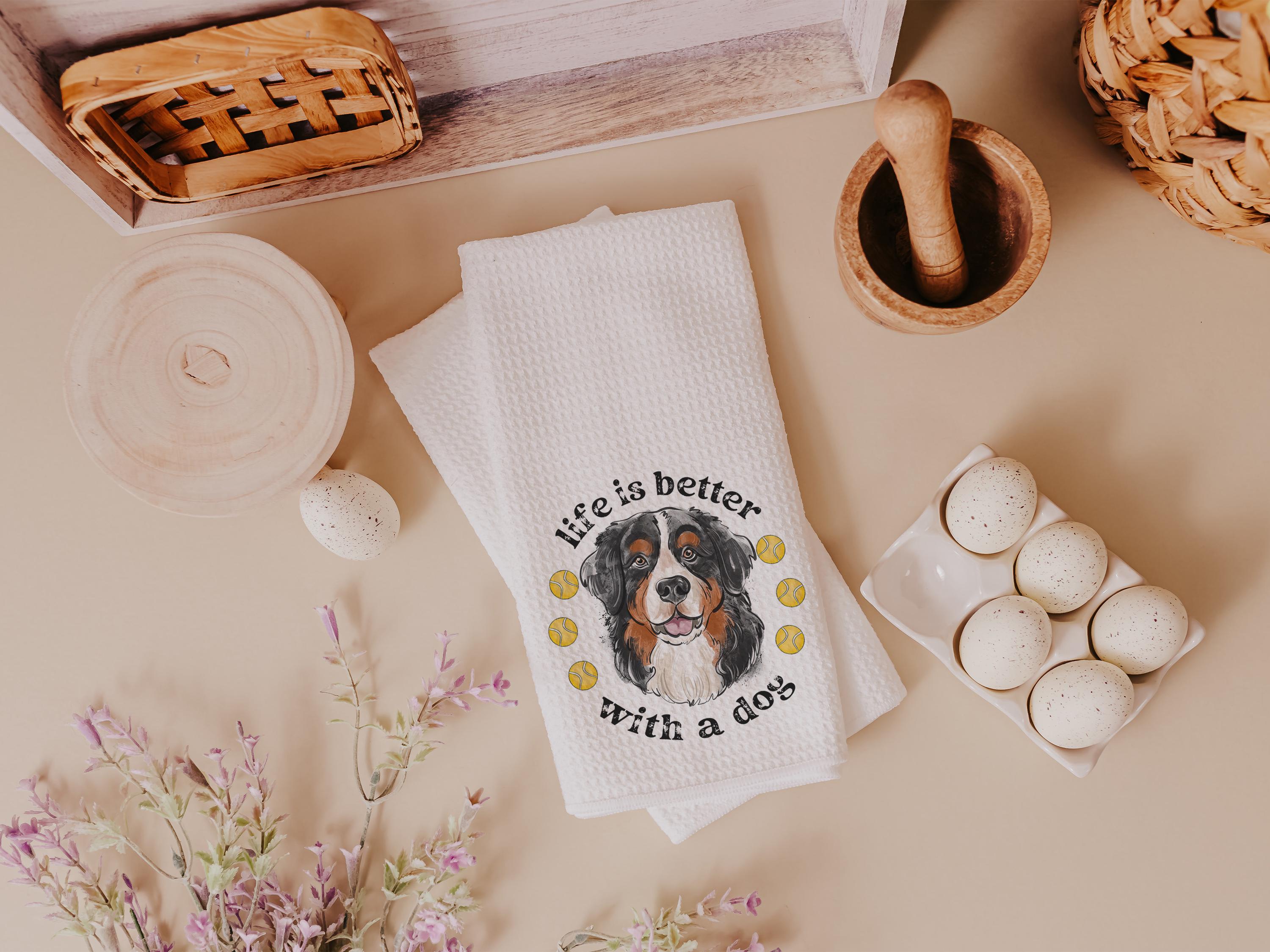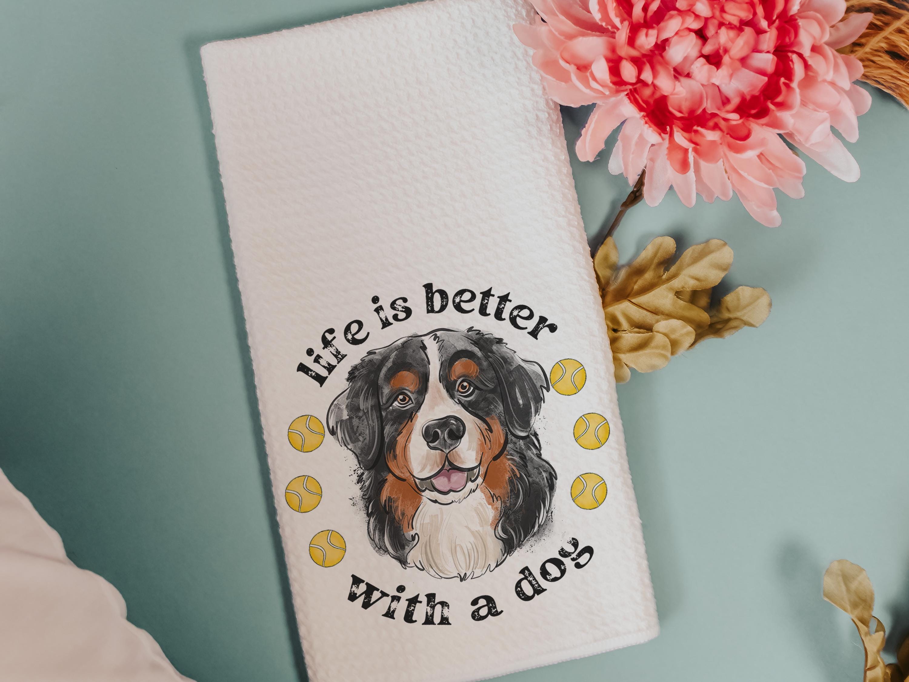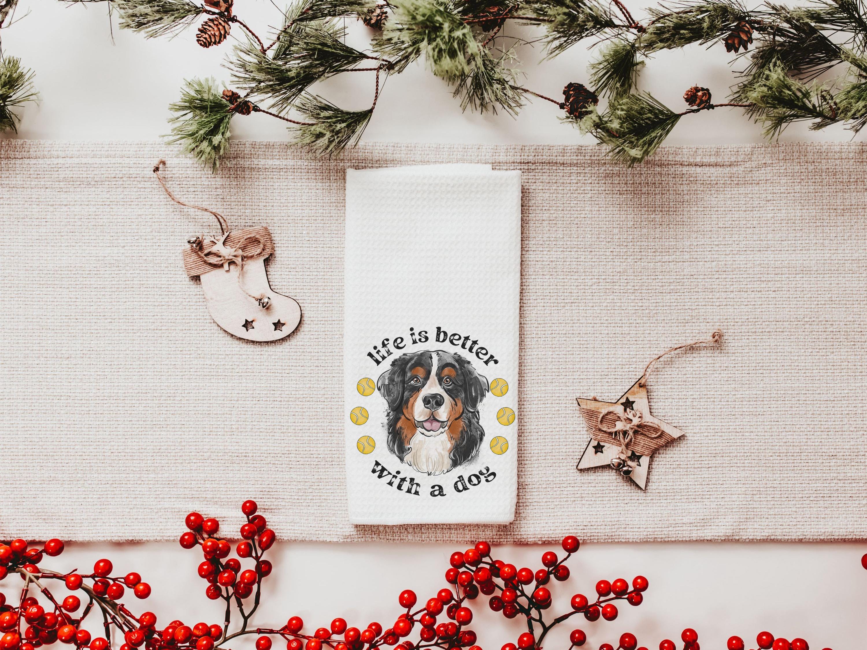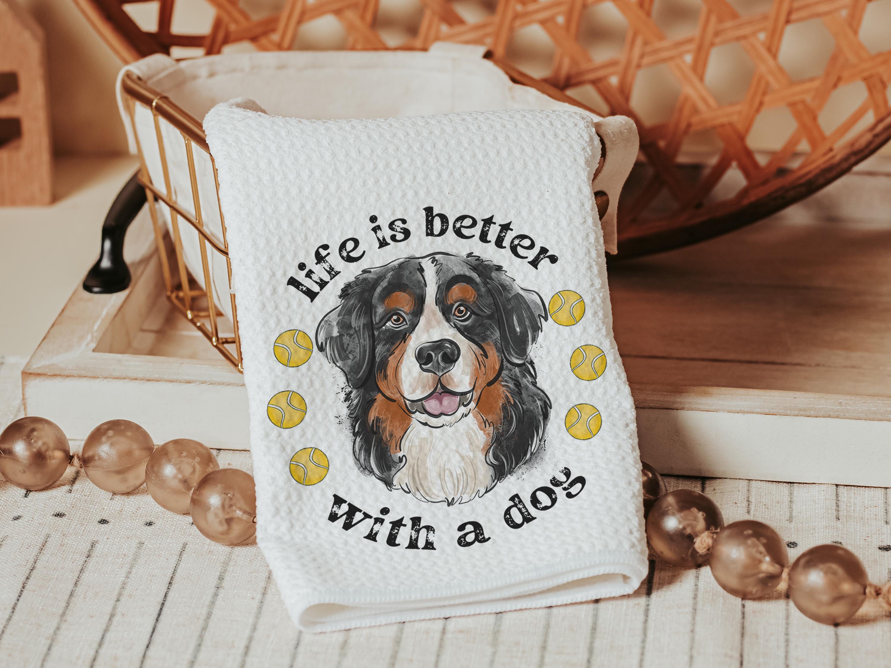 Add an inviting touch to any space with our life is better with a dog bernese mountain dog throw pillow and matching towel, perfect for berner lovers and dog owners. This cute throw pillow brings personality to the sofa or home decor. Available individually or as a set, makes it a thoughtful and stylish choice for any dog mom, dog lover or bernese fan.