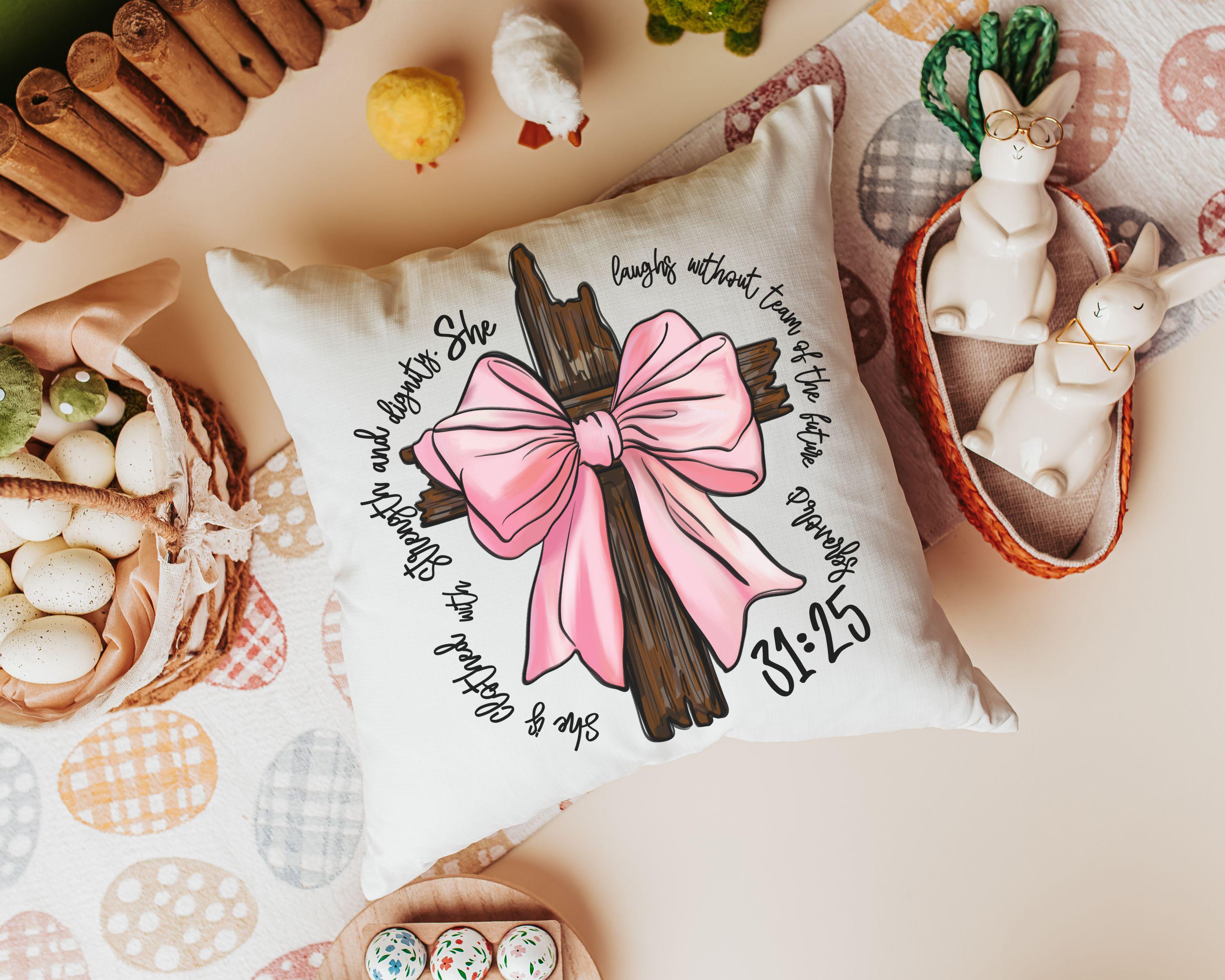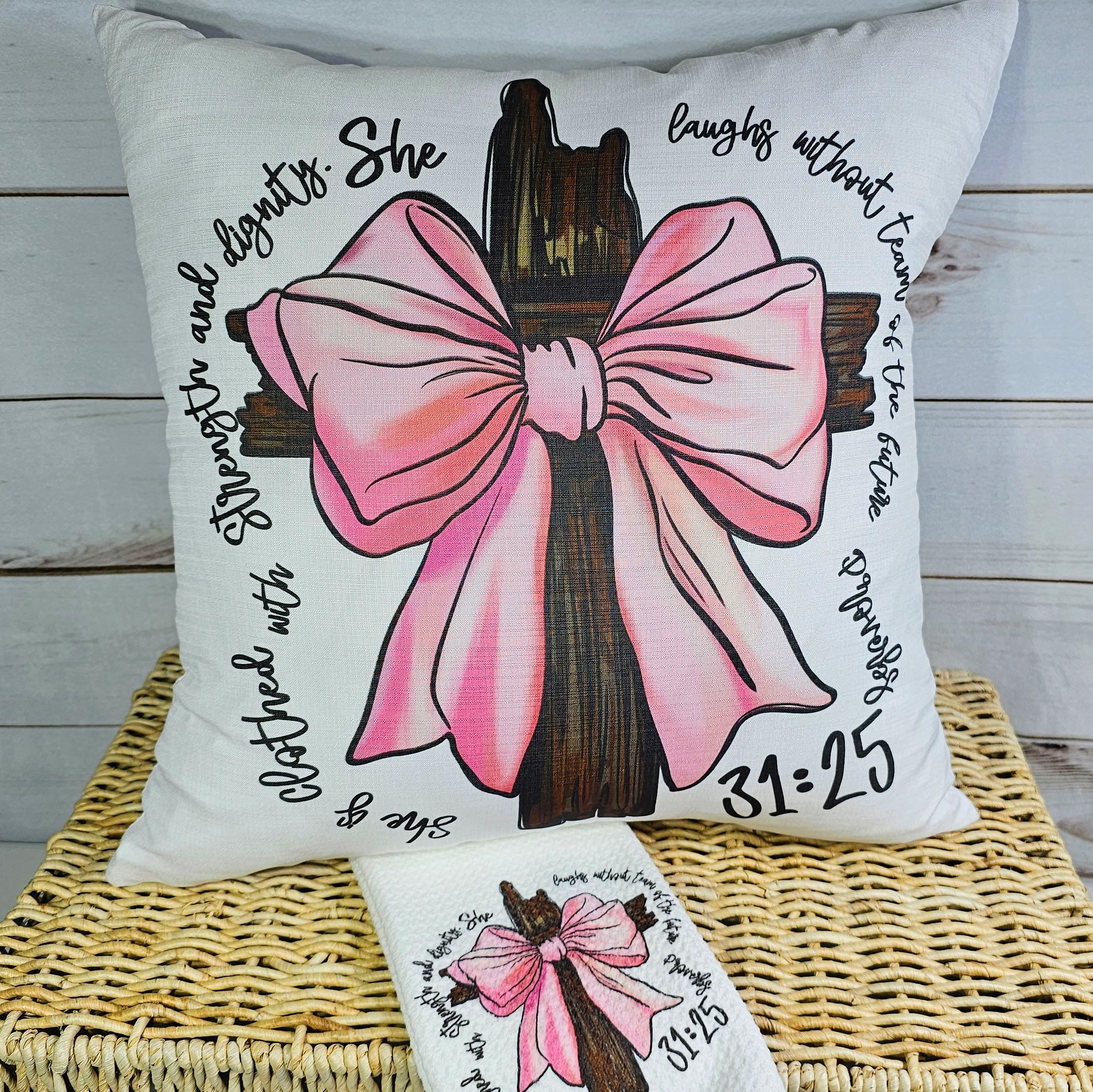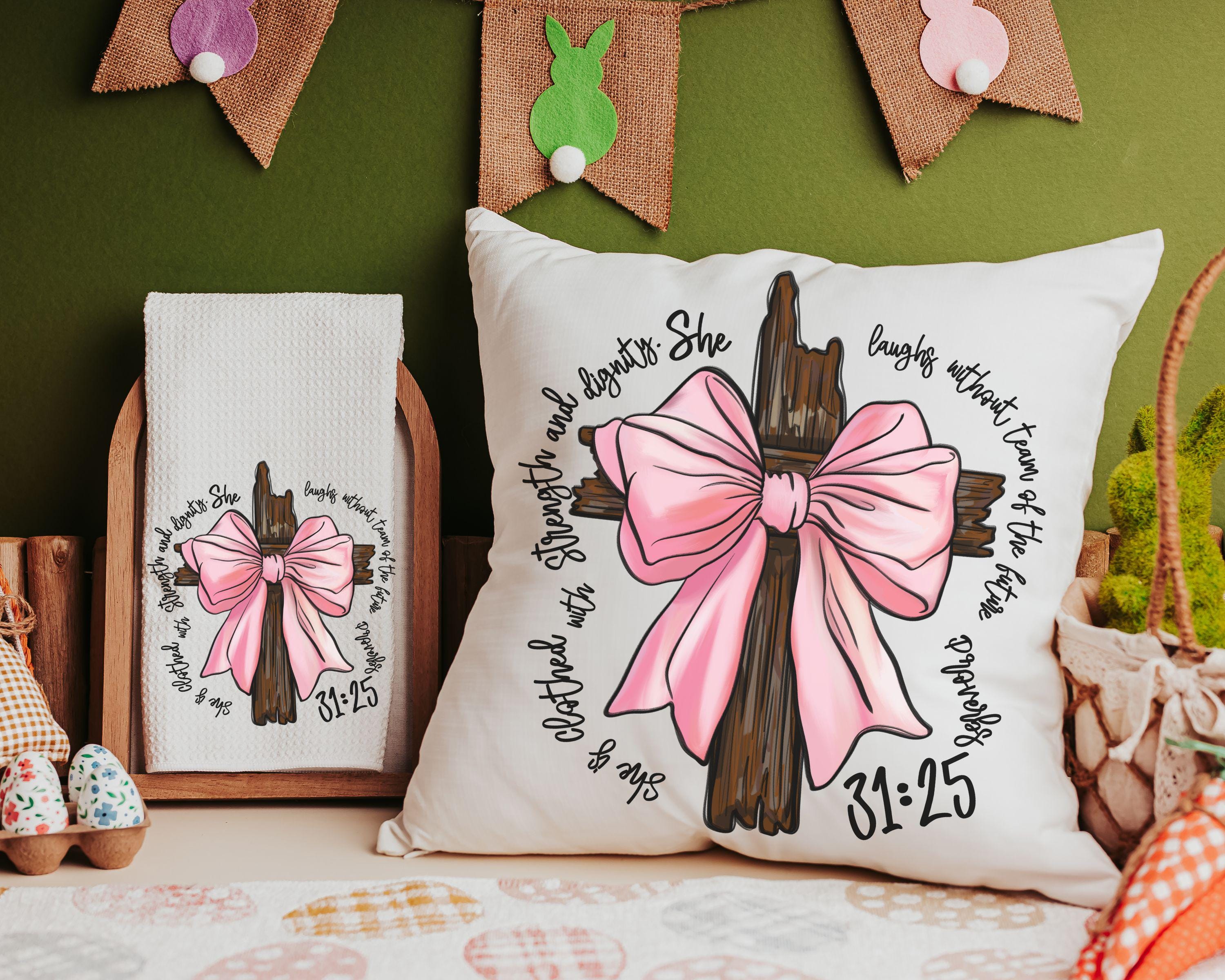 she is clothed in strength Bible verse throw pillows for couch, Christian coquette kitchen towels, Proverbs 31 bridal shower gifts for bride