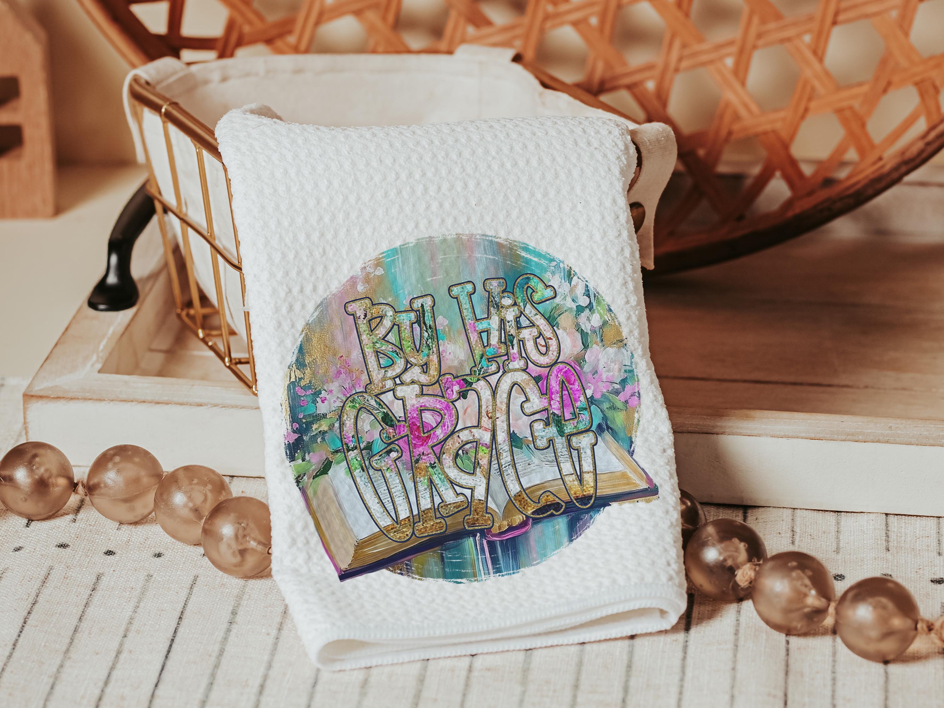 A faith-filled accent for a couch or living space, with a throw pillow and matching towels that carry the message through the home. By His Grace with watercolor florals makes a thoughtful Christian decor gift for women. A simple pick for Easter, Bible study gifts, or everyday faith-centered home decor.