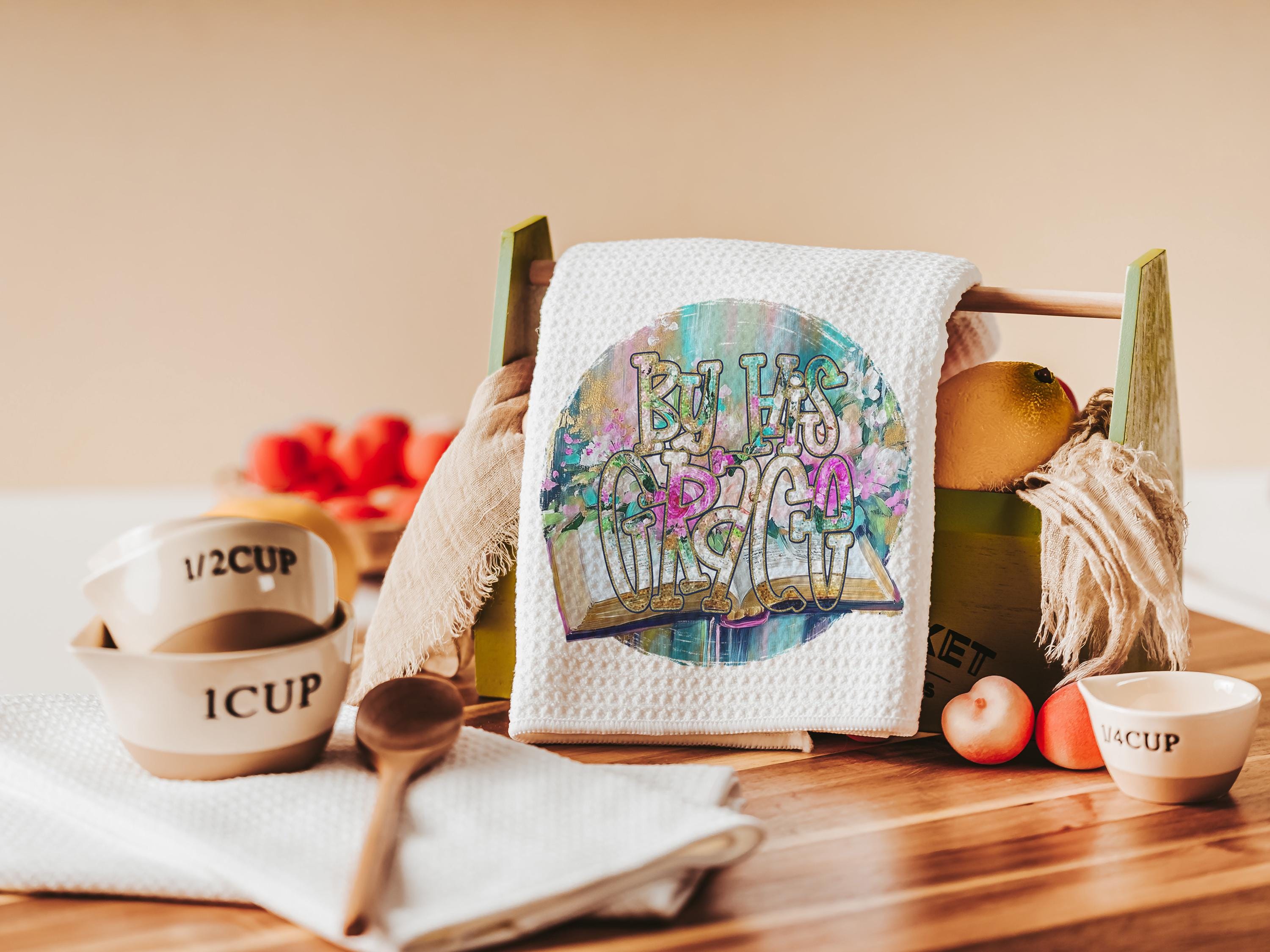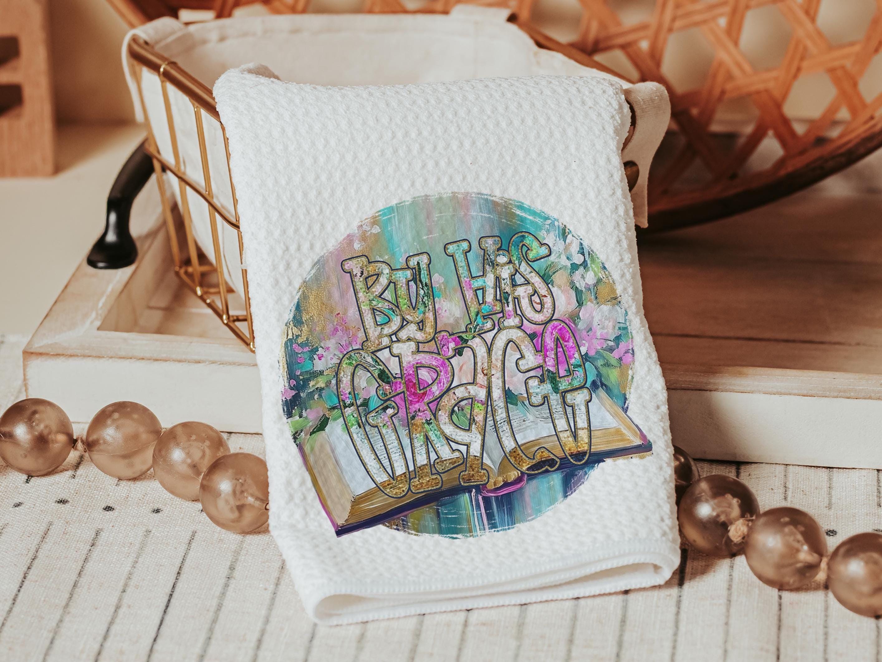 A faith-filled update for the kitchen or living space, with matching towels and pillows that carry the message through the home. By His Grace with watercolor florals makes a beautiful Christian Easter gift for Mom or a sister. A simple pick for church kitchens or Easter hostess gifting.