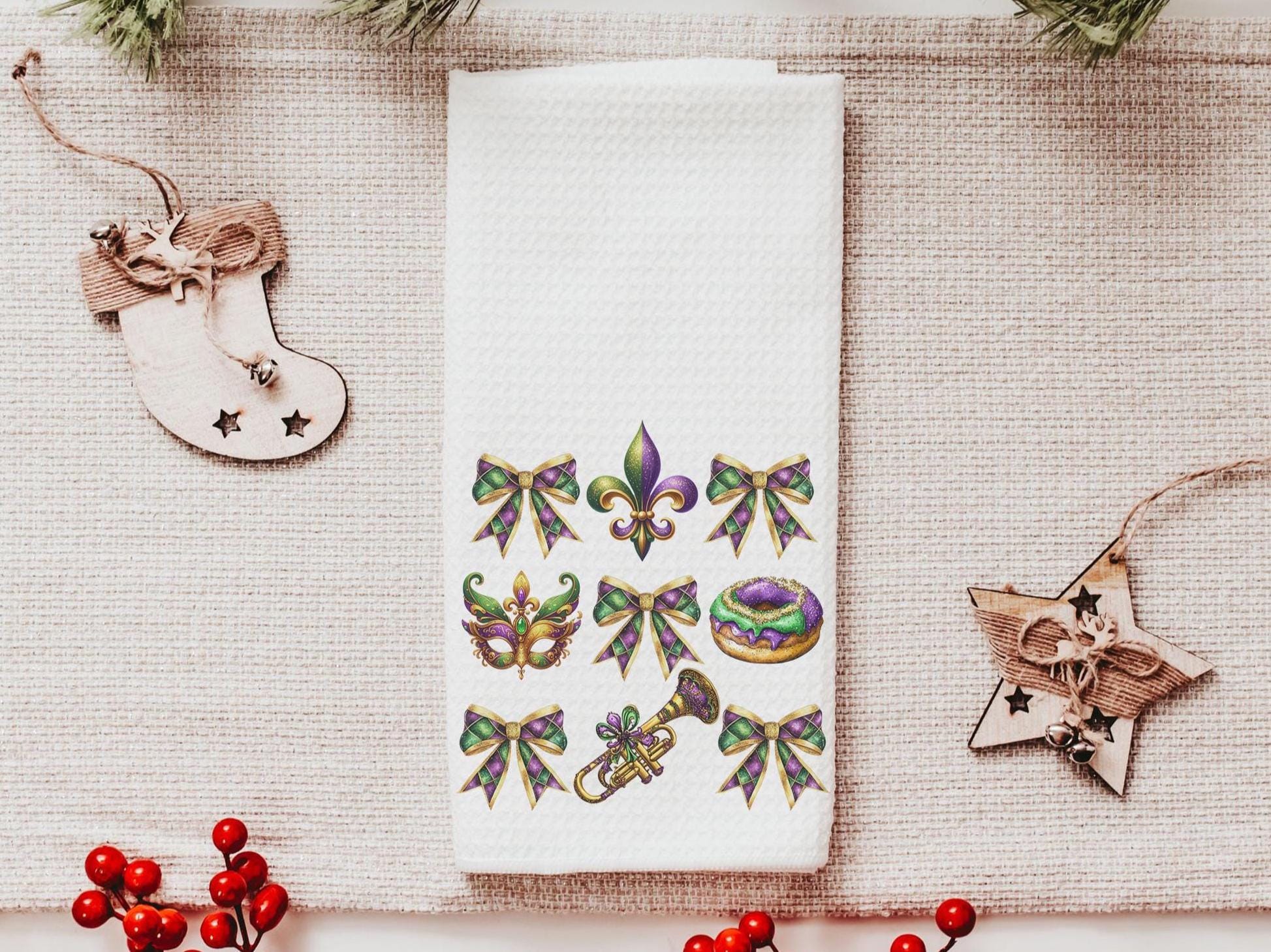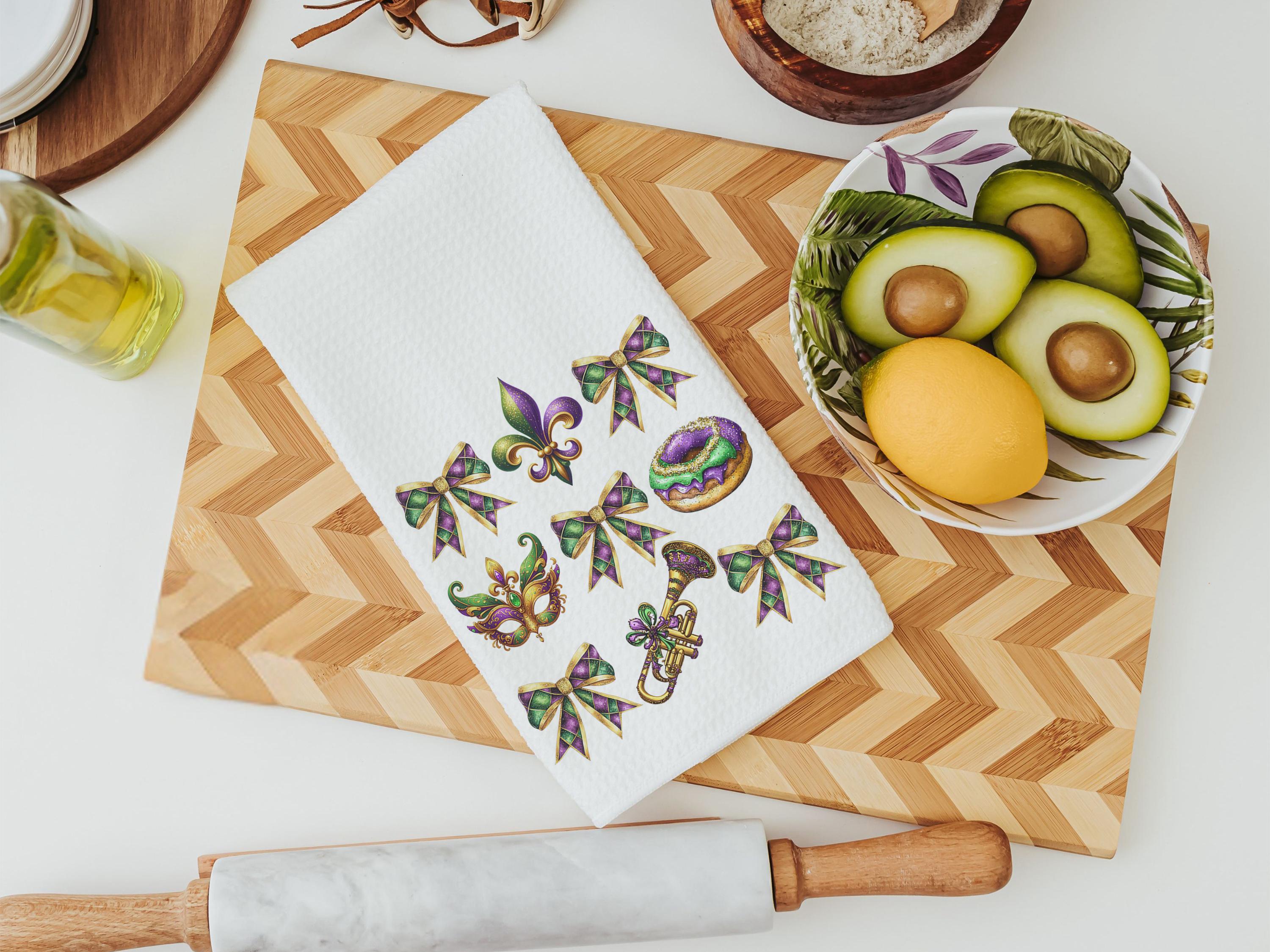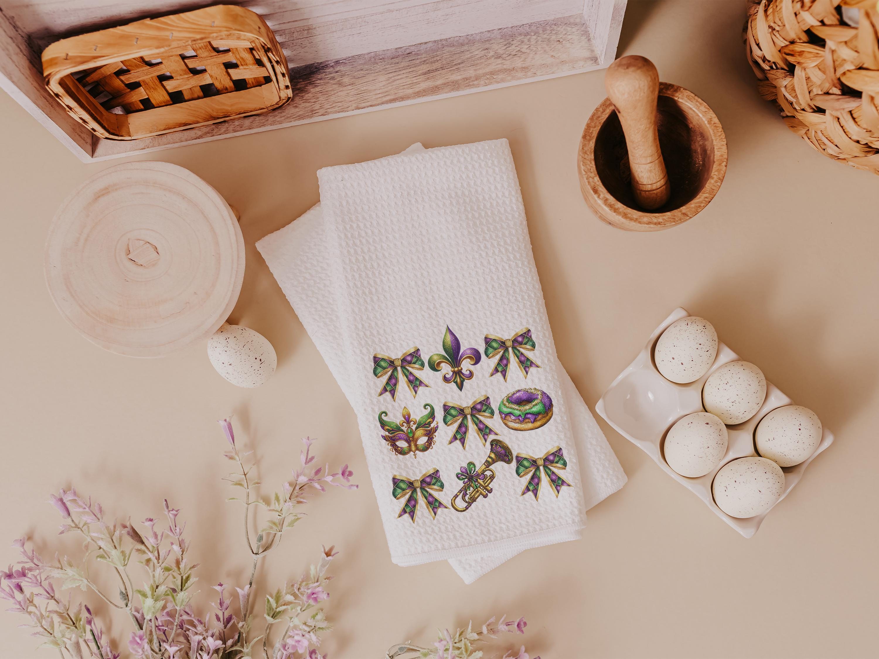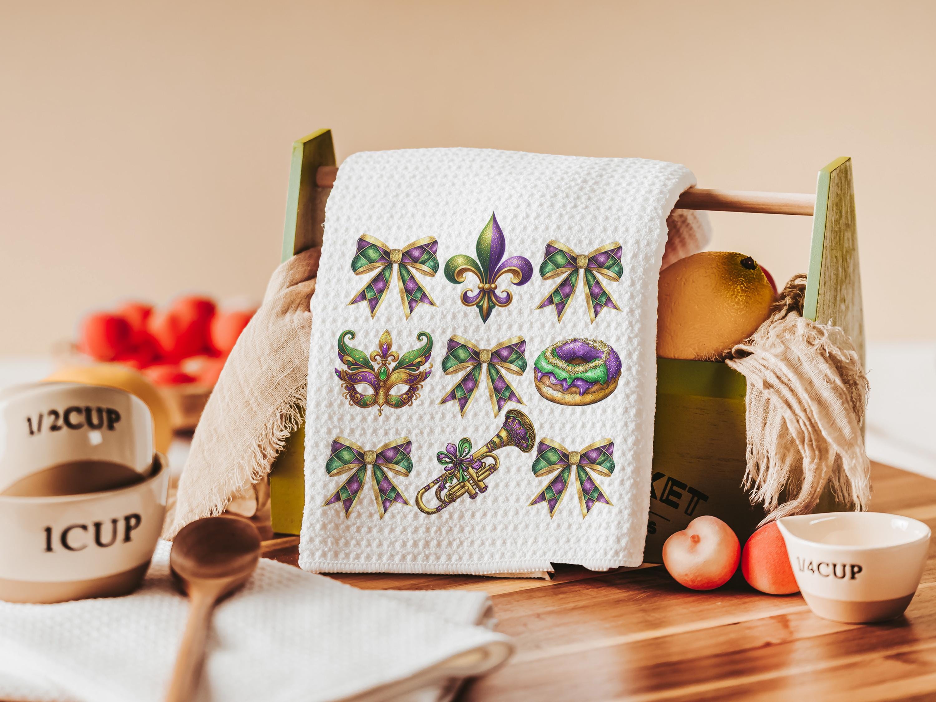 Mardi Gras kitchen towel for bakers, Fat Tuesday fleur de lis hand towels, king cake baker merch, New Orleans Louisiana gifts for women