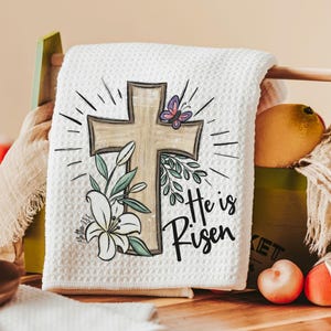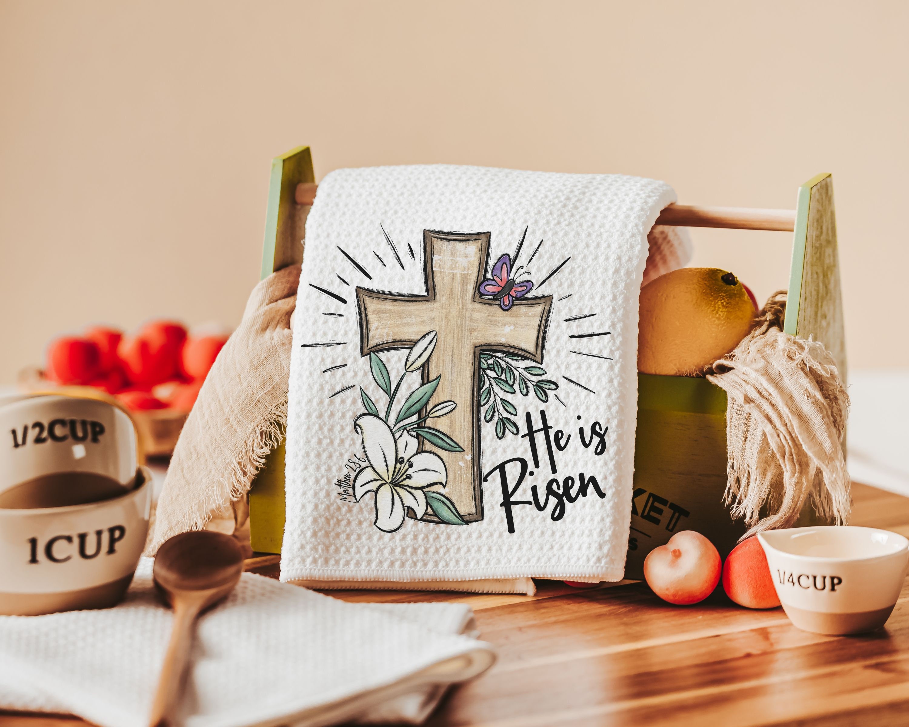 A meaningful Easter accent for a couch or living space, with a throw pillow and matching towels that carry the message throughout the home. He Is Risen Matthew 28:6 makes it a thoughtful Christian decor gift. A beautiful choice for a sister, Easter hostess gifting, or anyone who appreciates faith-centered Easter decor.