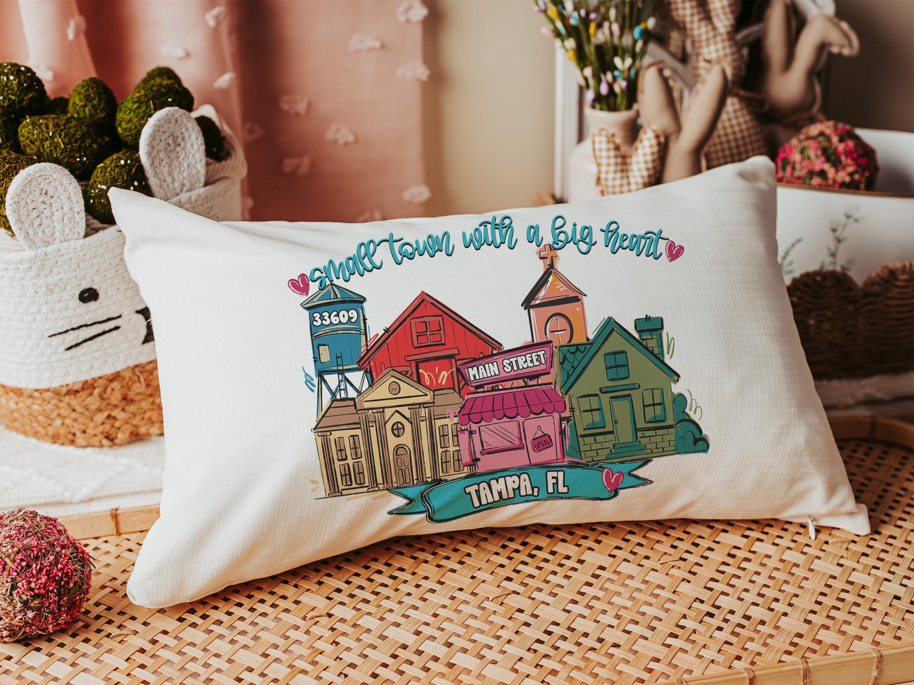 custom main street Valentine throw pillows 12 x 20, personalized small town big heart tea towel for couples, zip code home gift for in laws