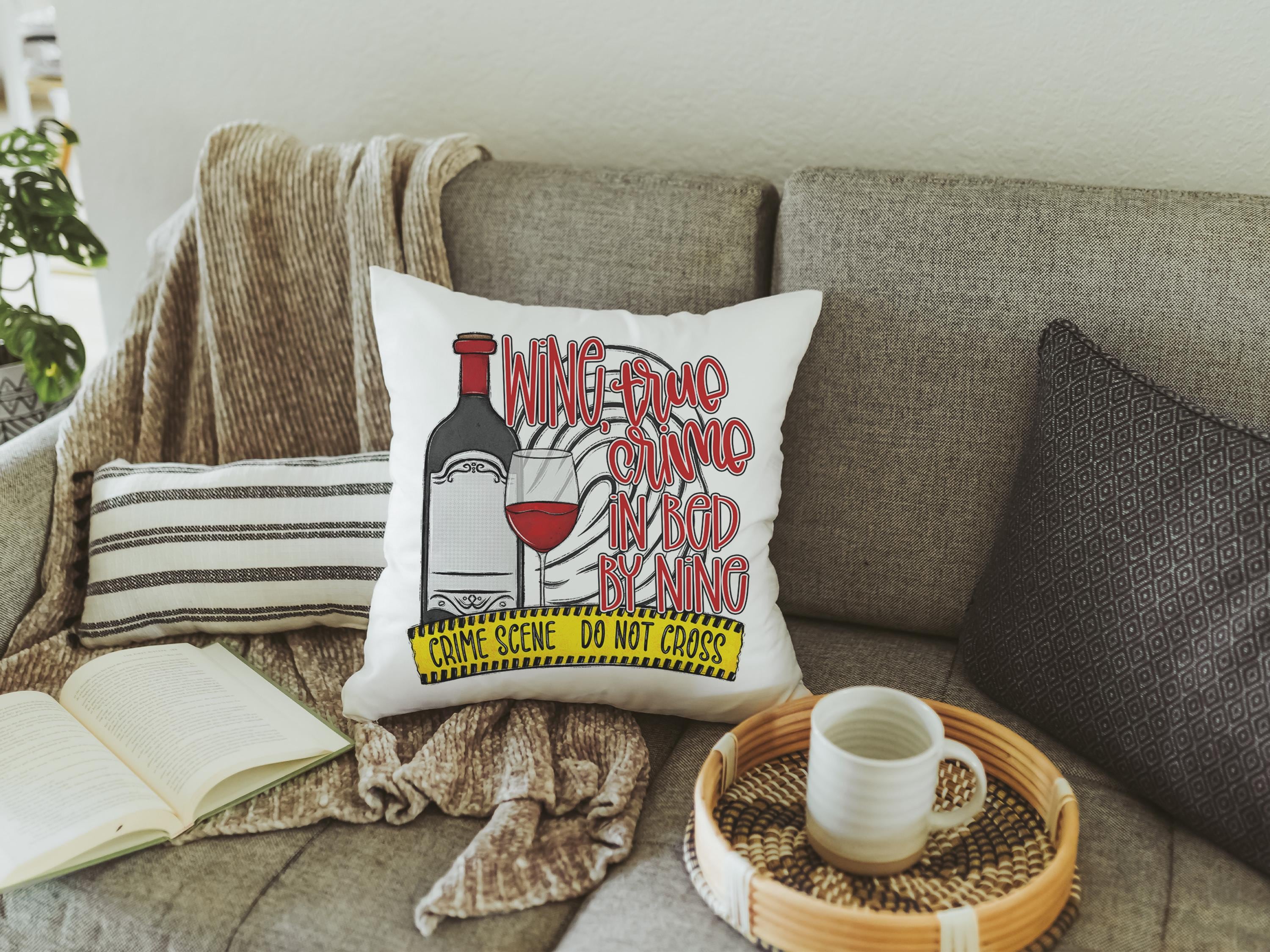 A fun update for the kitchen or guest bathroom, with towels and matching pillows that celebrate true crime humor. Wine, true crime, and in bed by 9 gives a serial killers vibe for an easygoing, relatable touch. A great gift for women or best friends who love cozy nights and crime stories.