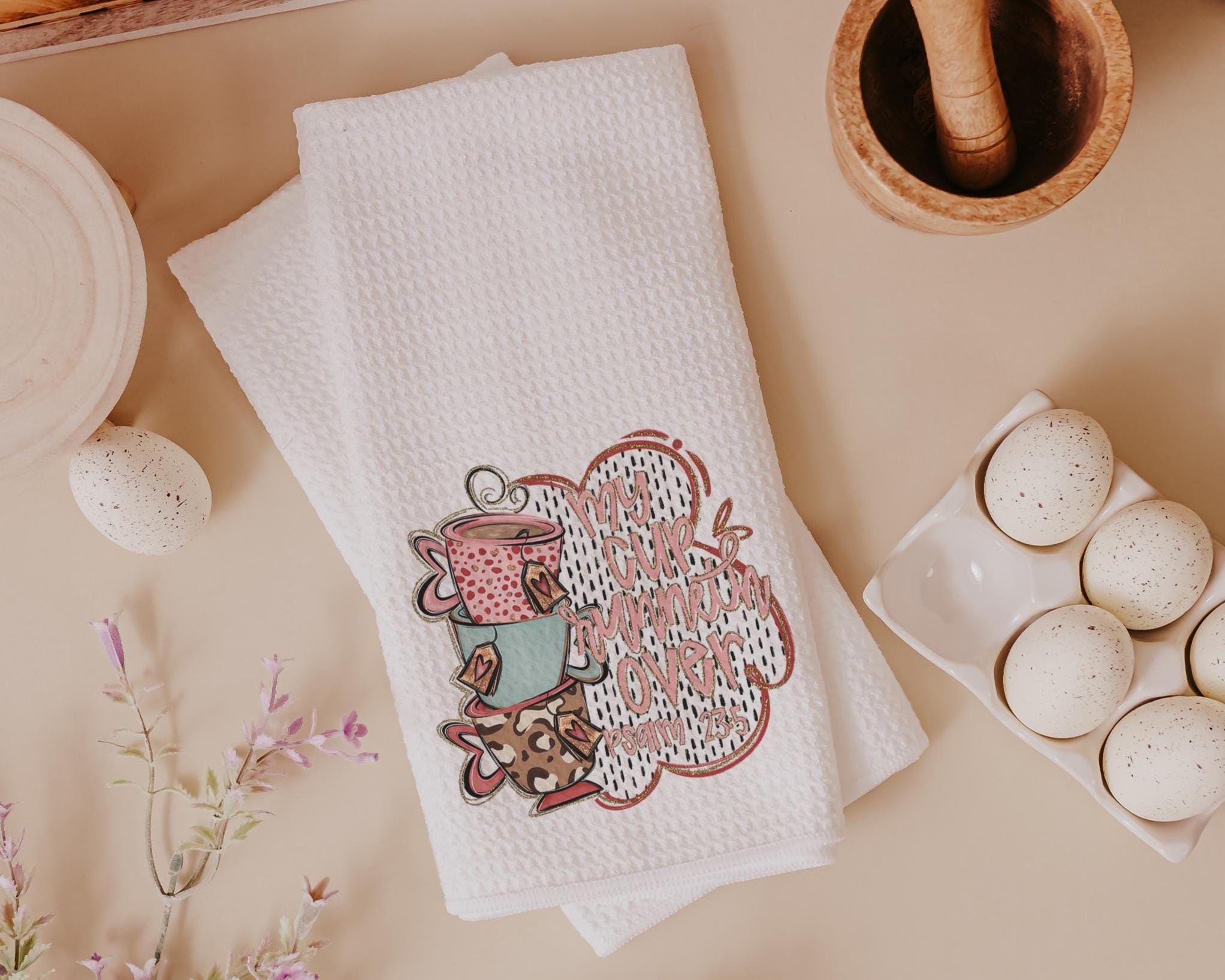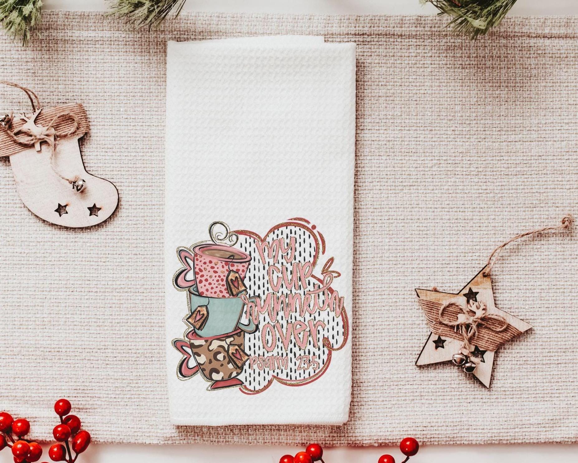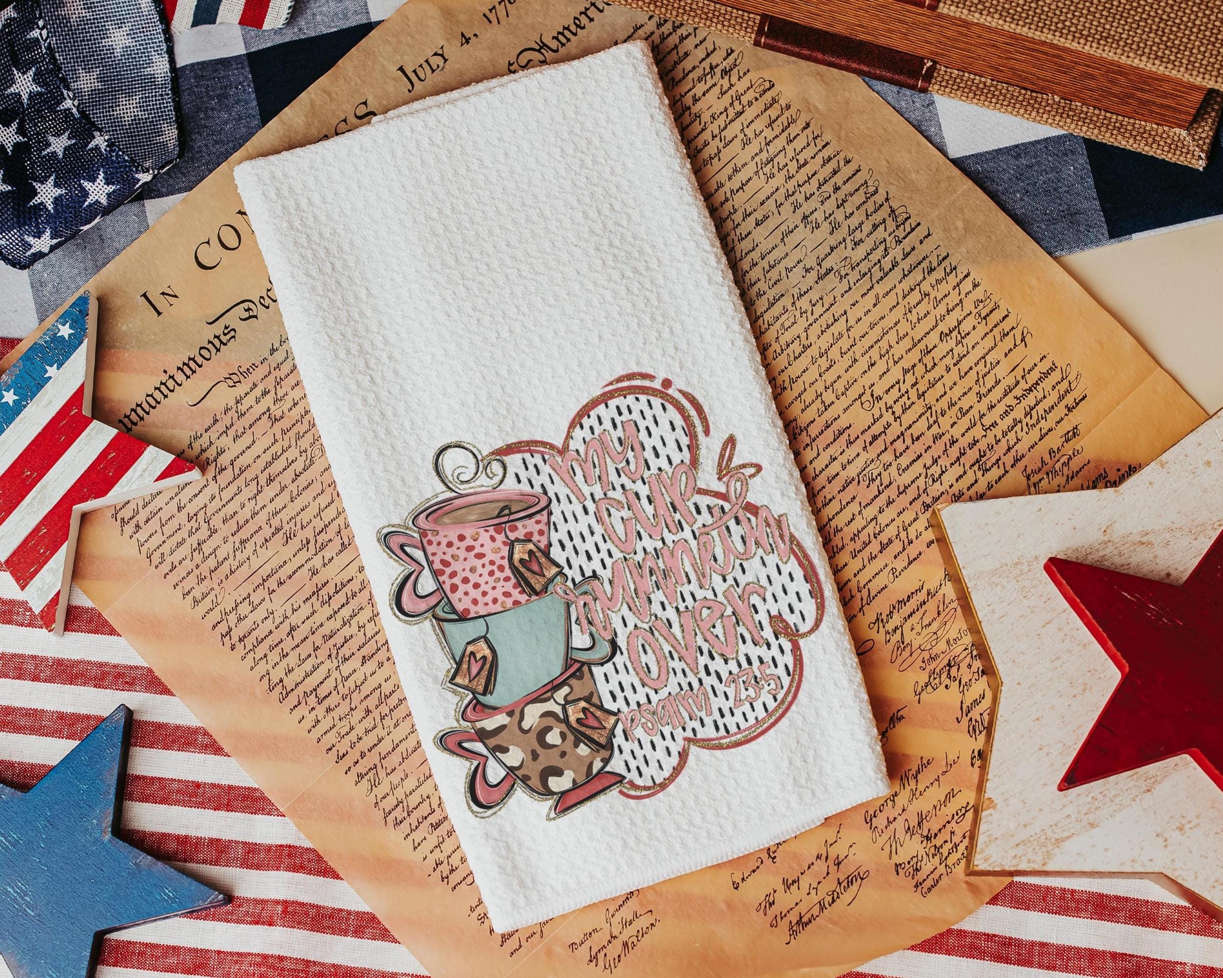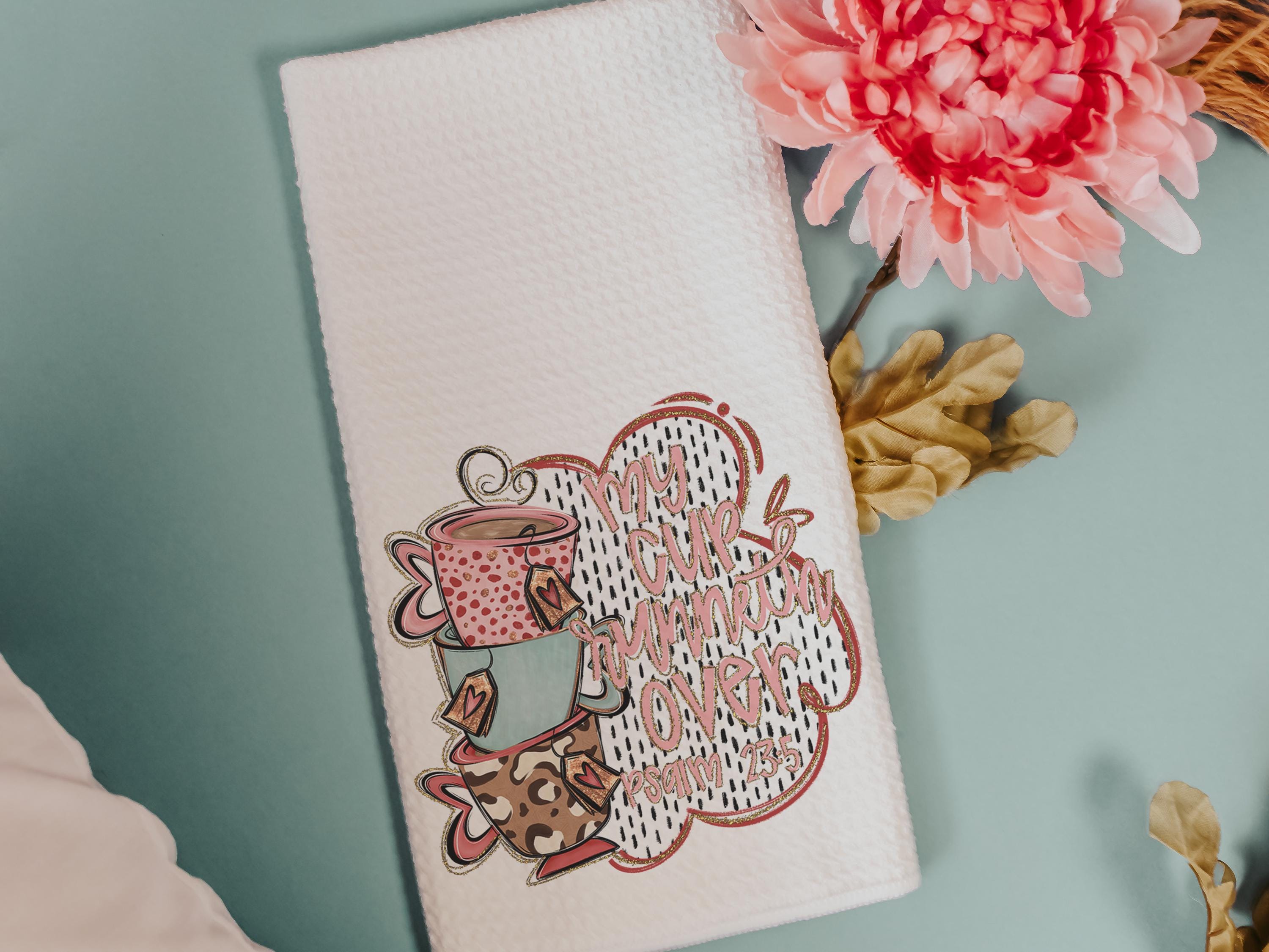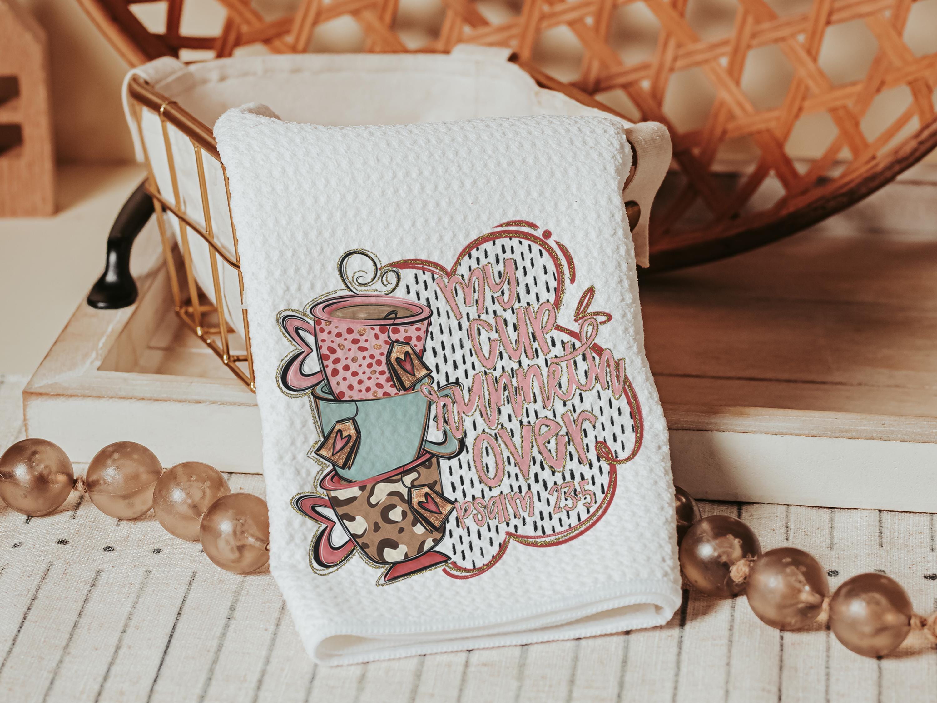My cup runneth over Bible verse kitchen towel, Psalm 23:5 scripture kitchen decor, Christian decor for home, faith gift for Mom, powder room