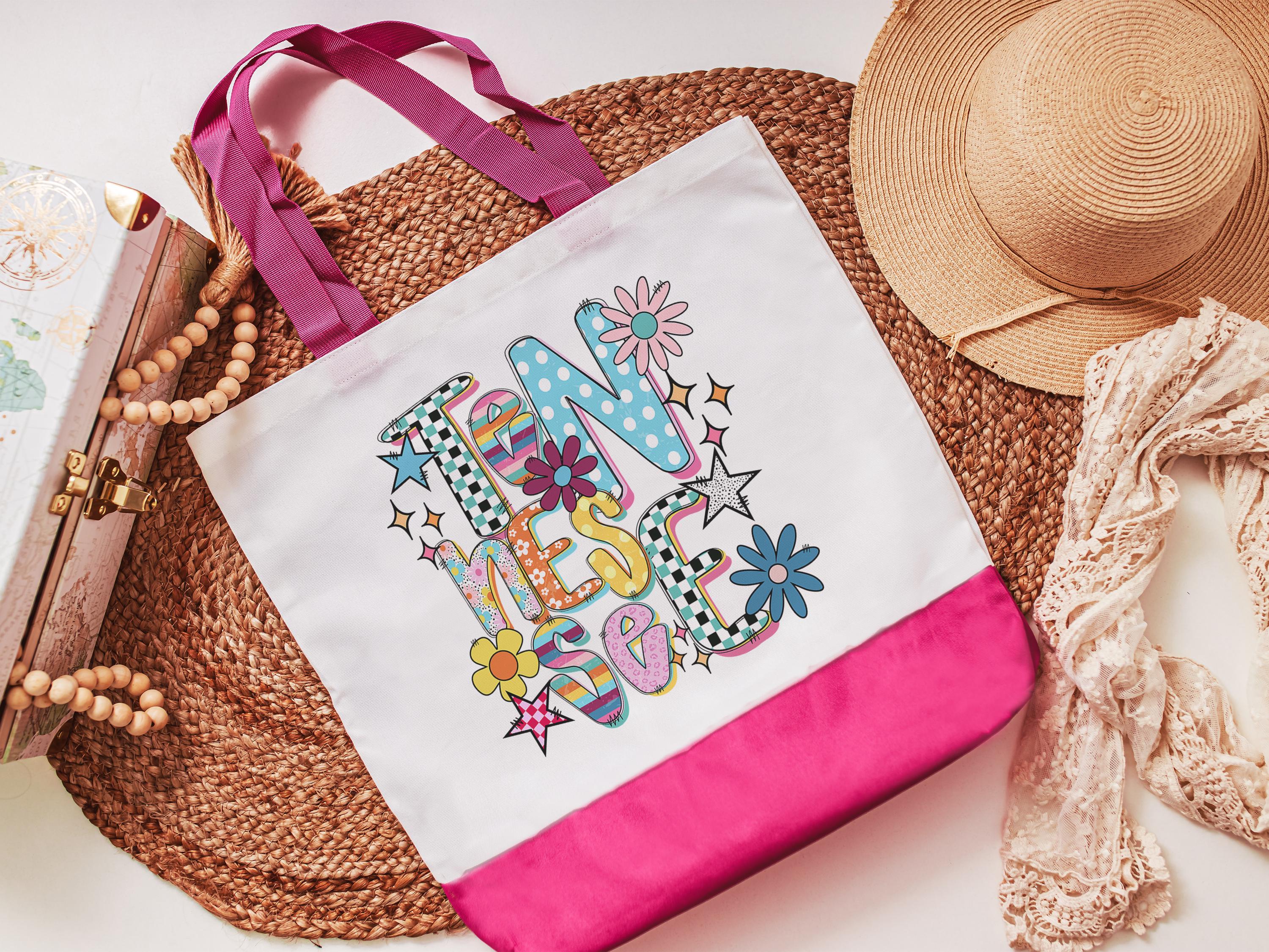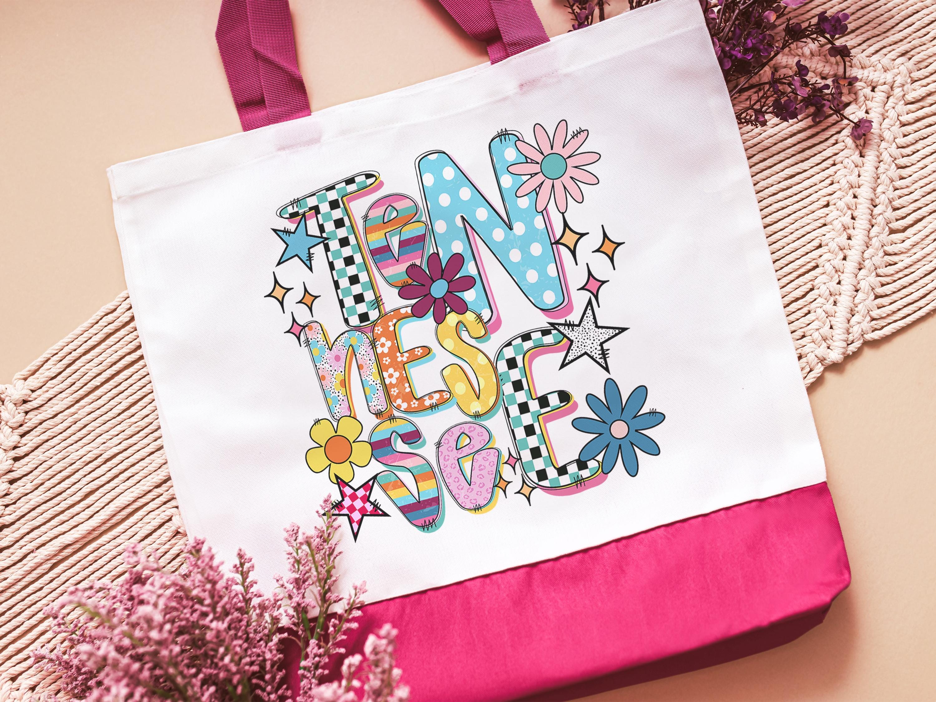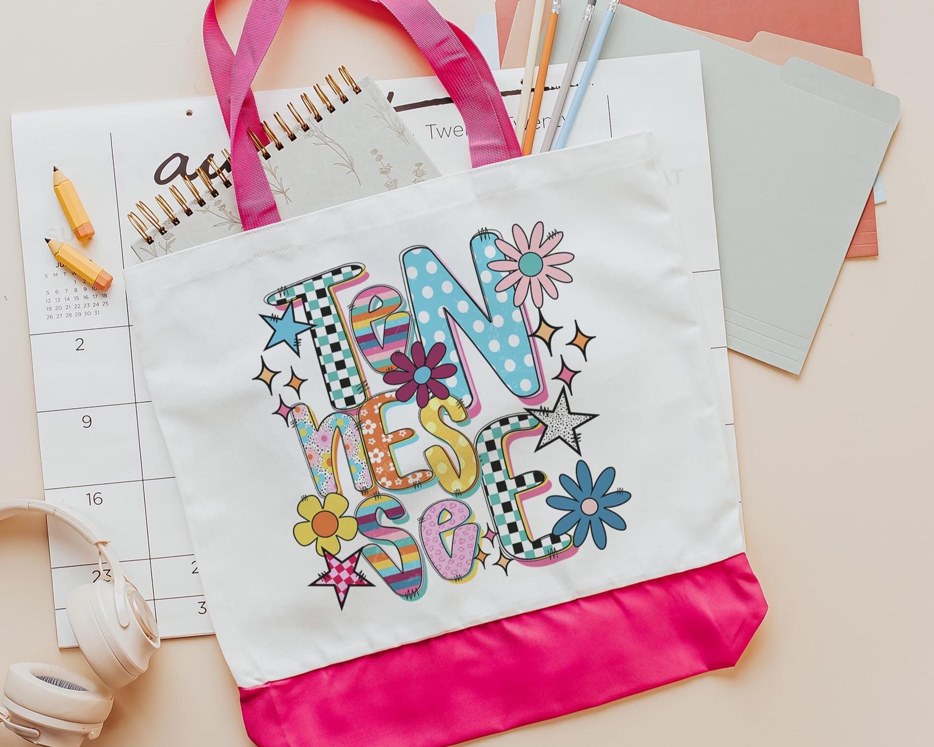 A fun everyday tote that works for school days, girls trips, or running errands, with a cute Nashville style. Checkered, rainbow stripe, and floral options make it a perfect pick for real estate agents or a cute Tennessee gift. A practical bag that fits work, travel, and daily use.