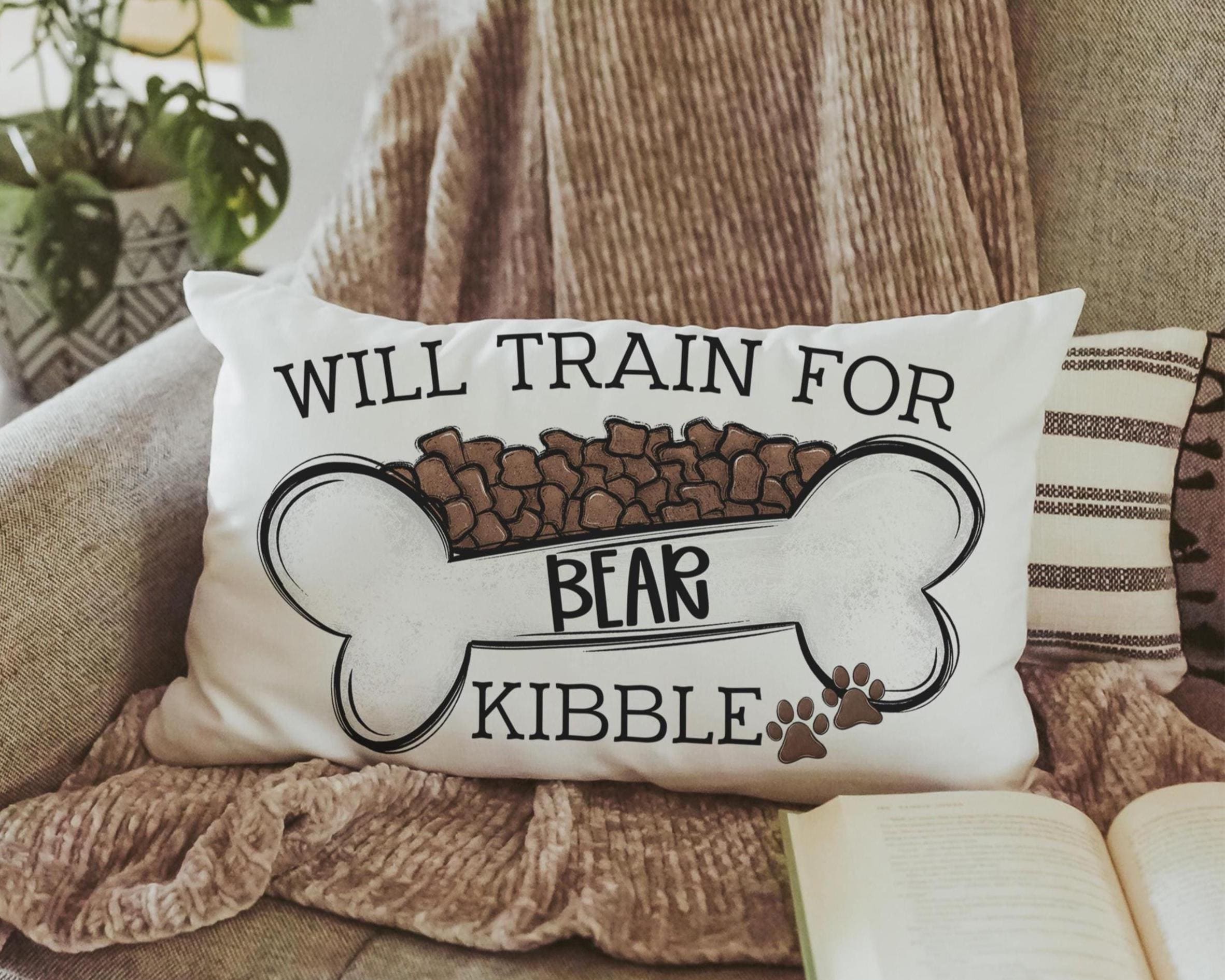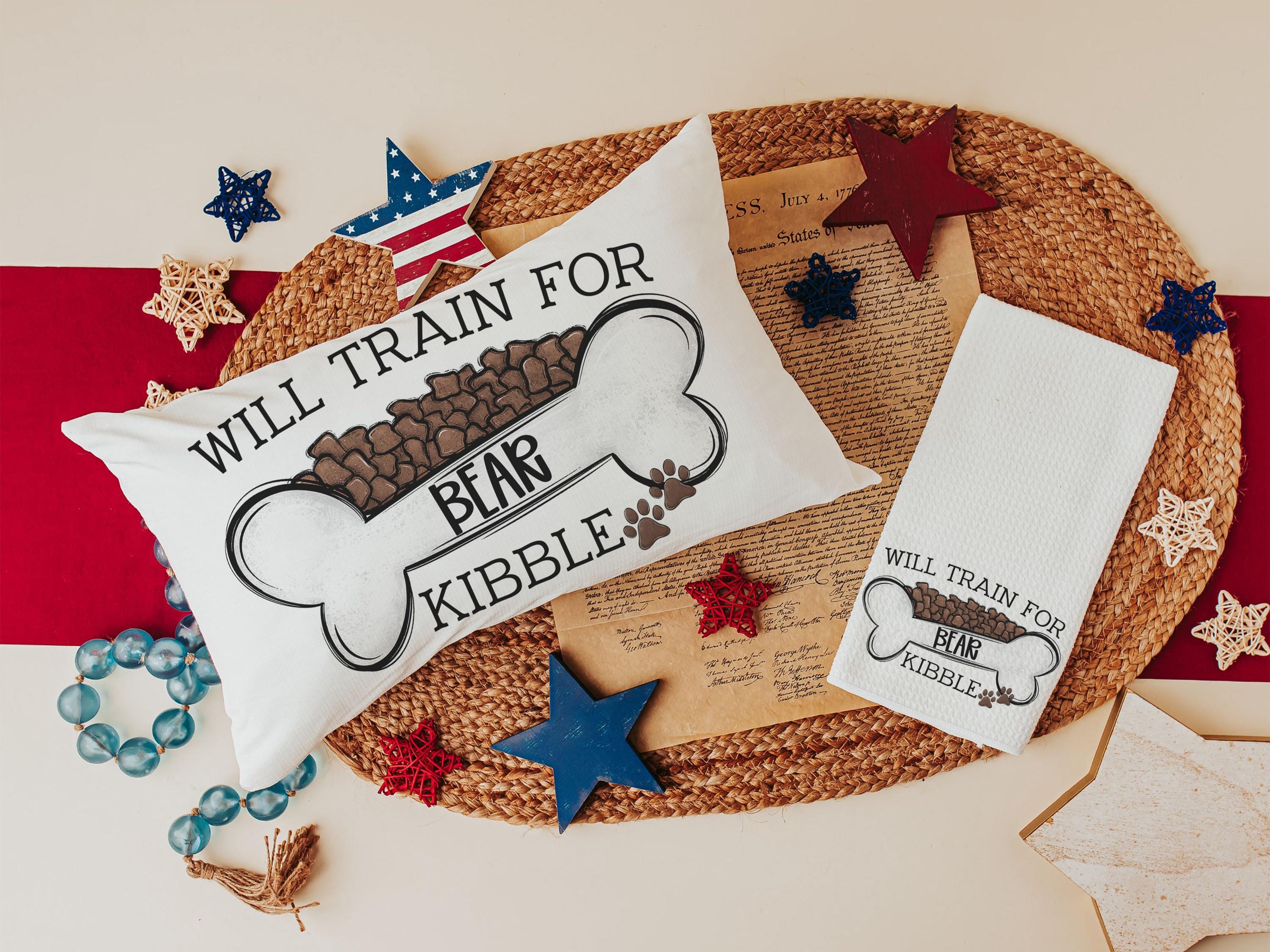 A fun, coordinated look for a sofa or kitchen, with a throw pillow and matching towels personalized for dog lovers. Will Train for Kibble adds humor while keeping the look fun. A sweet dog mom gift and a perfect way to bring dog decor into everyday home spaces.