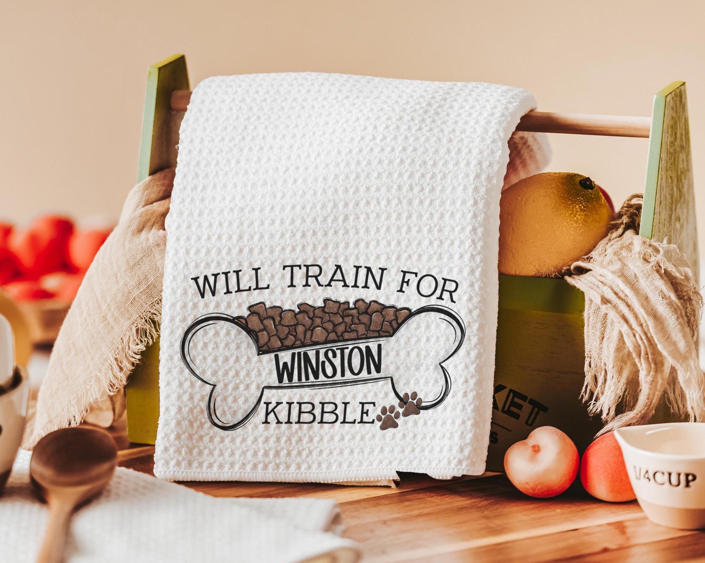 A fun, coordinated look for a sofa or kitchen, with a throw pillow and matching towels personalized for dog lovers. Will Train for Kibble adds humor while keeping the look fun. A sweet dog mom gift and a perfect way to bring dog decor into everyday home spaces.