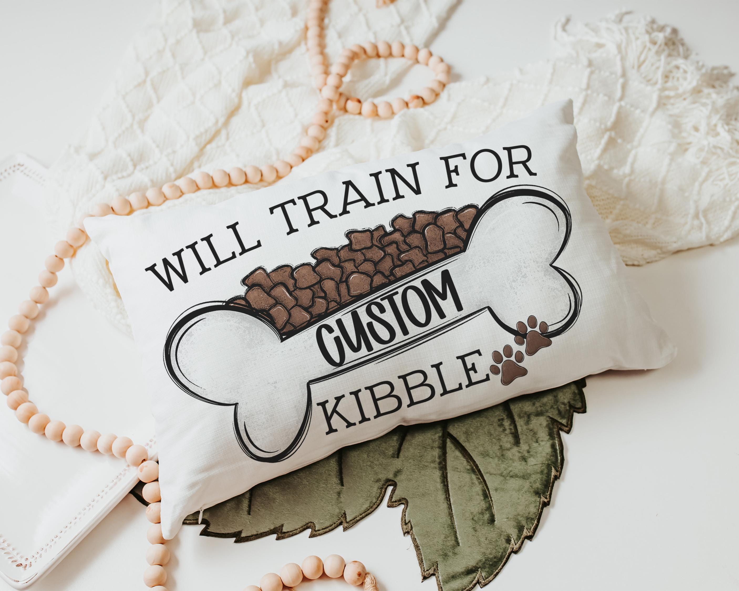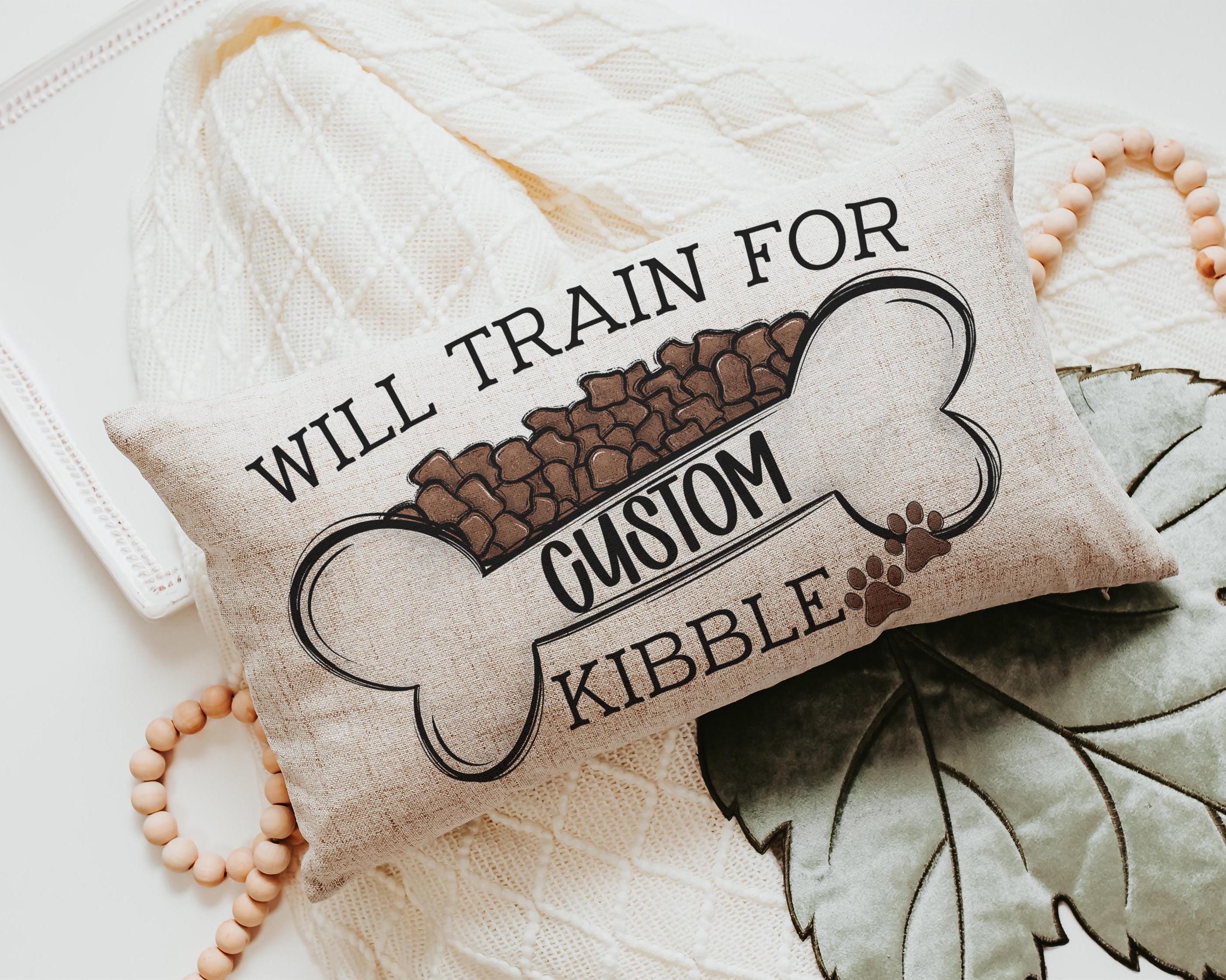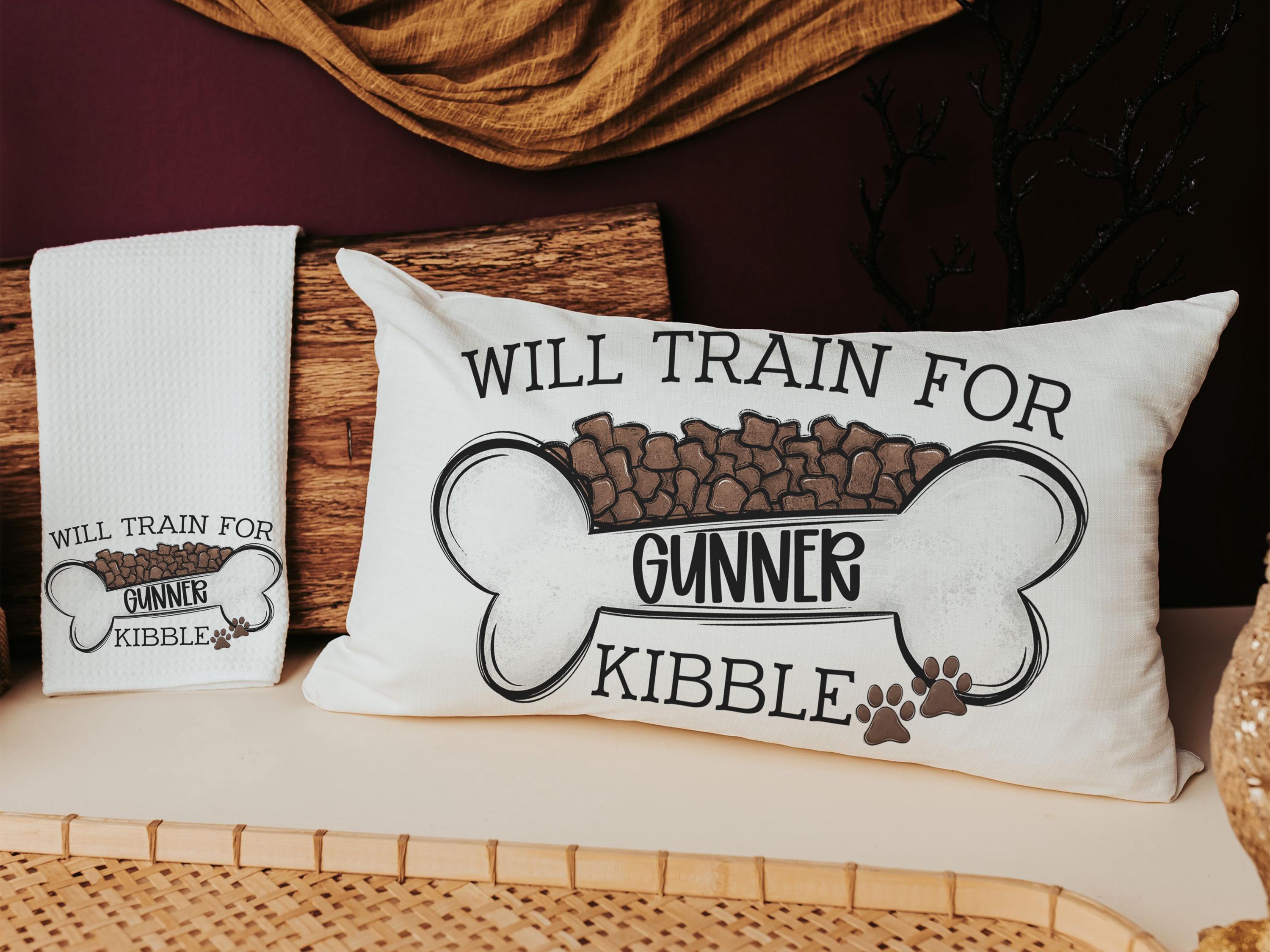 A personalized pillow for the bed paired with matching kitchen towels adds a fun dog touch to your home home. Will Train for Kibble works well for dog trainers, dog lovers, or gifting to women who enjoy cute, funny dog decor.