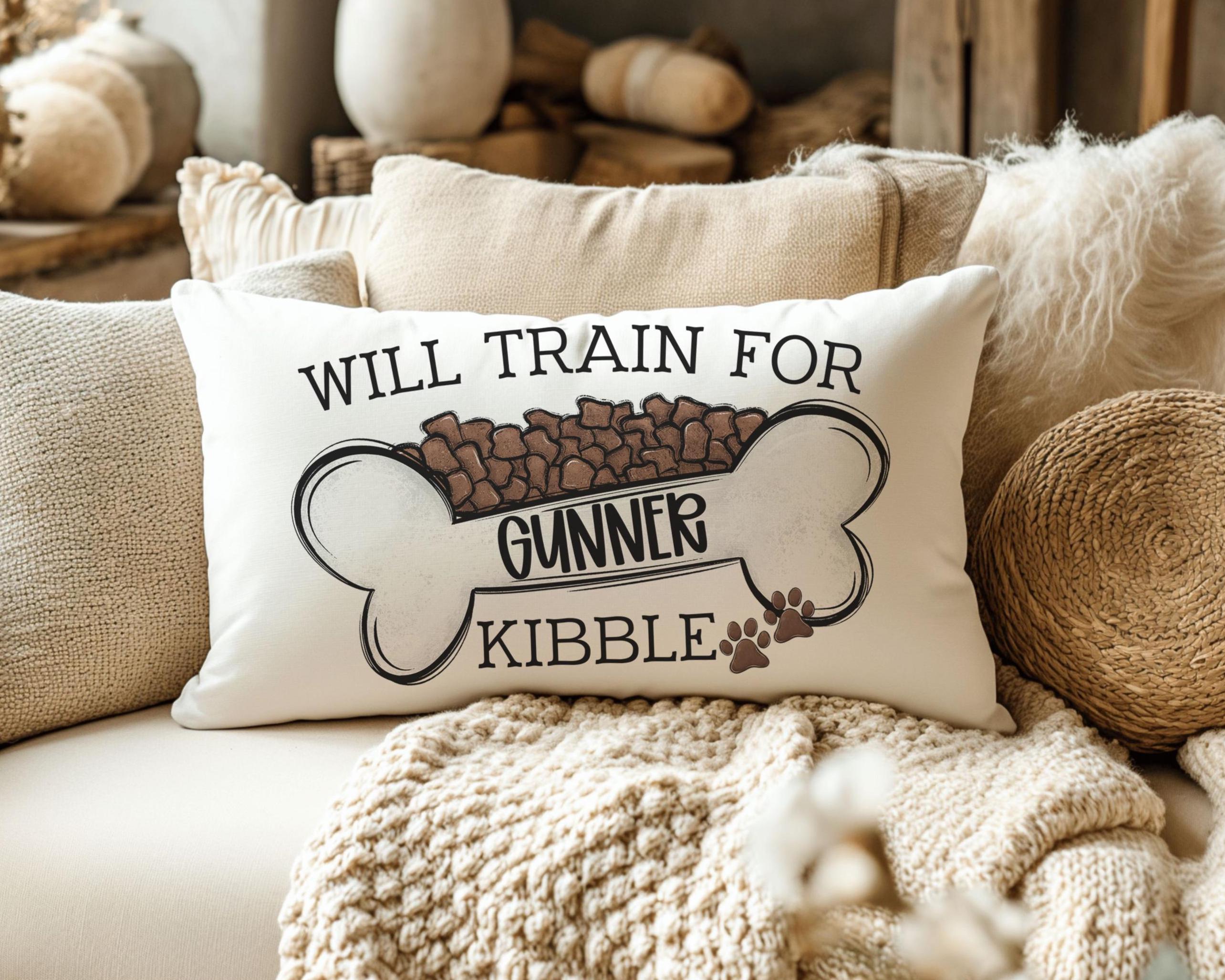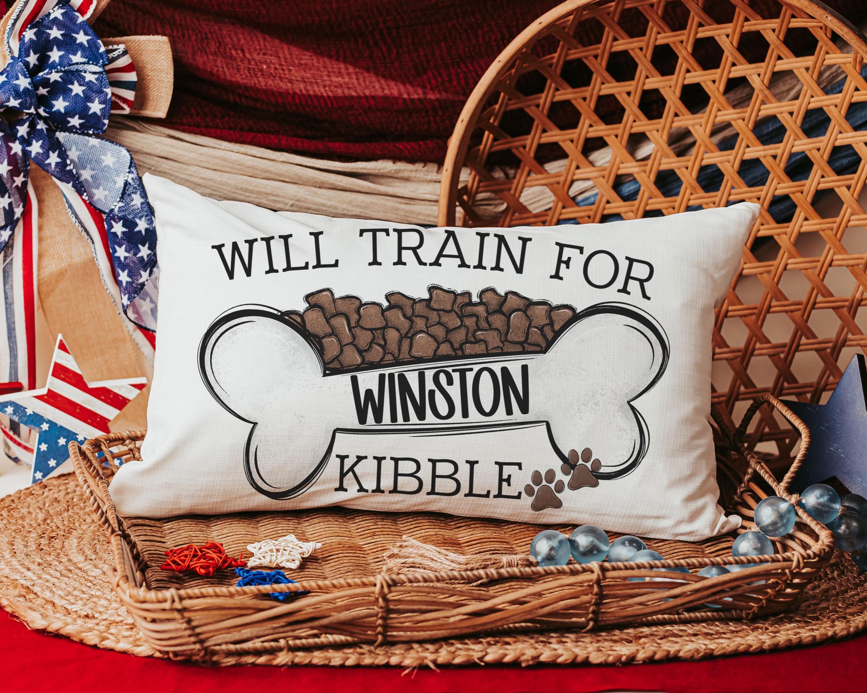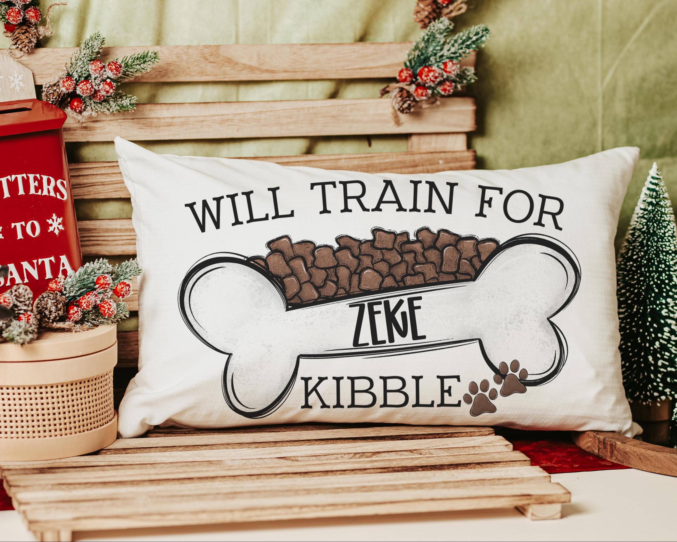 A personalized pillow for the bed paired with matching kitchen towels adds a fun dog touch to your home home. Will Train for Kibble works well for dog trainers, dog lovers, or gifting to women who enjoy cute, funny dog decor.