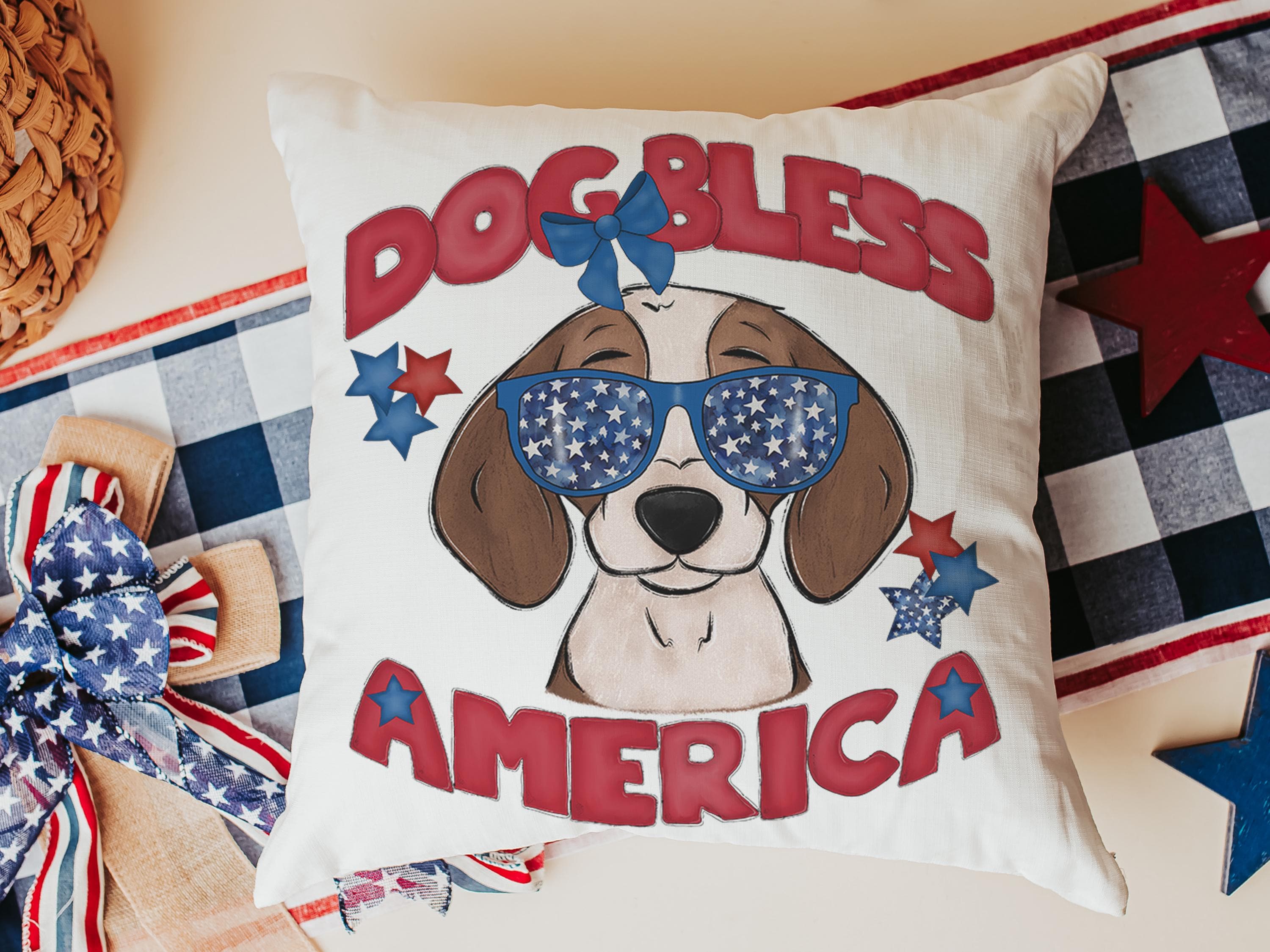 Dog Bless America beagle throw pillows and matching towels in red, white, and blue for patriotic dog decorations for any home. Available to purchase separately or as a set, making it a cute 4th of July choice for lake house decor, dog lovers, and beagle mom gifts.